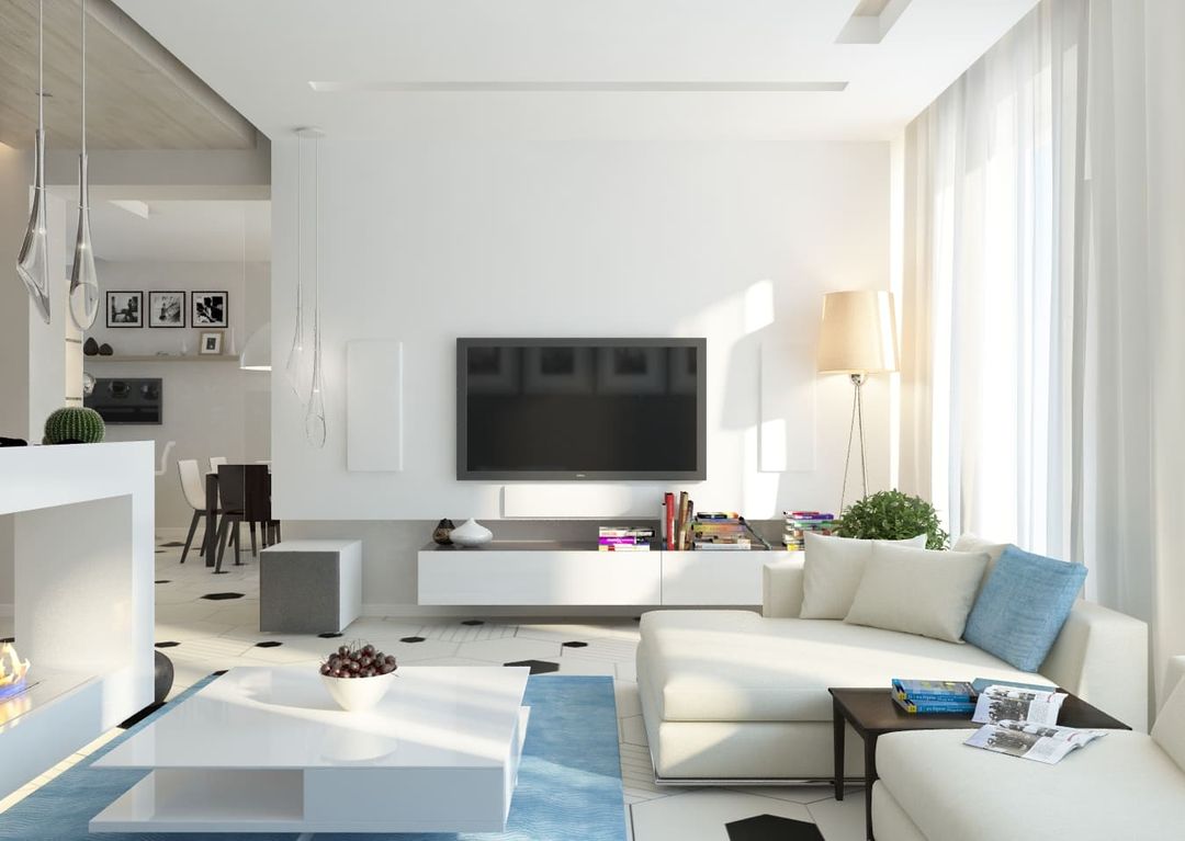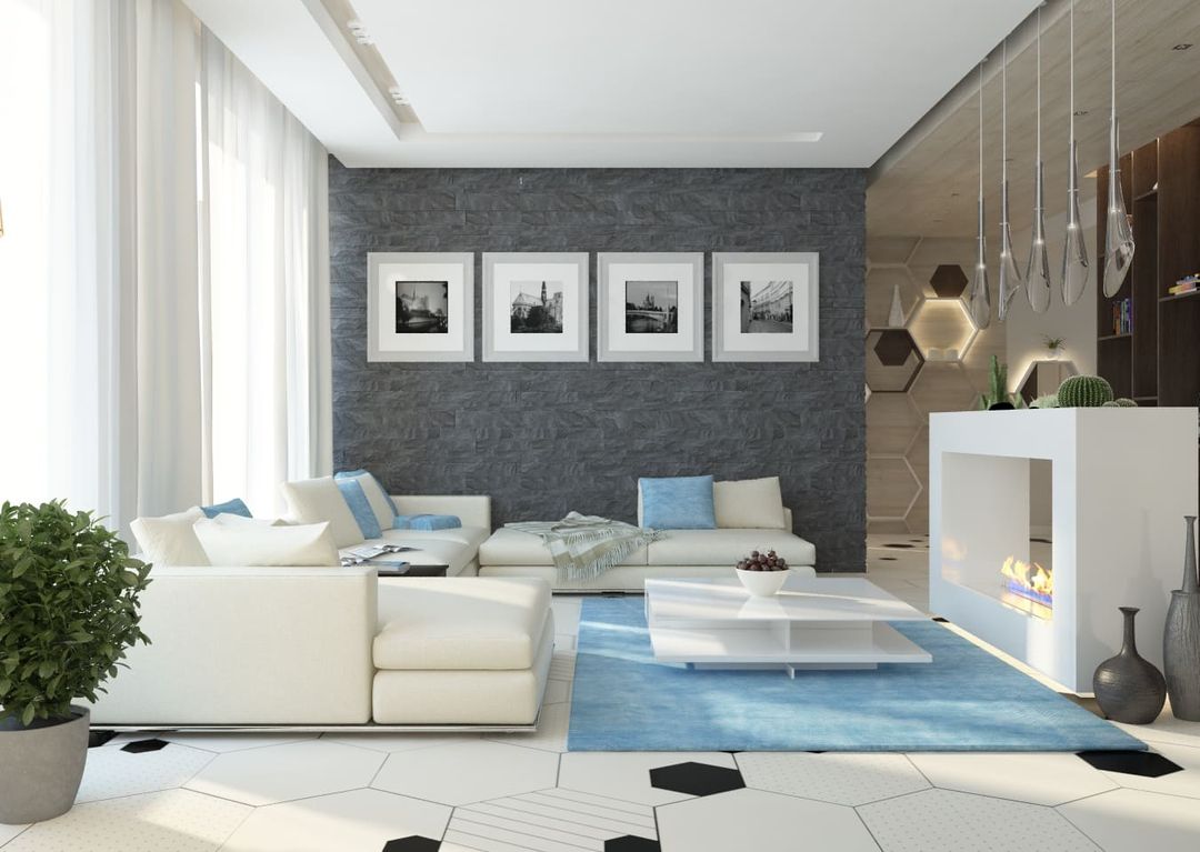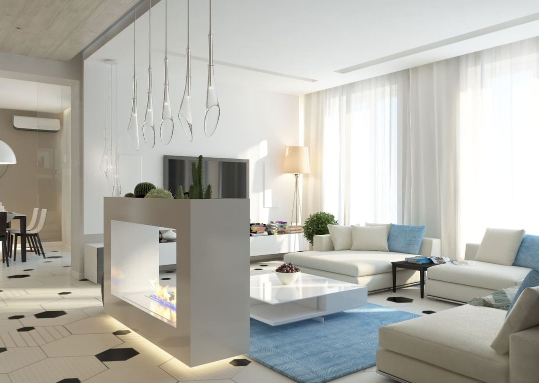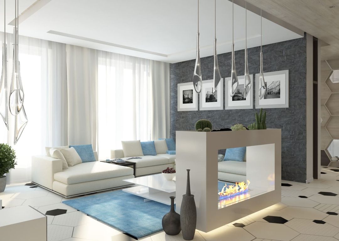 Центральная часть гостиной – биокамин. У него несколько функций: во-первых, это очаг с настоящим огнем. Во-вторых, камин отделяет гостиную от транзитной зоны между кухней и прихожей. Кроме того, конструкцию, в которую встроен камин, завершает ниша с растениями, подсвеченная сверху подвесными светильниками, — «кактусница».