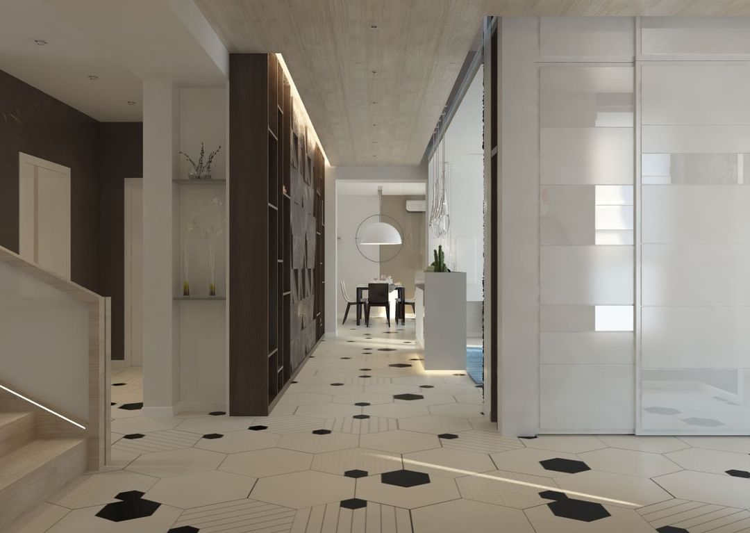 Помещения первого этажа объединяет итальянский керамогранит: шестигранники разного цвета, размера и рисунка создают необычную картину. В отделке стен использованы декоративные панели, натуральный сланец и декоративная краска разных цветов. Кухня максимально функциональна: это важно для семьи с двумя детьми. Большая столешница с варочной поверхностью и мойкой у окна, остров, раскладной стол, большое количество пеналов с бытовой техникой и местами хранения.