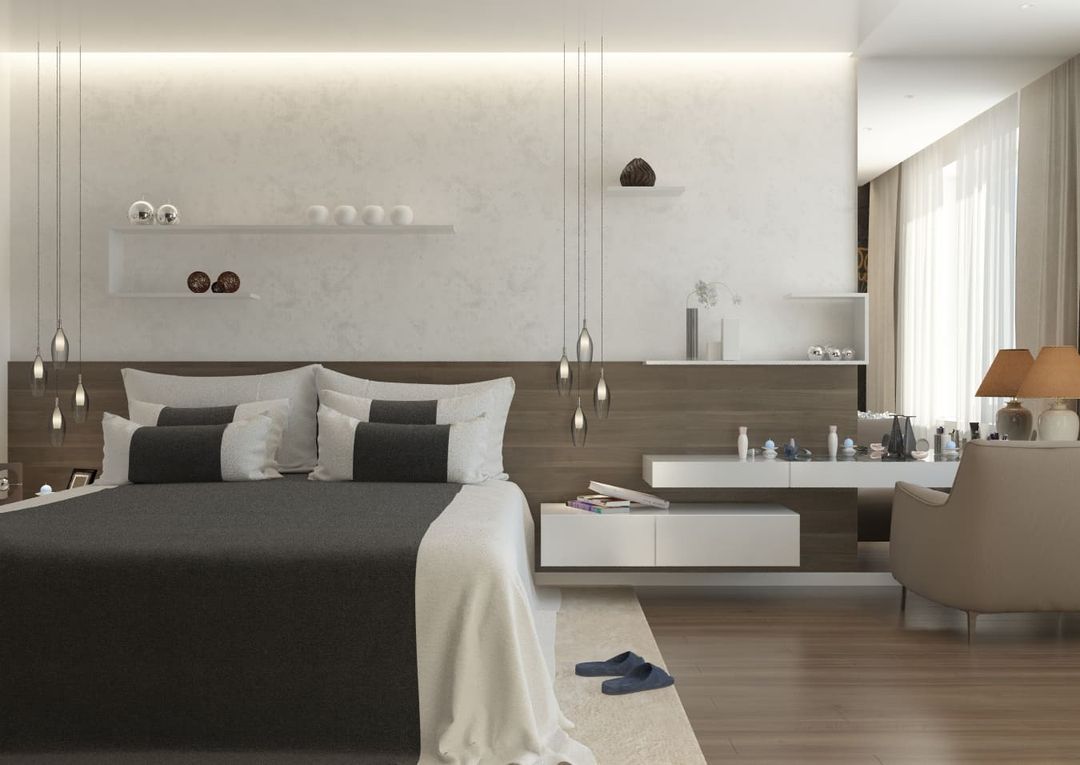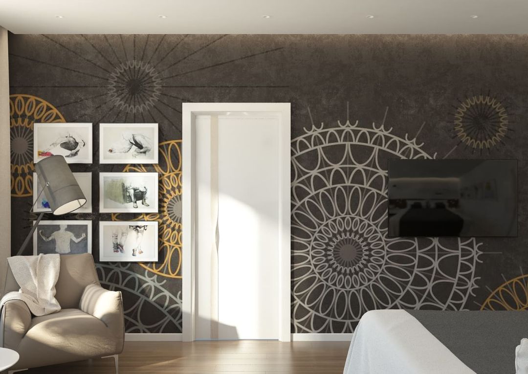 Спальня на втором этаже украшена настенным панно. Дверь между спальней и гардеробной в процессе реализации проекта заменена на стеклянную: это добавило комнате объема и света (в гардеробной тоже есть окно). П. С. Шутили с заказчиками, что рисунок напольного керамогранита отражает наступление футбольного чемпионата мира 2018 г. в России. Теперь они точно не забудут год чемпионата и год создания своего дома.