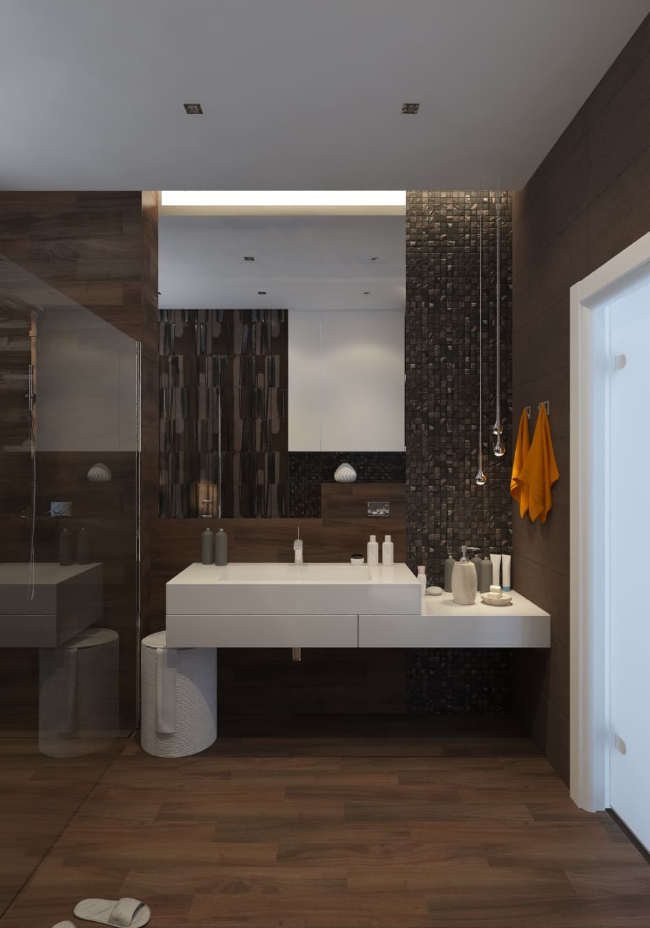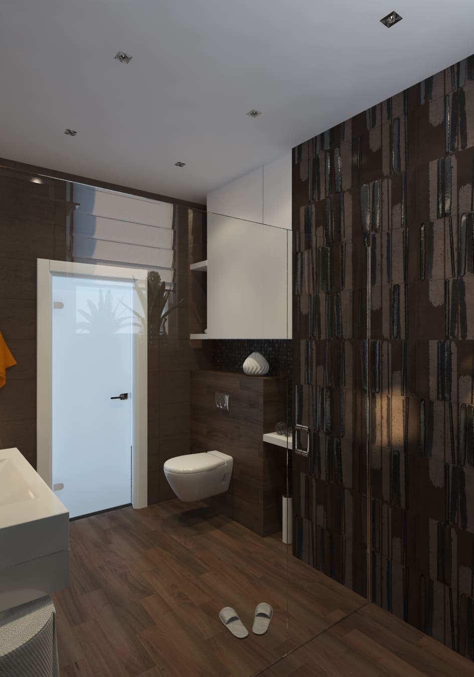 В отделке гостевого санузла использованы текстуры дерева, мозаика и декоры итальянской фабрики Fap Ceramiche. Просторный санузел с естественным освещением вмещает большую душевую зону, места хранения над инсталляцией и консольную столешницу, для крепления которой мы специально разработали металлический каркас.