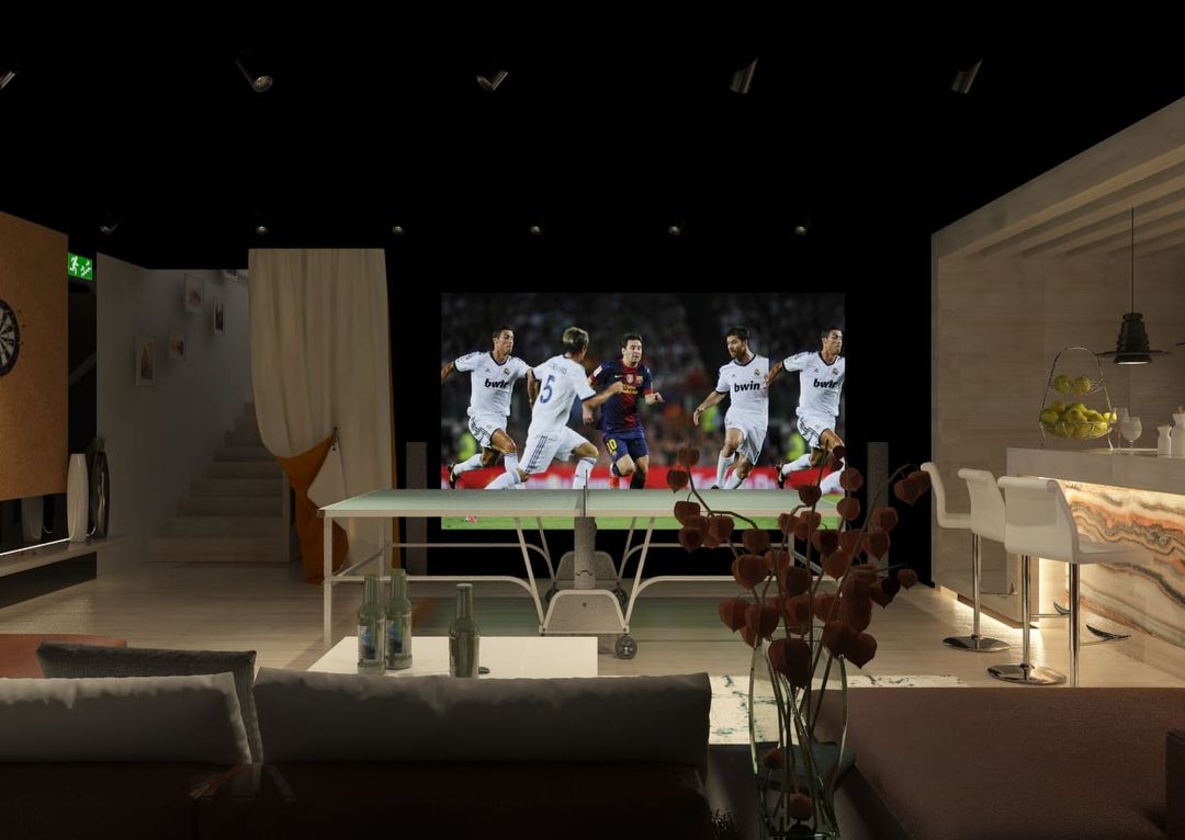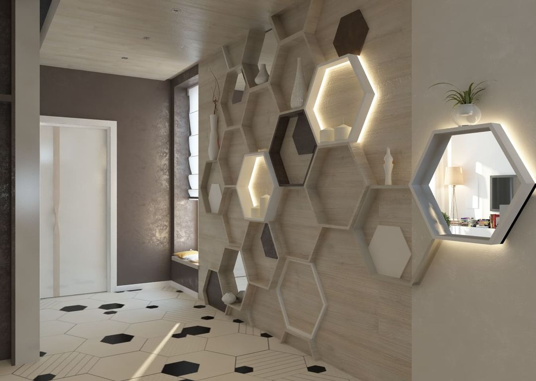 Часть потолка гостиной и прихожей отделана деревом, что добавляет помещению теплоты и уюта. При входе в дом устроен тамбур, за ним — прихожая, где мы организовали большие шкафы для хранения всего необходимого. Стена прихожей — декоративные полки разной глубины в форме разноцветных шестигранников, некоторые с зеркалом и подсветкой — продолжает «тему футбола».