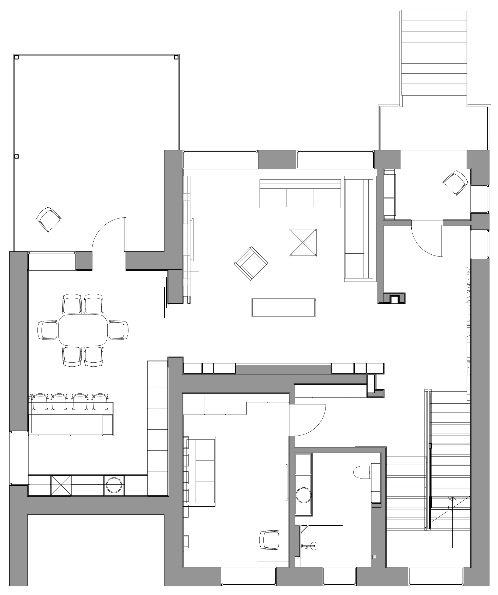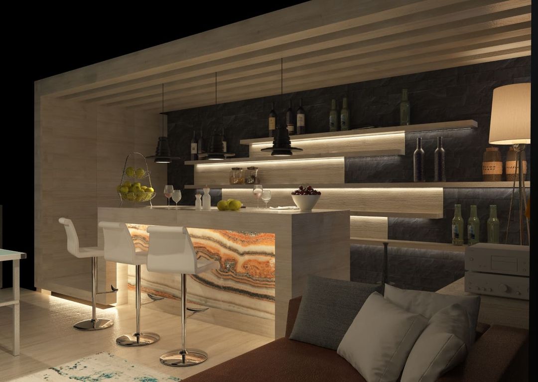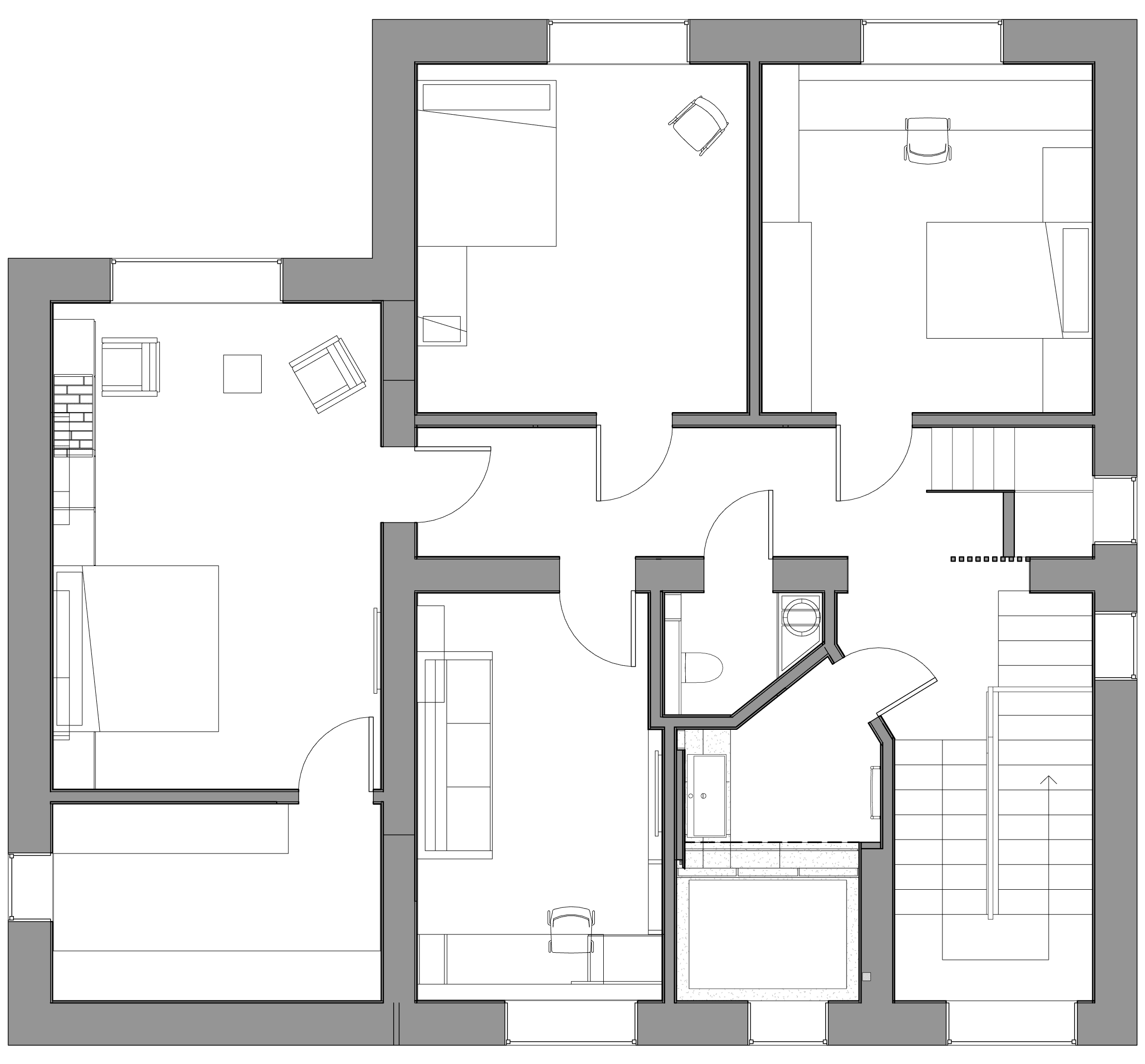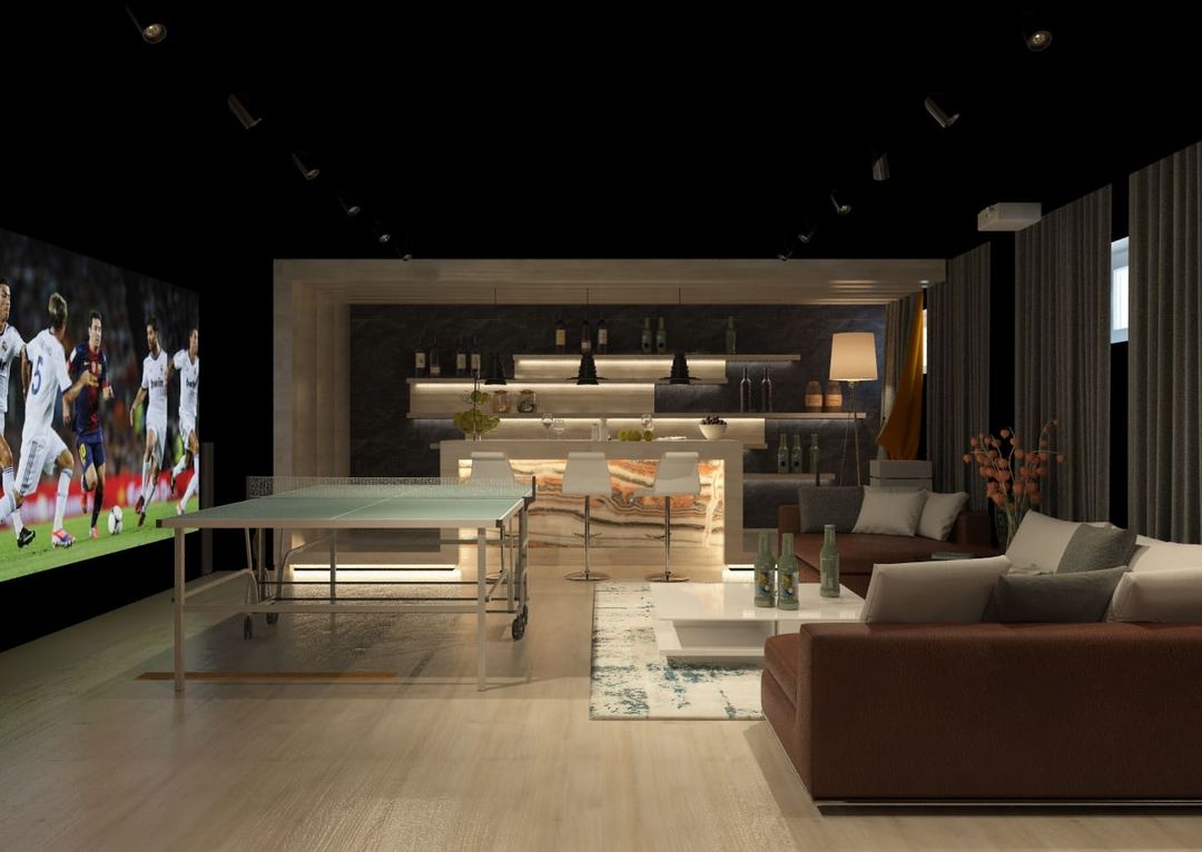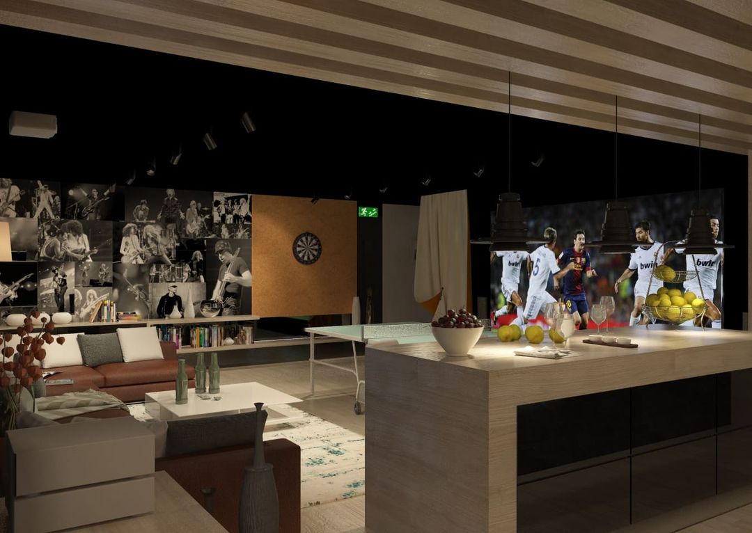 Дизайн-проект «Алфавит» реализован для трехэтажного дома с подвалом площадью около 400 м2. На первом этаже расположены кухня, гостиная, гостевой санузел и гостевая комната. Второй этаж – приватный: здесь размещены две детские, спальня, ванная и санузел. Подвал – центр семейного отдыха: раскладной стол для настольного тенниса, домашний кинотеатр, а одна из стен украшена панно с героями любимых фильмов. Мансарда — место, где можно собираться большими компаниями.