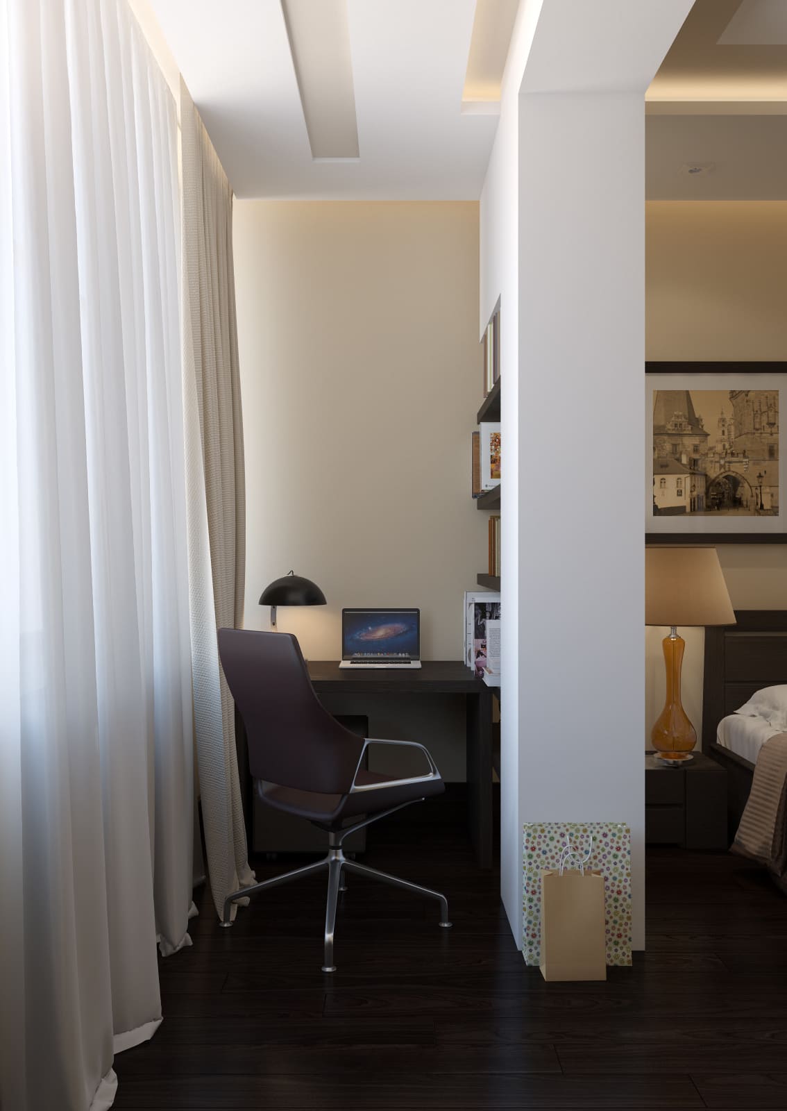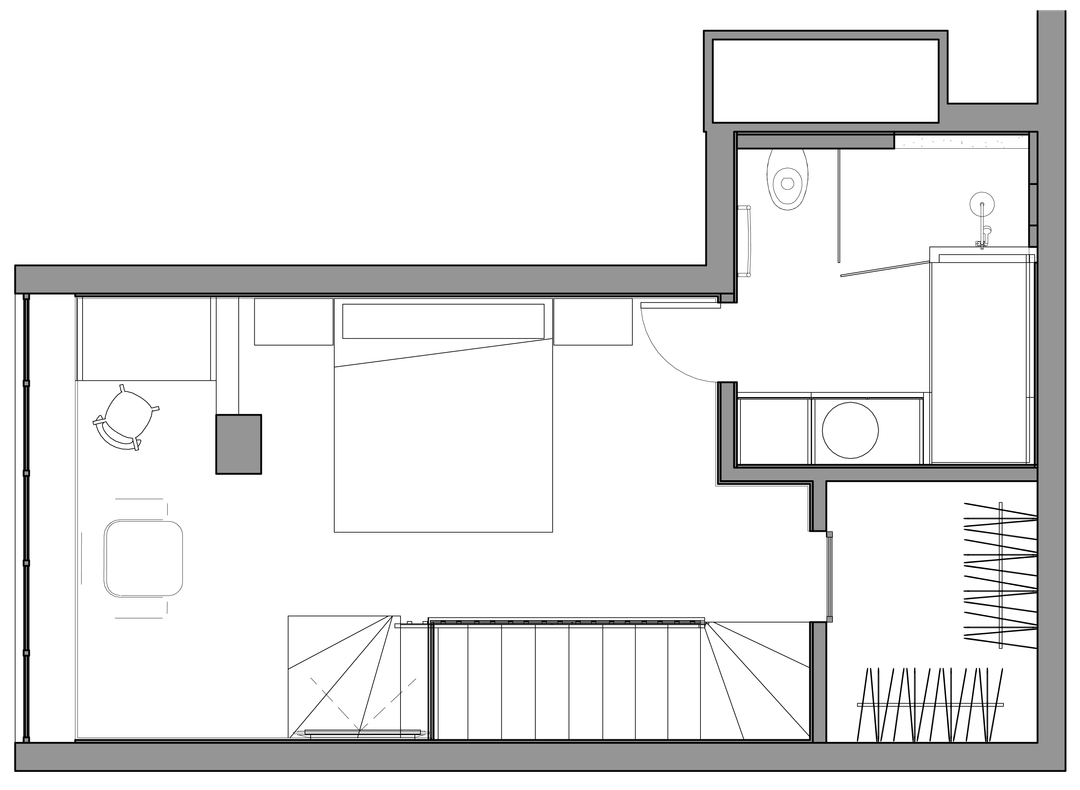 В результате первый этаж был отдан под кухню-гостиную, прихожую и гостевой санузел. Второй уровень – это одна общая зона, от которой стенами отделена только ванная комната. Помимо санузла тут расположена спальня и рабочее место. Квартира предназначена для одного человека, поэтому мы не стали закрывать лестничный холл перегородками.