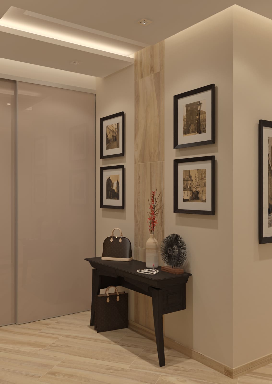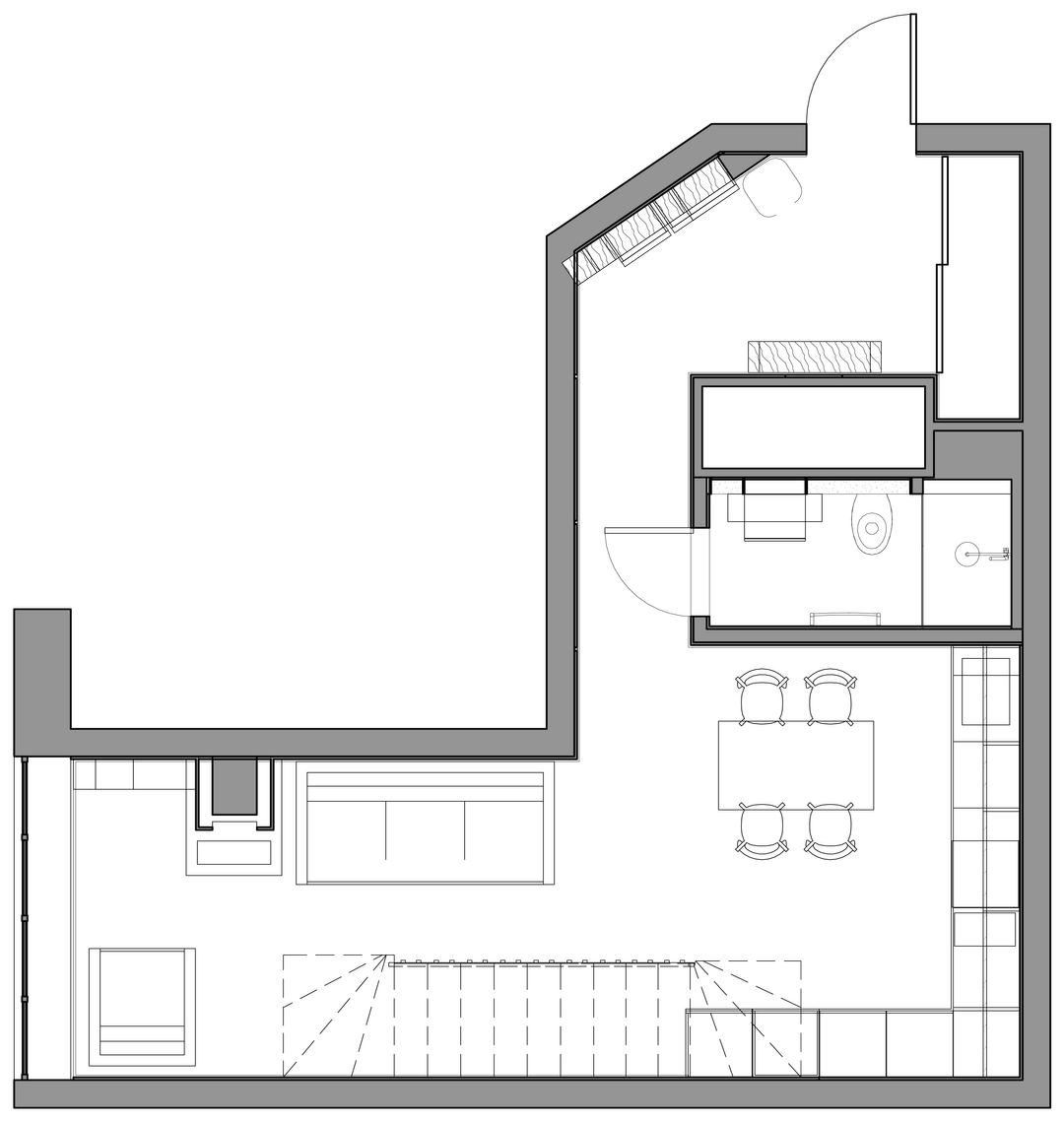 Квартира площадью около 70м2 находится на последнем этаже высотного дома с прекрасным видом на город. Название отчасти отражает ситуацию, в которой мы оказались в начале работы над этим проектом. Небольшая площадь каждого этажа, обилие несущих конструкций и не очень удачное расположение лестничного проёма ограничили наши возможности по изменению пространства.