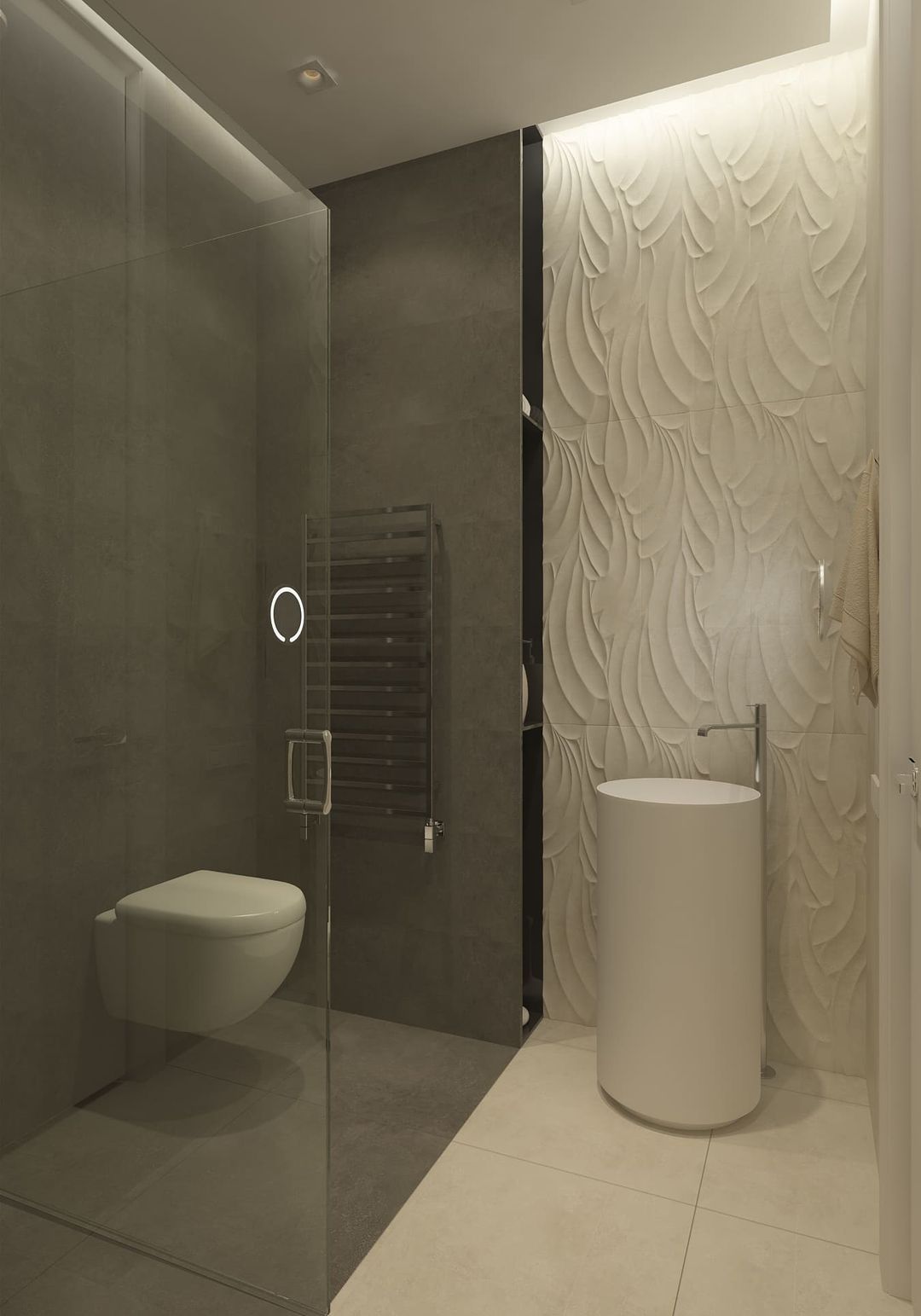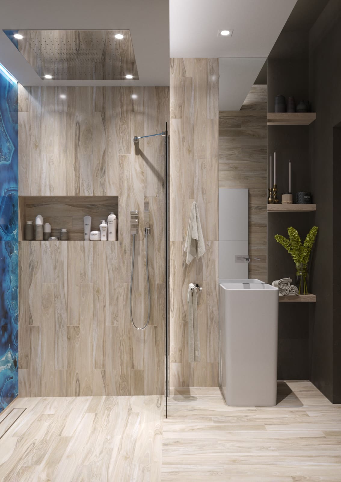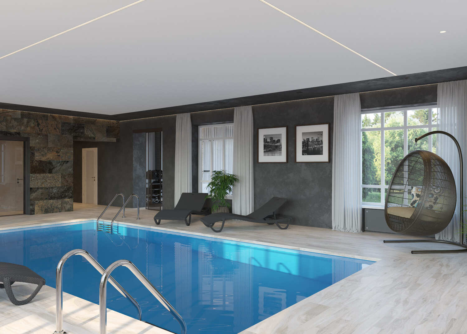 В отделке бассейна и спортзала использован керамогранит с текстурой дерева и мозаика из натурального сланца. Такое сочетание материалов выгодно контрастирует с водой и делает интерьер интереснее.