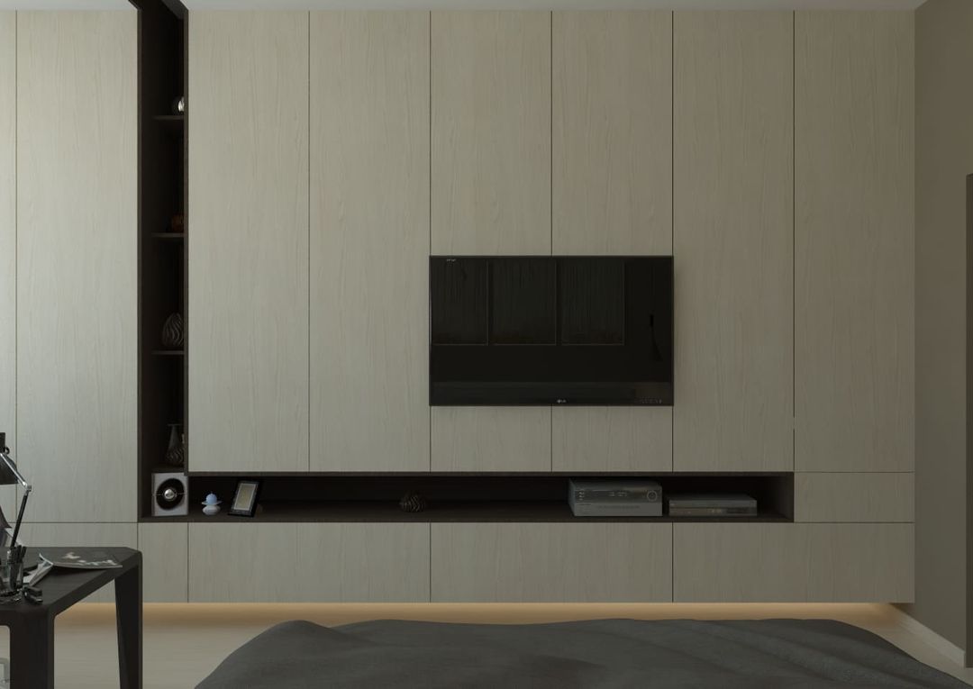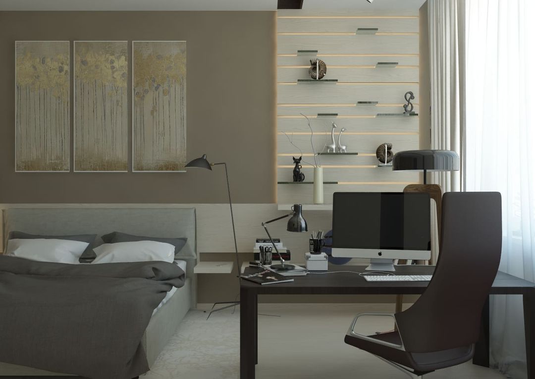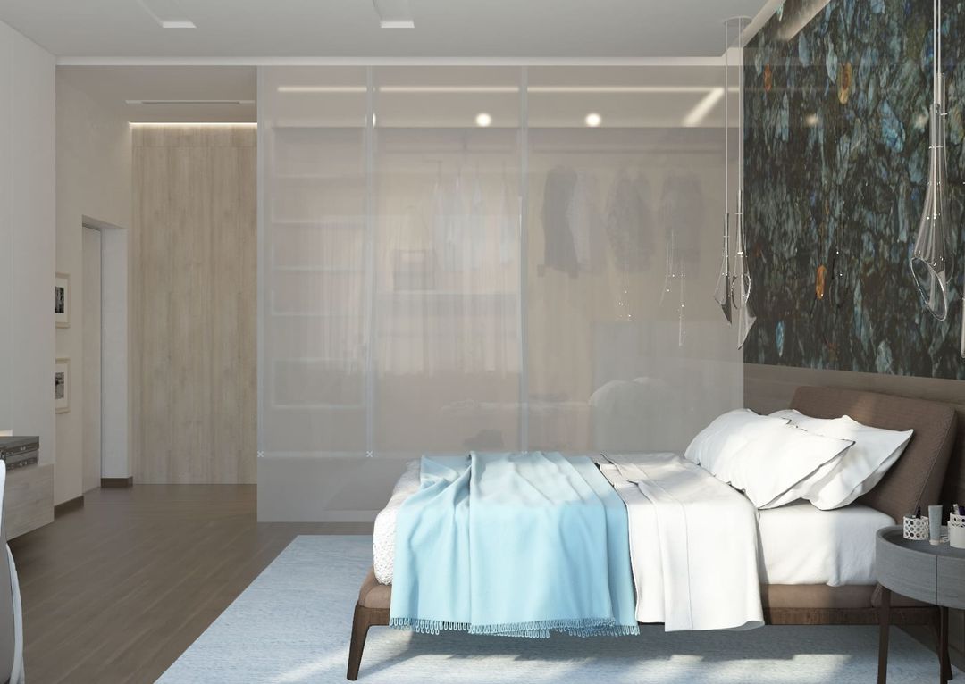 Спальня родителей, расположенная на первом этаже, разделена на две зоны матовым стеклом. Оно визуально не воспринимается как преграда, а гардеробная таким образом отделена от спальни, но обеспечена светом.