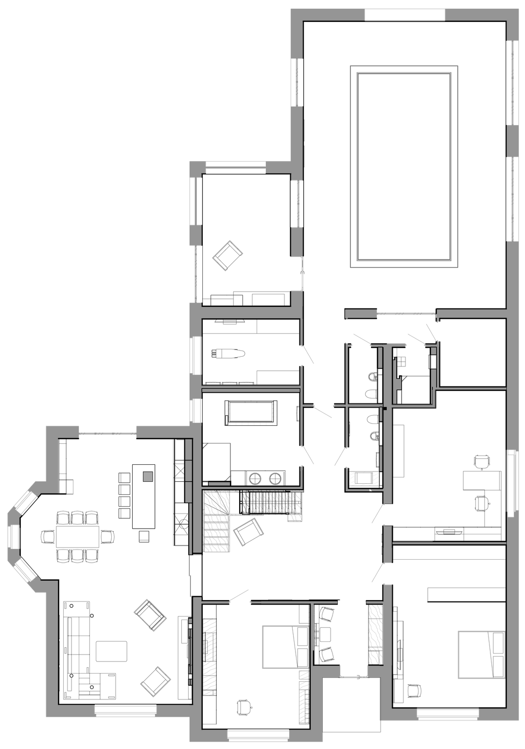 «Домус» — двухэтажный дом с бассейном площадью около 500 м2, стоящий на обширном участке. Domus (лат.) – так называли в Древнем Риме дом-особняк для одной большой семьи. Именно такие ассоциации вызвал у нас этот интересный объект, когда мы приступили к проектированию интерьера.