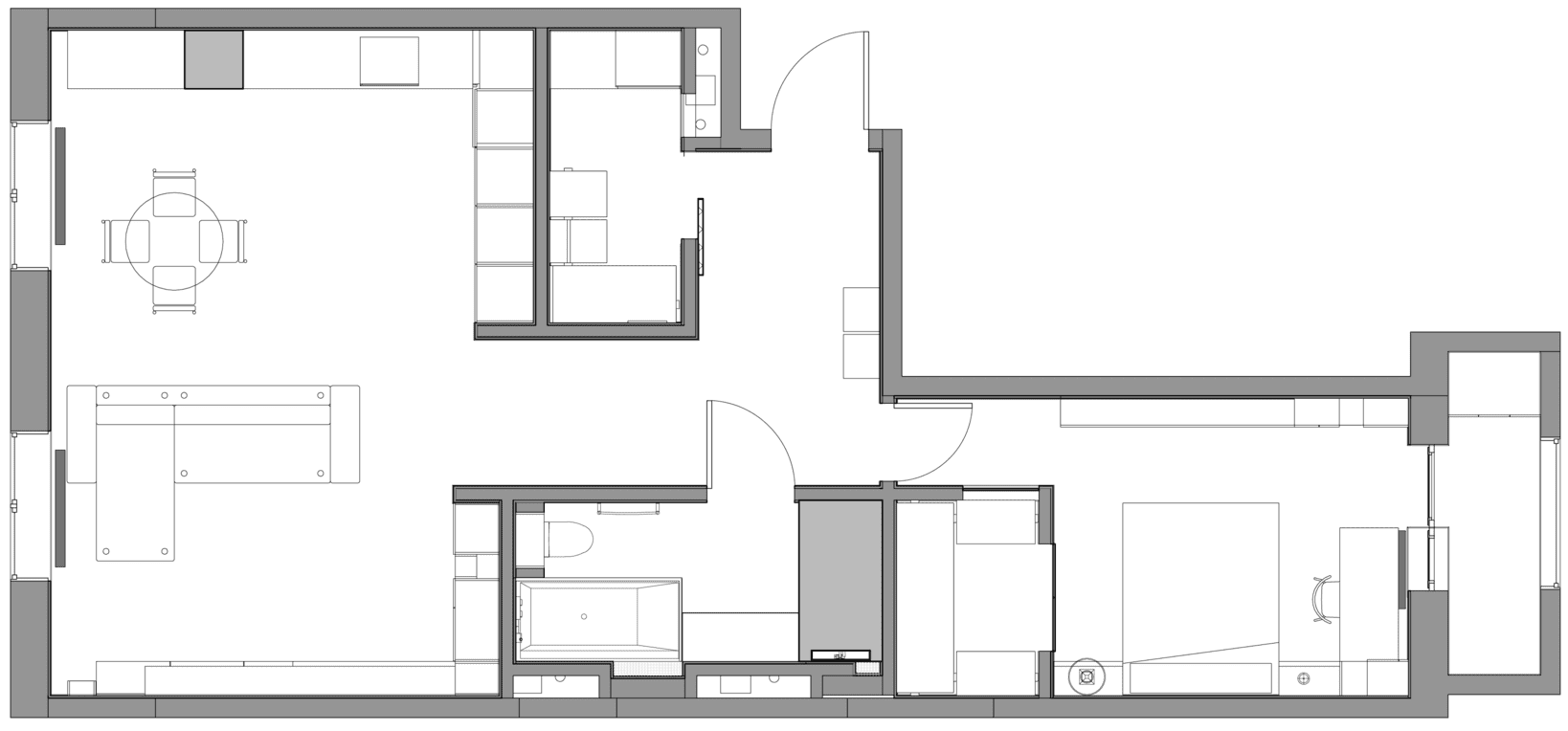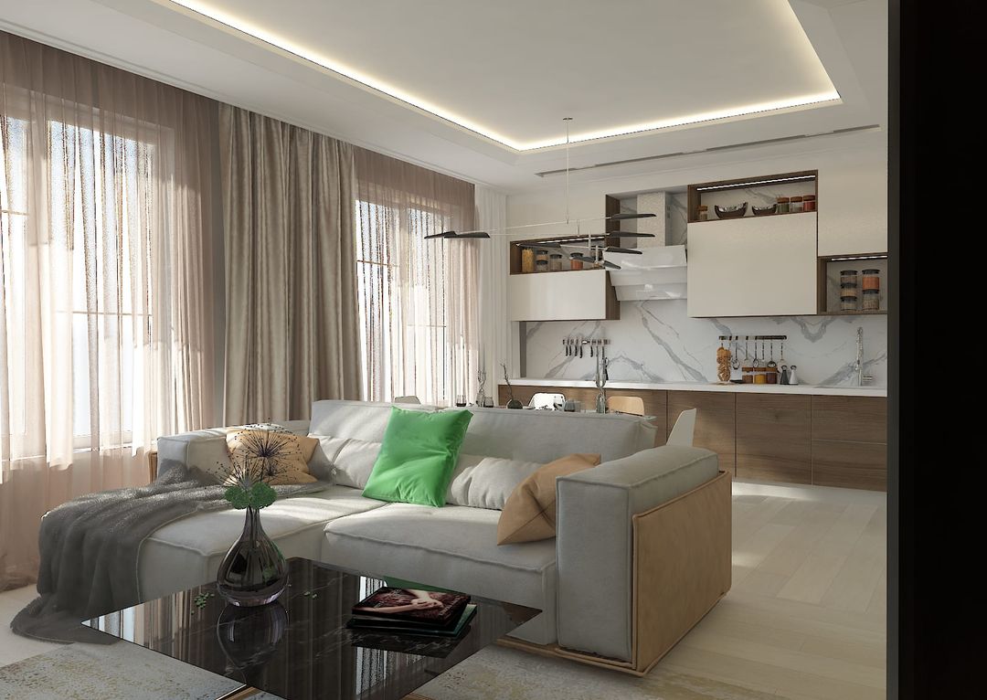 В просторной кухне-гостиной мы разместили не только кухонную мебель, раздвижной стол, диван и тв-зону, но и места хранения слева от тв-зоны, которые композиционно продолжают пеналы кухни.