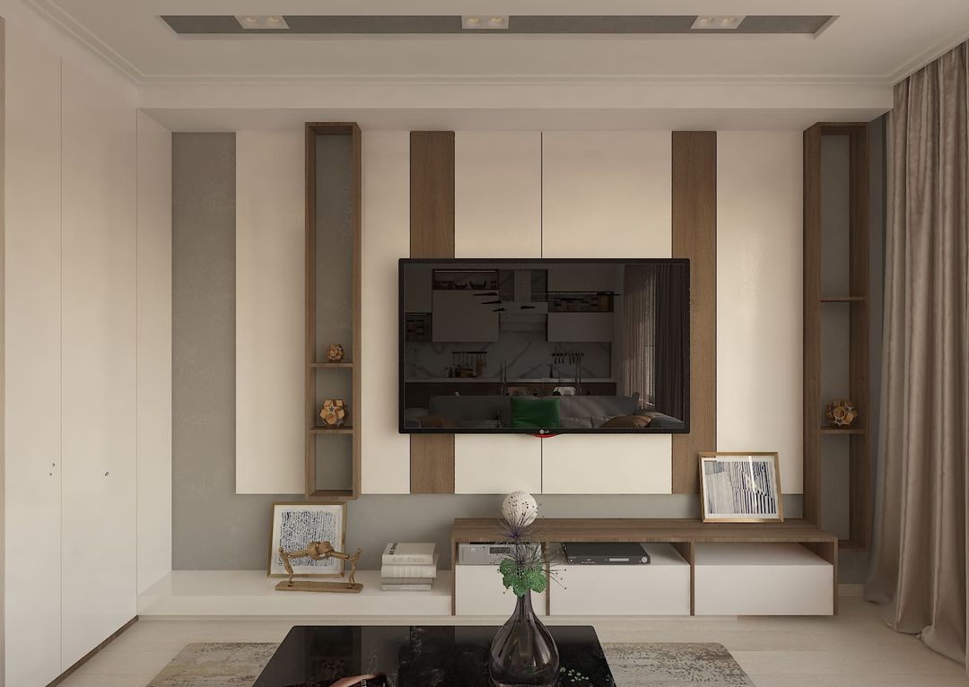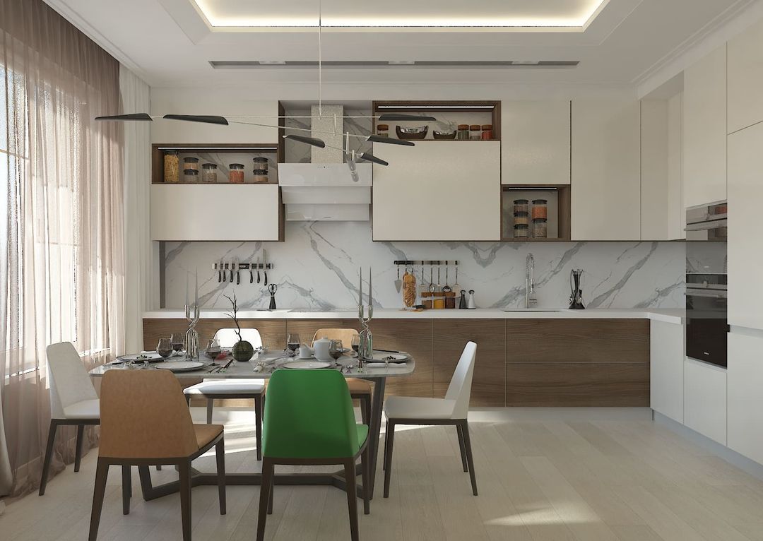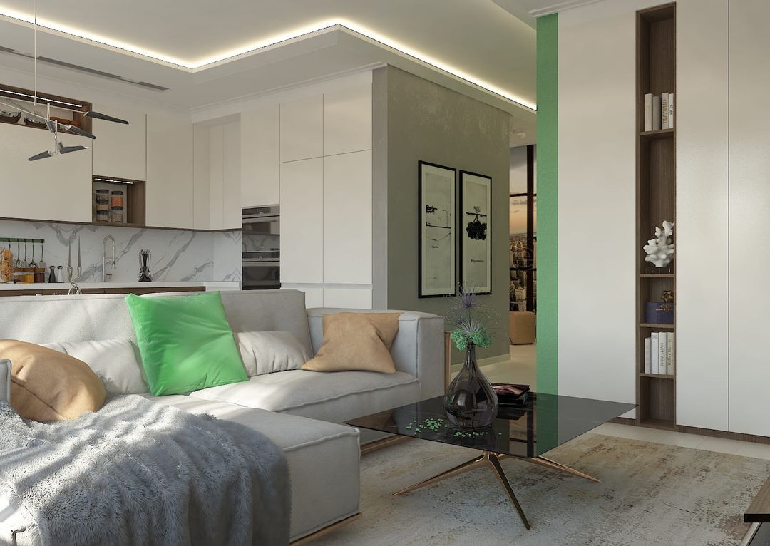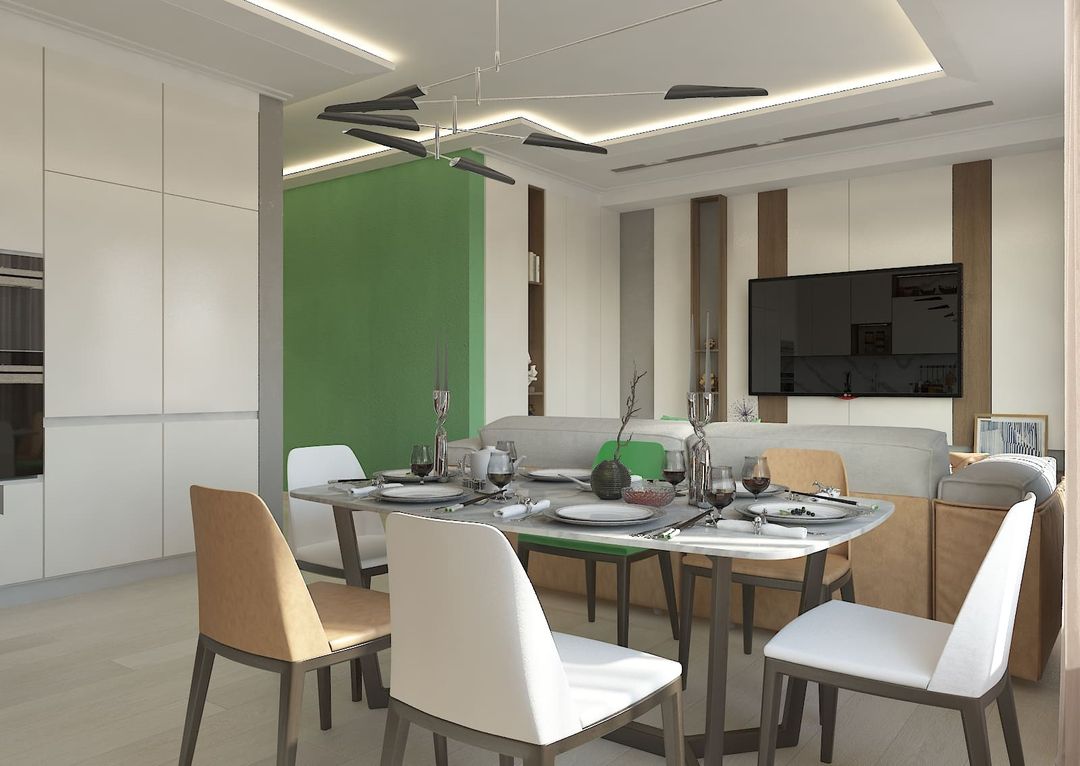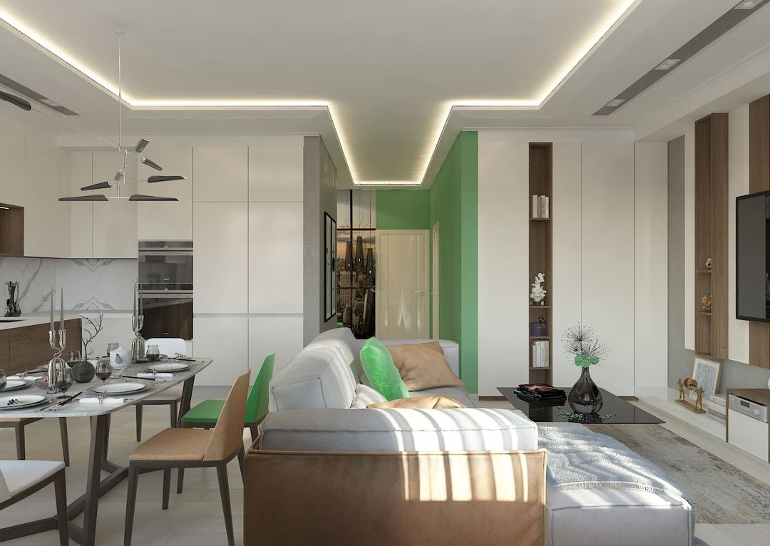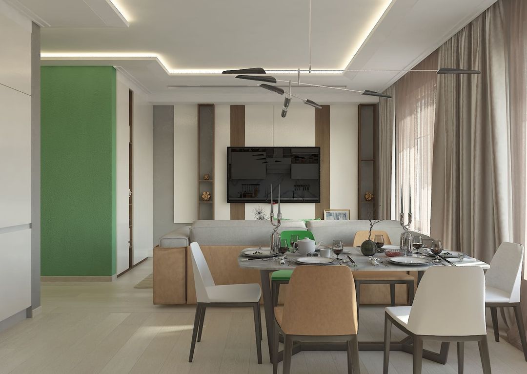 В просторной кухне-гостиной мы разместили не только кухонную мебель, раздвижной стол, диван и тв-зону, но и места хранения слева от тв-зоны, которые композиционно продолжают пеналы кухни.