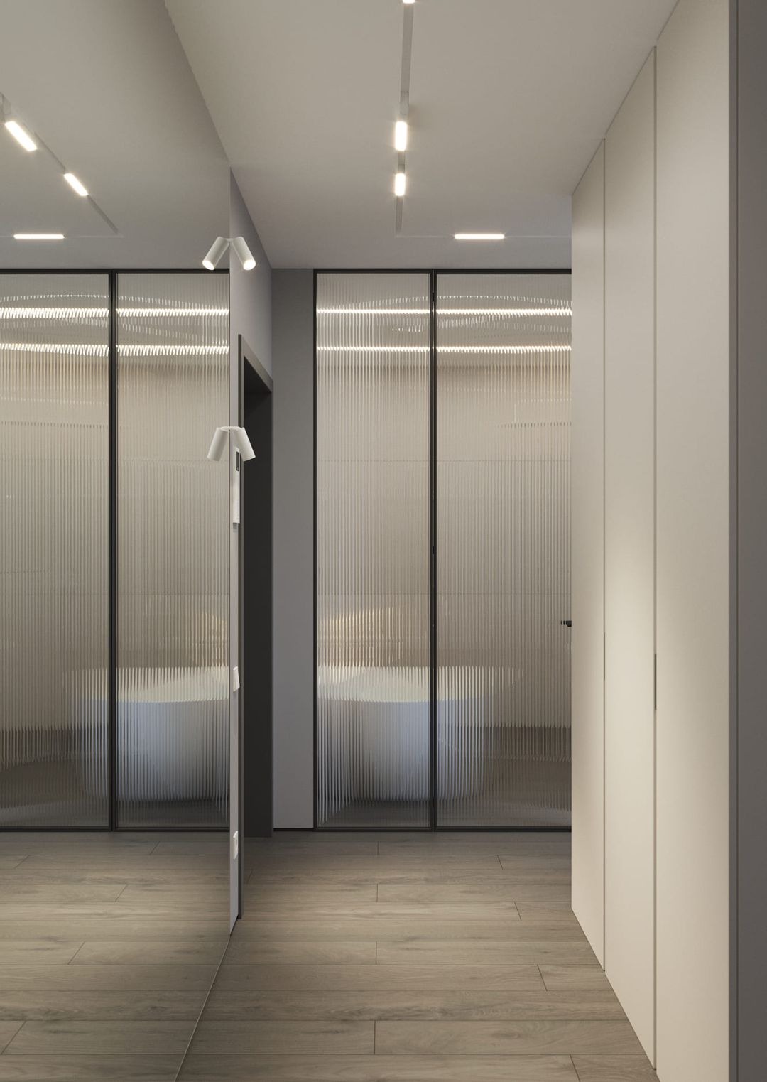 Квартира не предназначена для постоянного проживания; хозяйка будет приезжать в отпуск, гости тоже редкость. Поэтому между ванной и прихожей мы поставили перегородку из рифленого стекла. Она зрительно увеличила квартиру, впустила в ванную поток естественного света. Наконец, это просто очень красиво 🙂