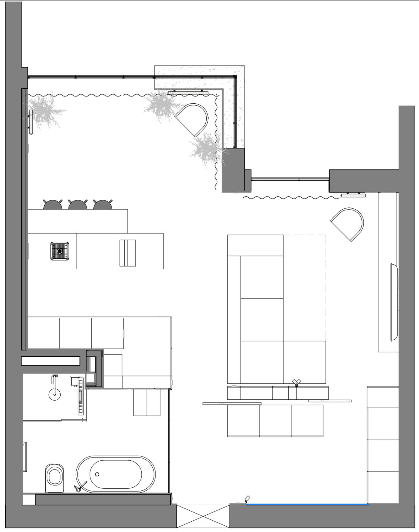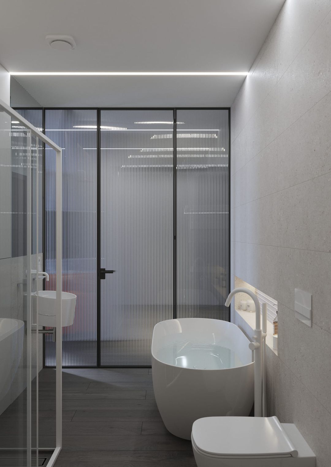 Между ванной и кухней, в мебели, скрыт «хозяйственный центр» квартиры: электрический щит, счетчики, все необходимые принадлежности. Со стороны ванной встроена стиральная машина. В результате стиральная машина не занимает лишнего места, и в ванной комнате поместились просторная душевая кабина, отдельно стоящая ванна, ниша с подсветкой и места хранения в зоне раковины. Весь функционал кухни расположен в пеналах и на острове (варочная поверхность и мойка). Вытяжка встроена в потолок с помощью щелевого дефлектора.