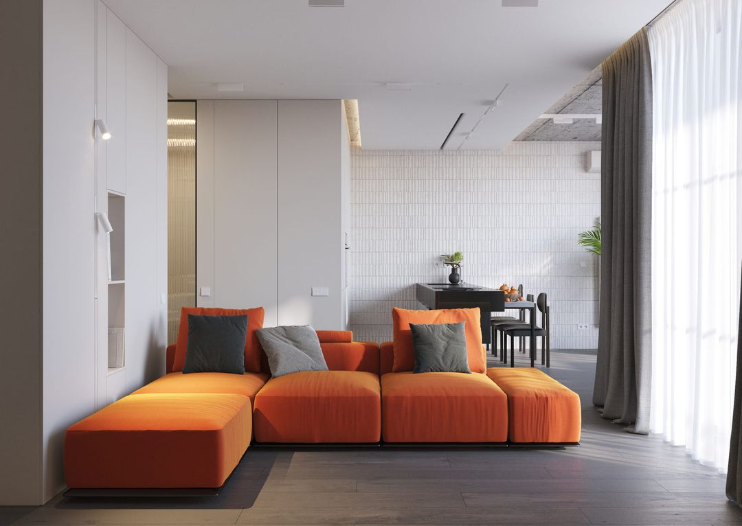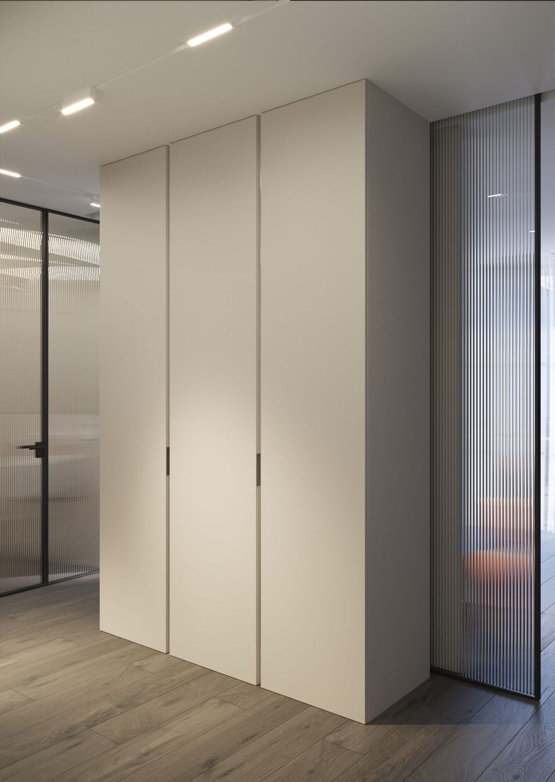 Планировка квартиры свободная; от основного помещения отделены только ванная комната и две застекленные лоджии. Как и во всех своих проектах, мы стремились сохранить объем помещения, не дробить его на части. Для этого зона гардеробной выделена шкафом таким образом, что попасть из гостиной в прихожую можно двумя путями.