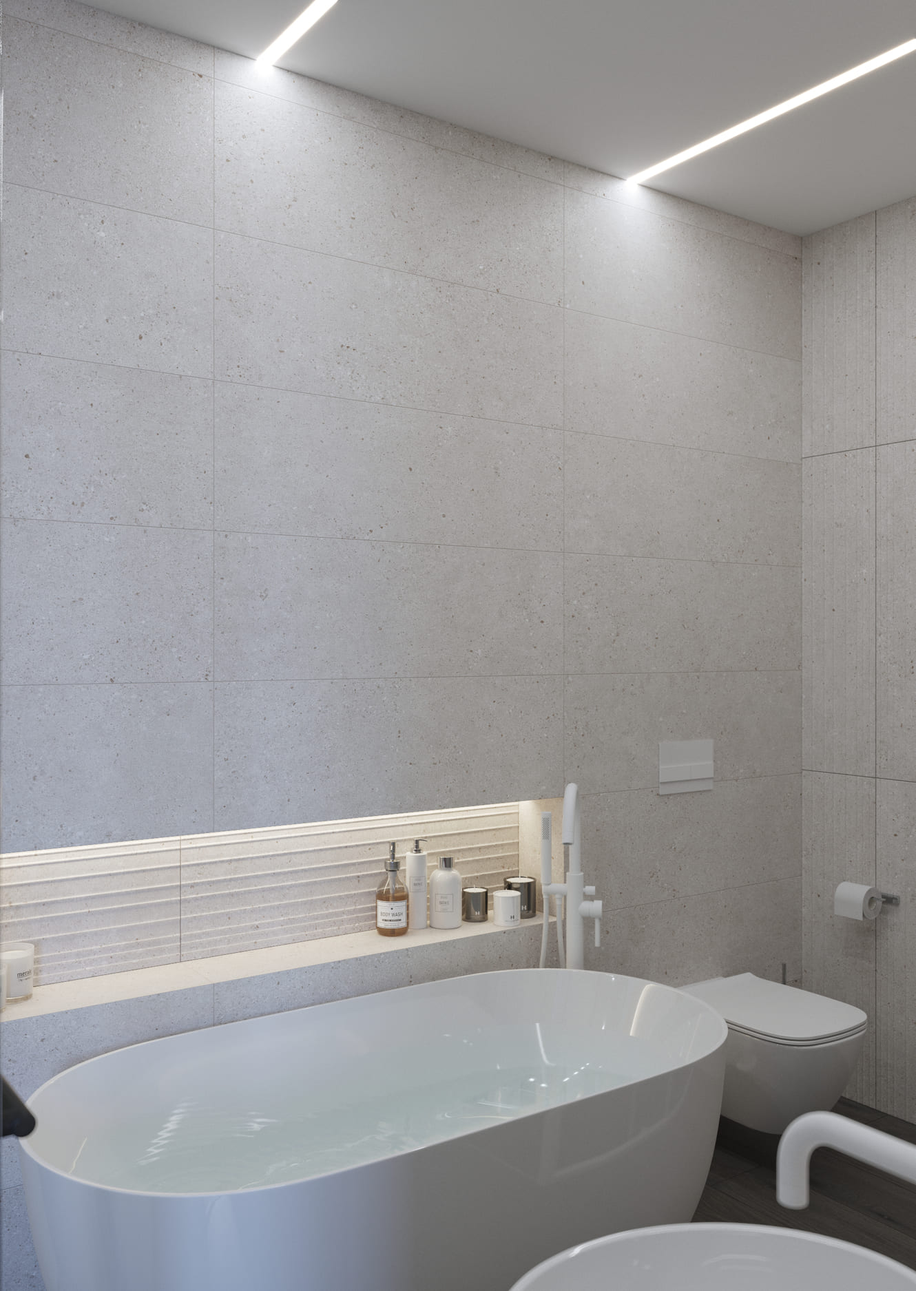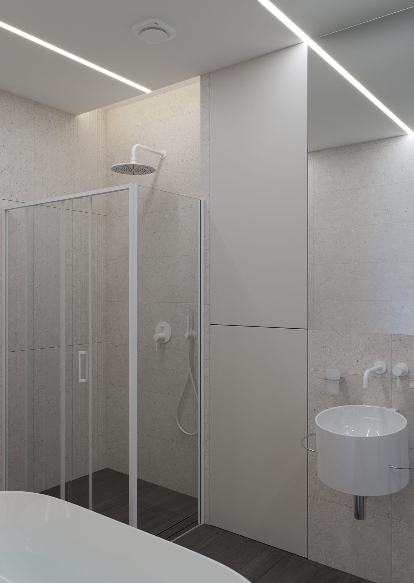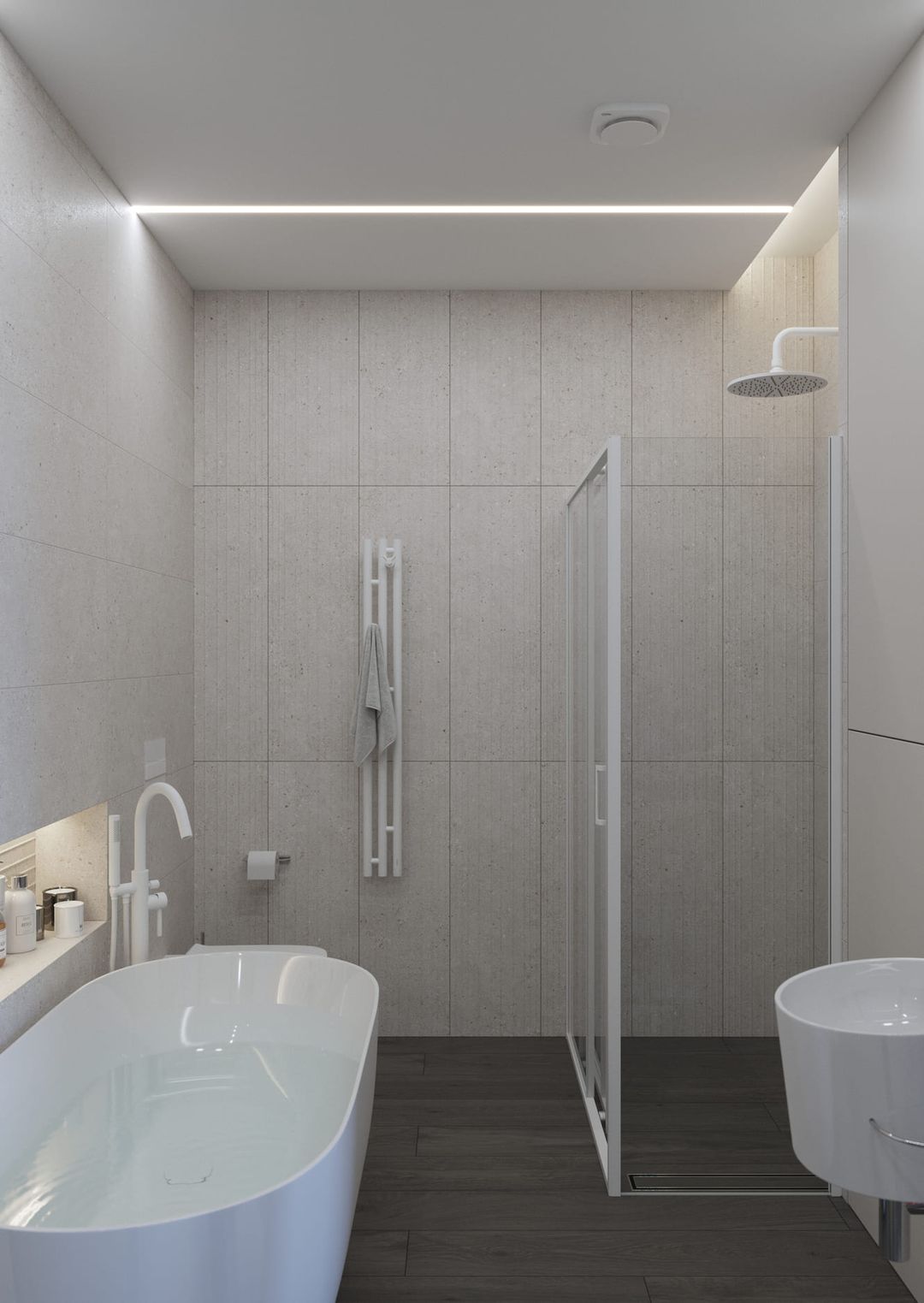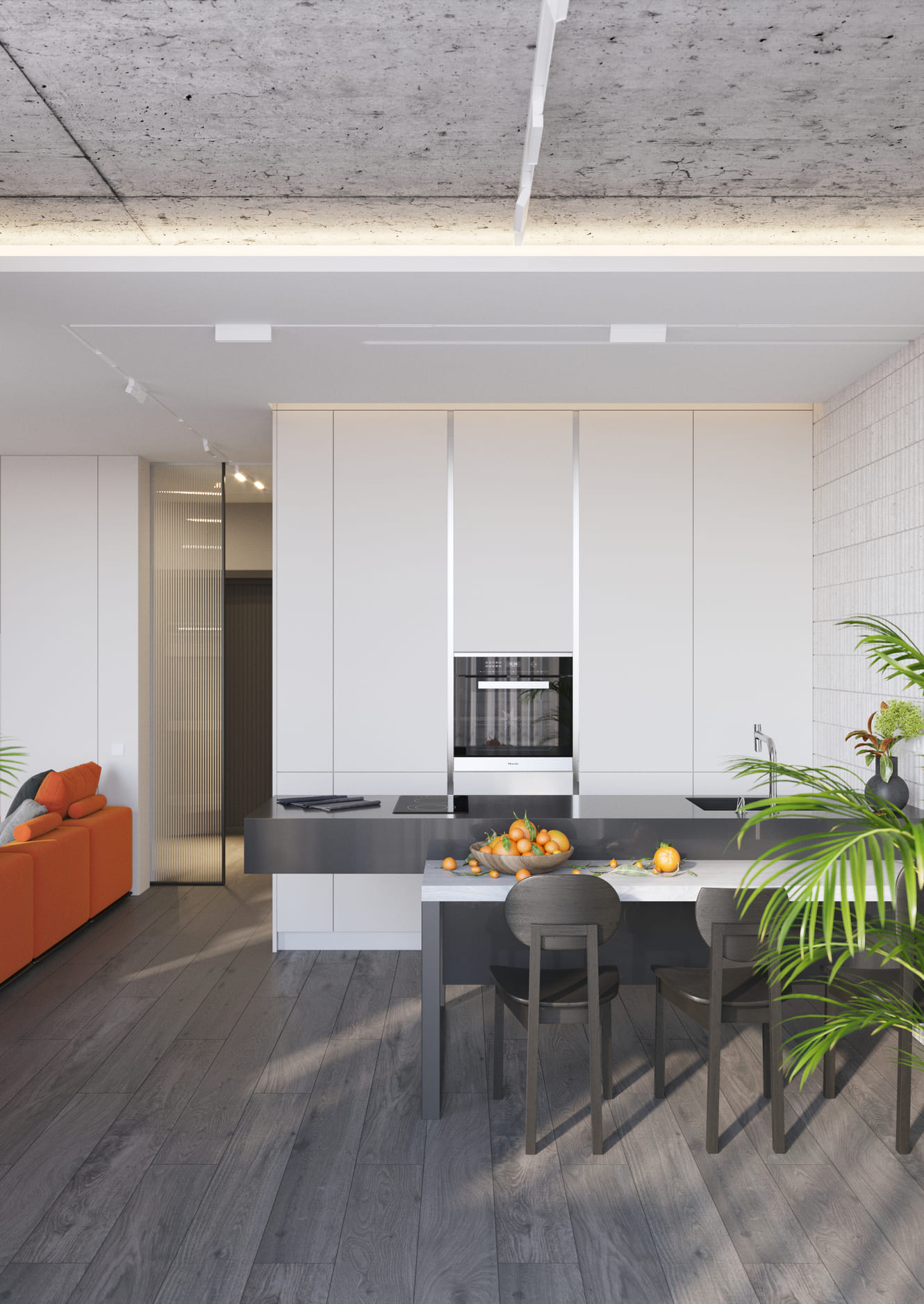 Между ванной и кухней, в мебели, скрыт «хозяйственный центр» квартиры: электрический щит, счетчики, все необходимые принадлежности. Со стороны ванной встроена стиральная машина. В результате стиральная машина не занимает лишнего места, и в ванной комнате поместились просторная душевая кабина, отдельно стоящая ванна, ниша с подсветкой и места хранения в зоне раковины. Весь функционал кухни расположен в пеналах и на острове (варочная поверхность и мойка). Вытяжка встроена в потолок с помощью щелевого дефлектора.