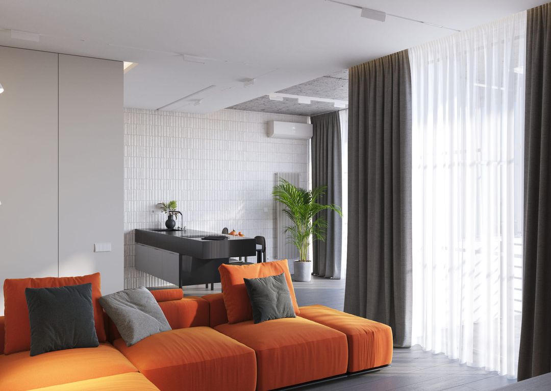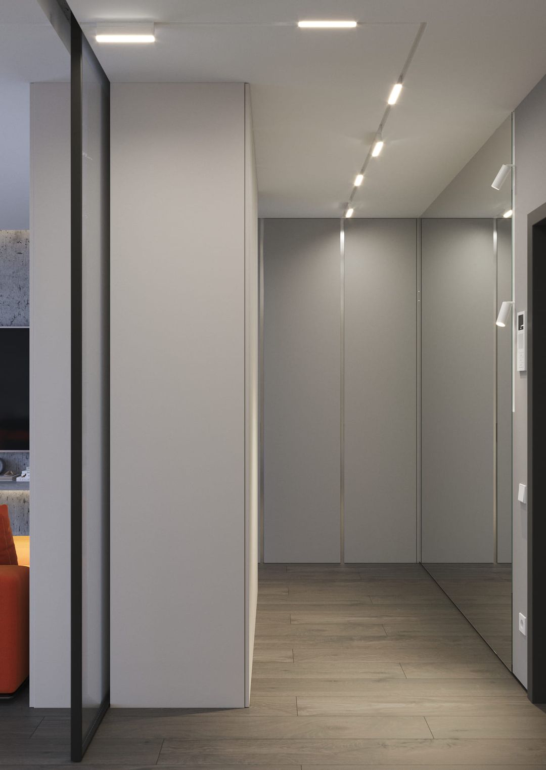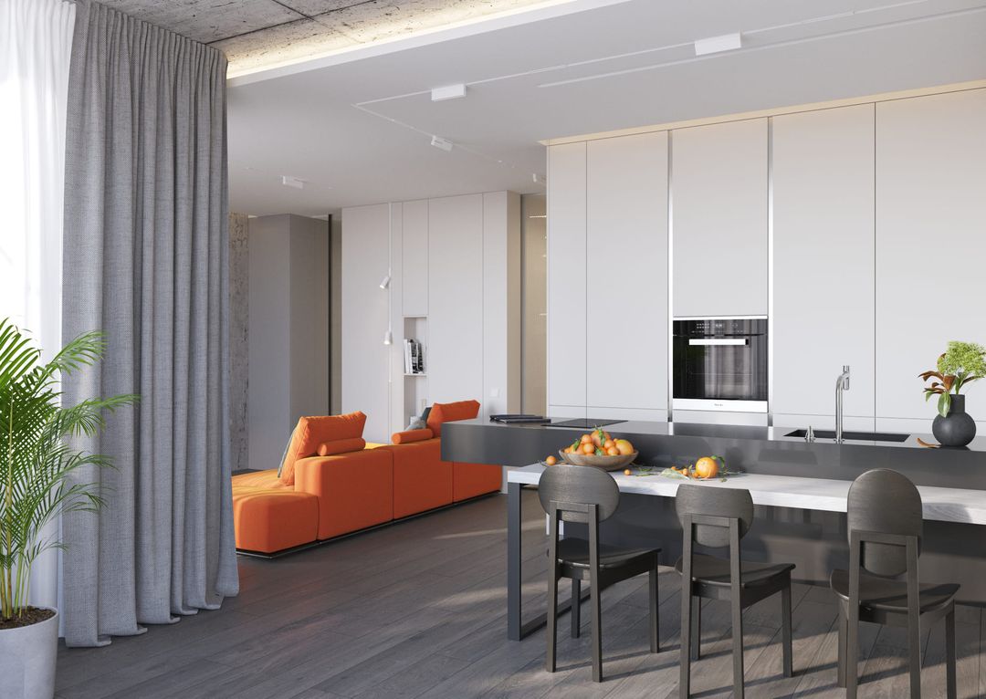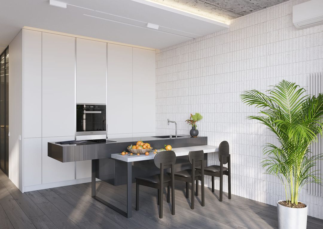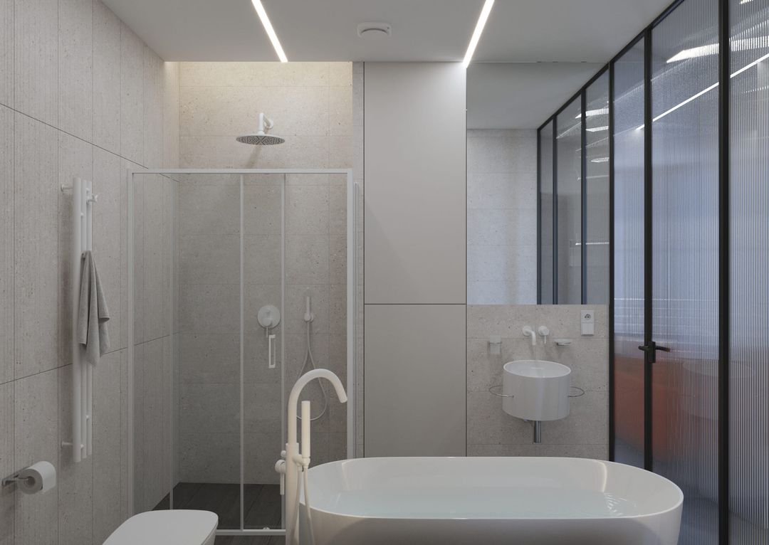 Между ванной и кухней, в мебели, скрыт «хозяйственный центр» квартиры: электрический щит, счетчики, все необходимые принадлежности. Со стороны ванной встроена стиральная машина. В результате стиральная машина не занимает лишнего места, и в ванной комнате поместились просторная душевая кабина, отдельно стоящая ванна, ниша с подсветкой и места хранения в зоне раковины. Весь функционал кухни расположен в пеналах и на острове (варочная поверхность и мойка). Вытяжка встроена в потолок с помощью щелевого дефлектора.