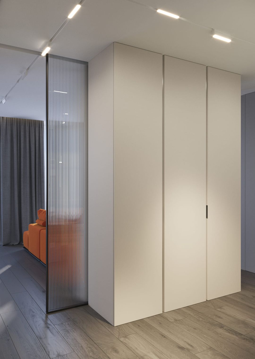 Квартира не предназначена для постоянного проживания; хозяйка будет приезжать в отпуск, гости тоже редкость. Поэтому между ванной и прихожей мы поставили перегородку из рифленого стекла. Она зрительно увеличила квартиру, впустила в ванную поток естественного света. Наконец, это просто очень красиво 🙂