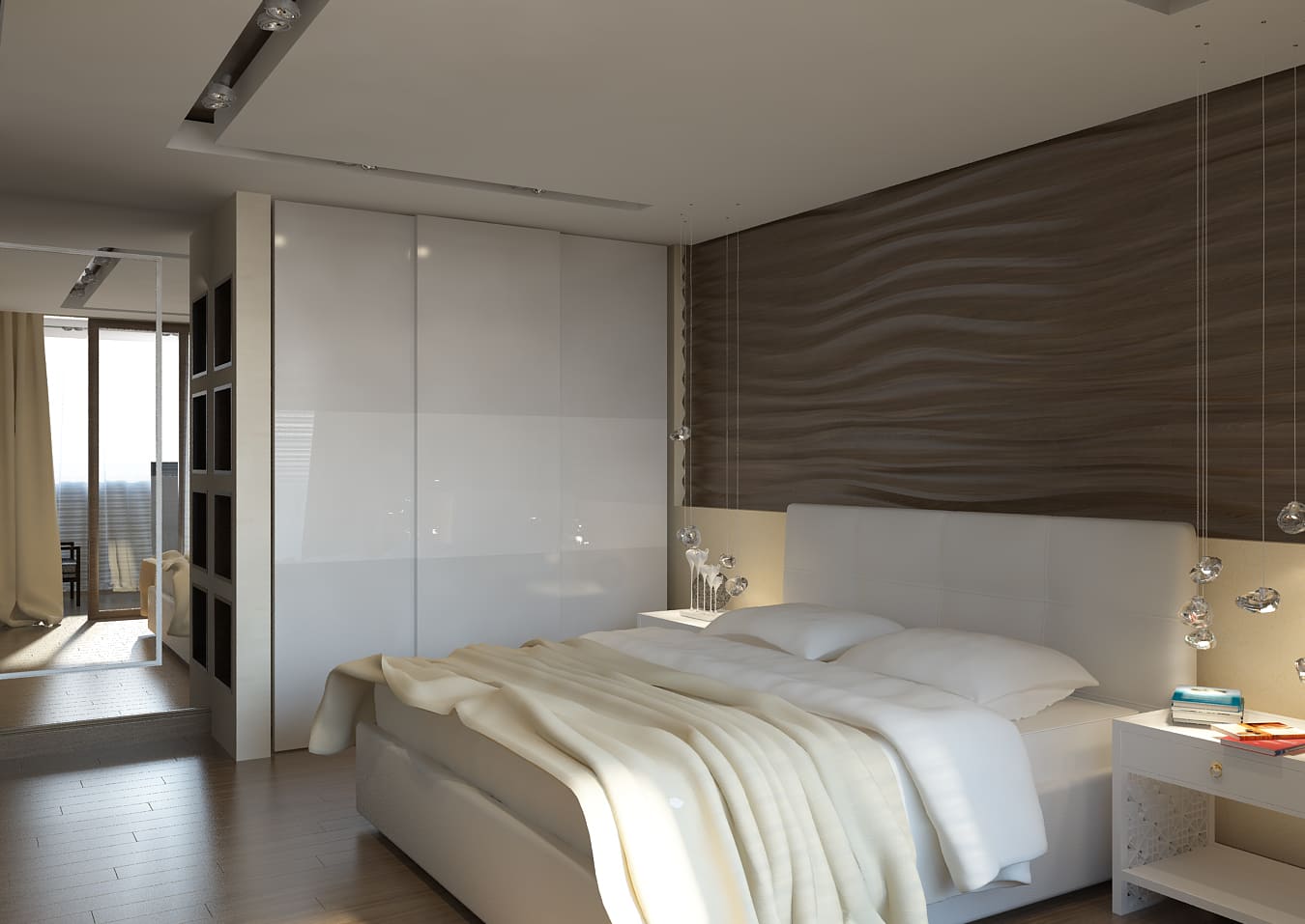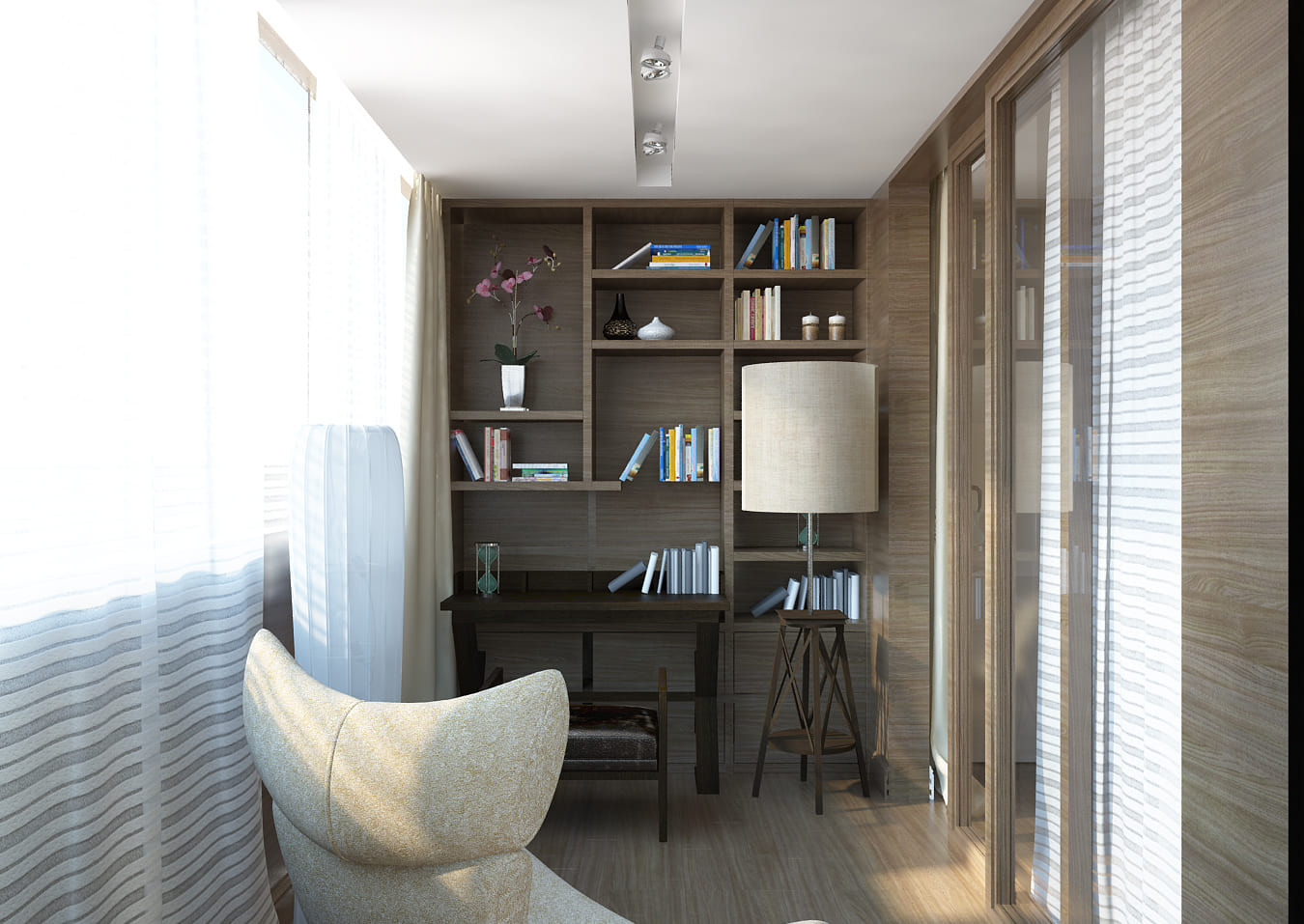 В гостевом санузле помимо места для сантехники мы выделили большую зону хранения для стиральной машины и хозяйственных принадлежностей. В спальне зона ТВ отделана натуральным камнем, а фасады шкафа за ней задвигаются за перегородку. На балконе, отделенном от спальни большим витражом, мы разместили кабинет и зону отдыха.