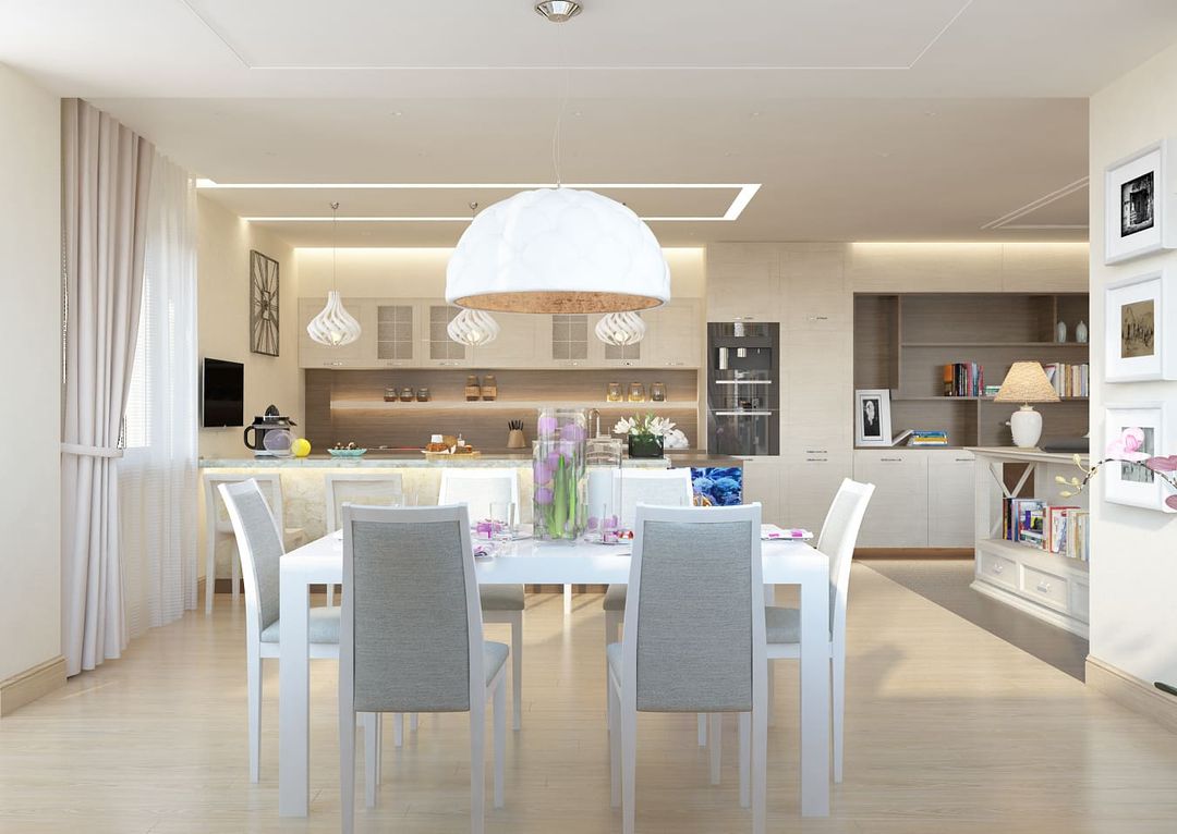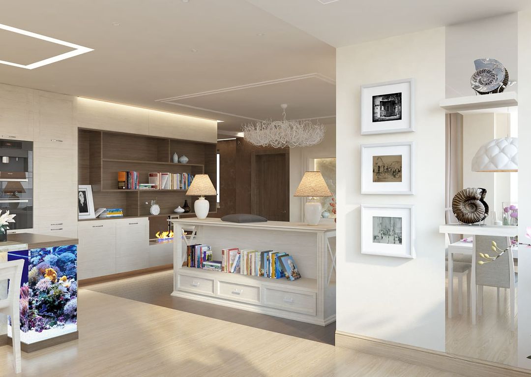 Центр композиции кухни-гостиной – ниша с биокамином, встроенная в кухонный фронт. Благодаря такому расположению камин отделяет гостиную от коридора и позволяет наслаждаться живым огнем, сидя на диване.