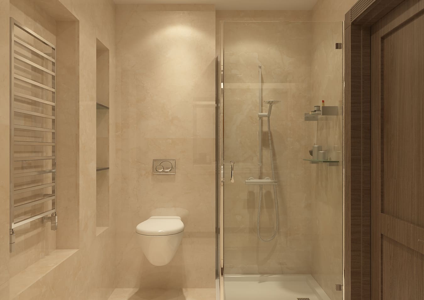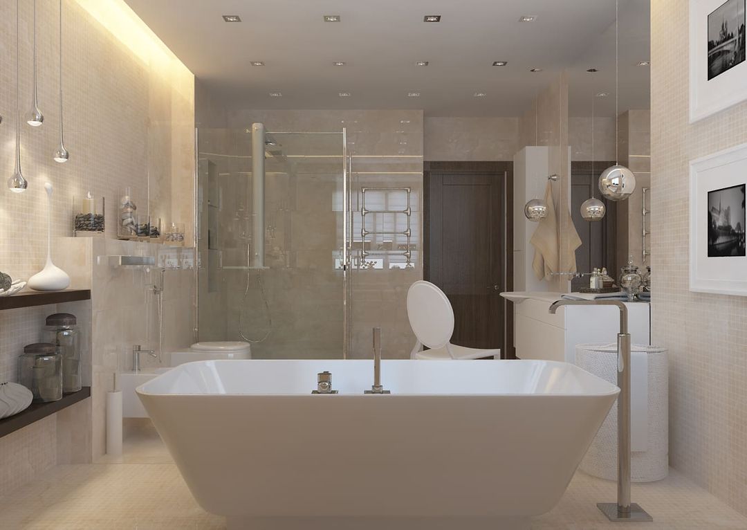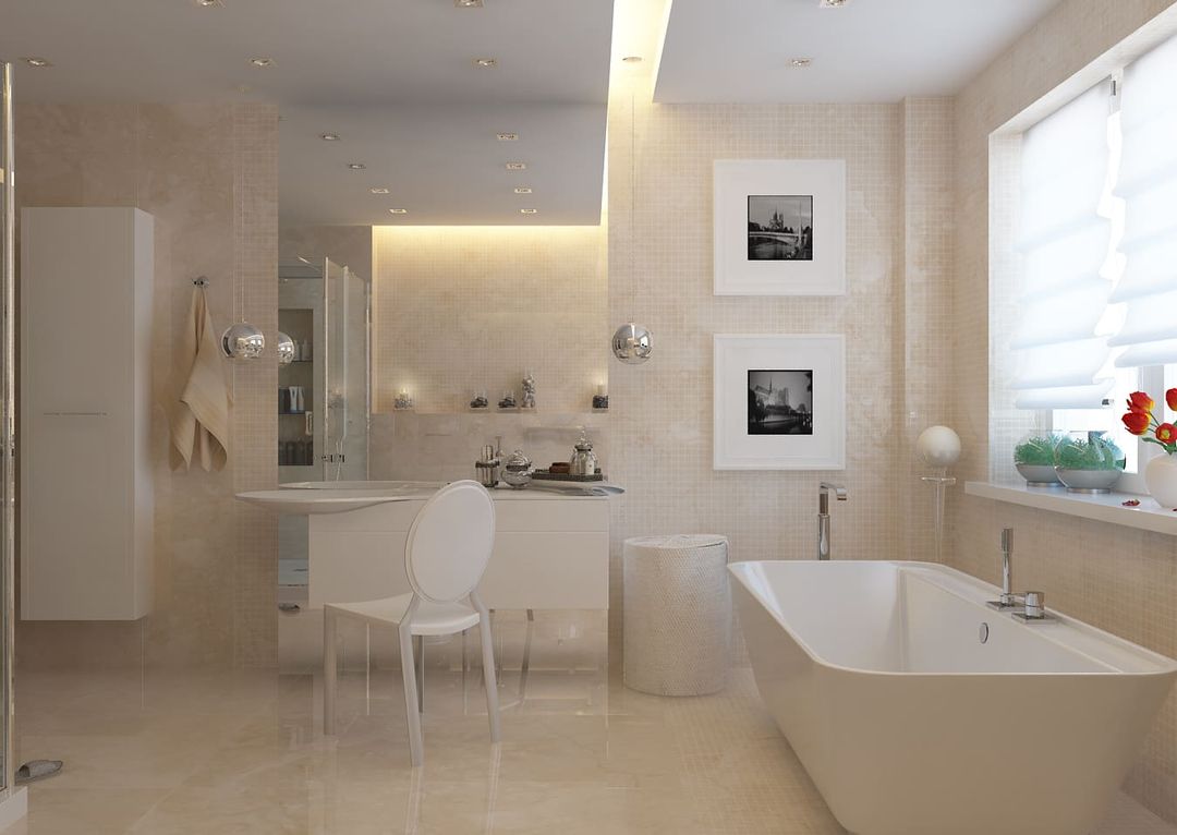 В ванной комнате площадью около 15 м2 есть окно — редкость для квартир в многоэтажных домах. Благодаря ее размерам мы с легкостью разместили просторную душевую кабину, раковину, унитаз и отдельно стоящую ванну у окна.