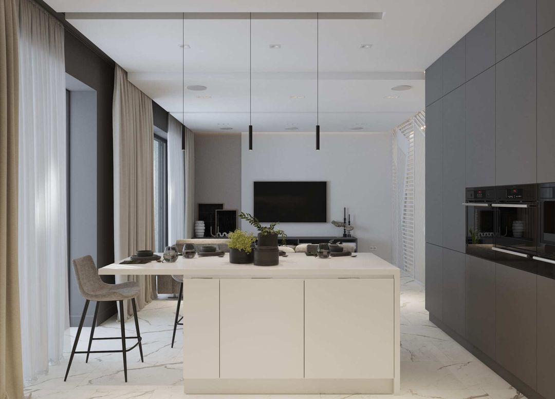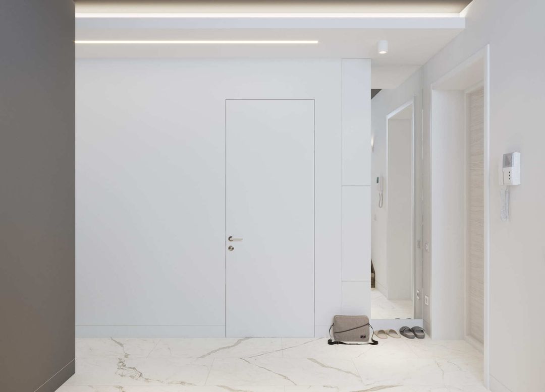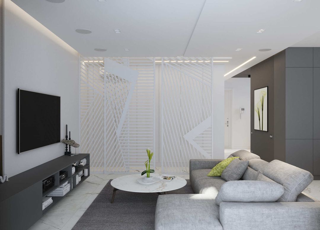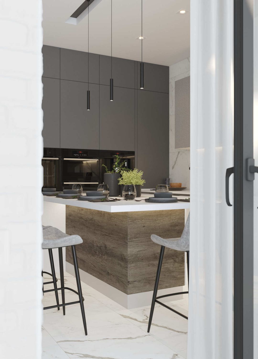 Гардеробная, доступная из прихожей, отделена от кухни не обычной стеной, а резной светопрозрачной перегородкой. Это позволяет сделать её хорошо освещенной днем и зрительно увеличить пространство кухни-гостиной.