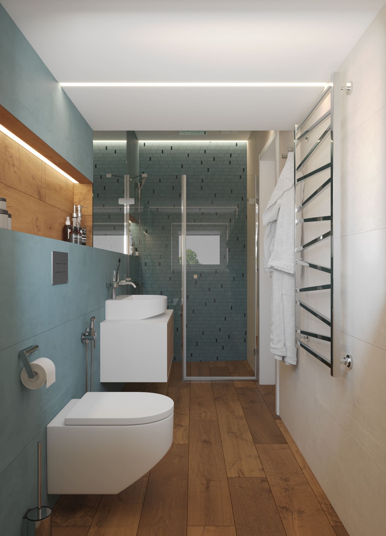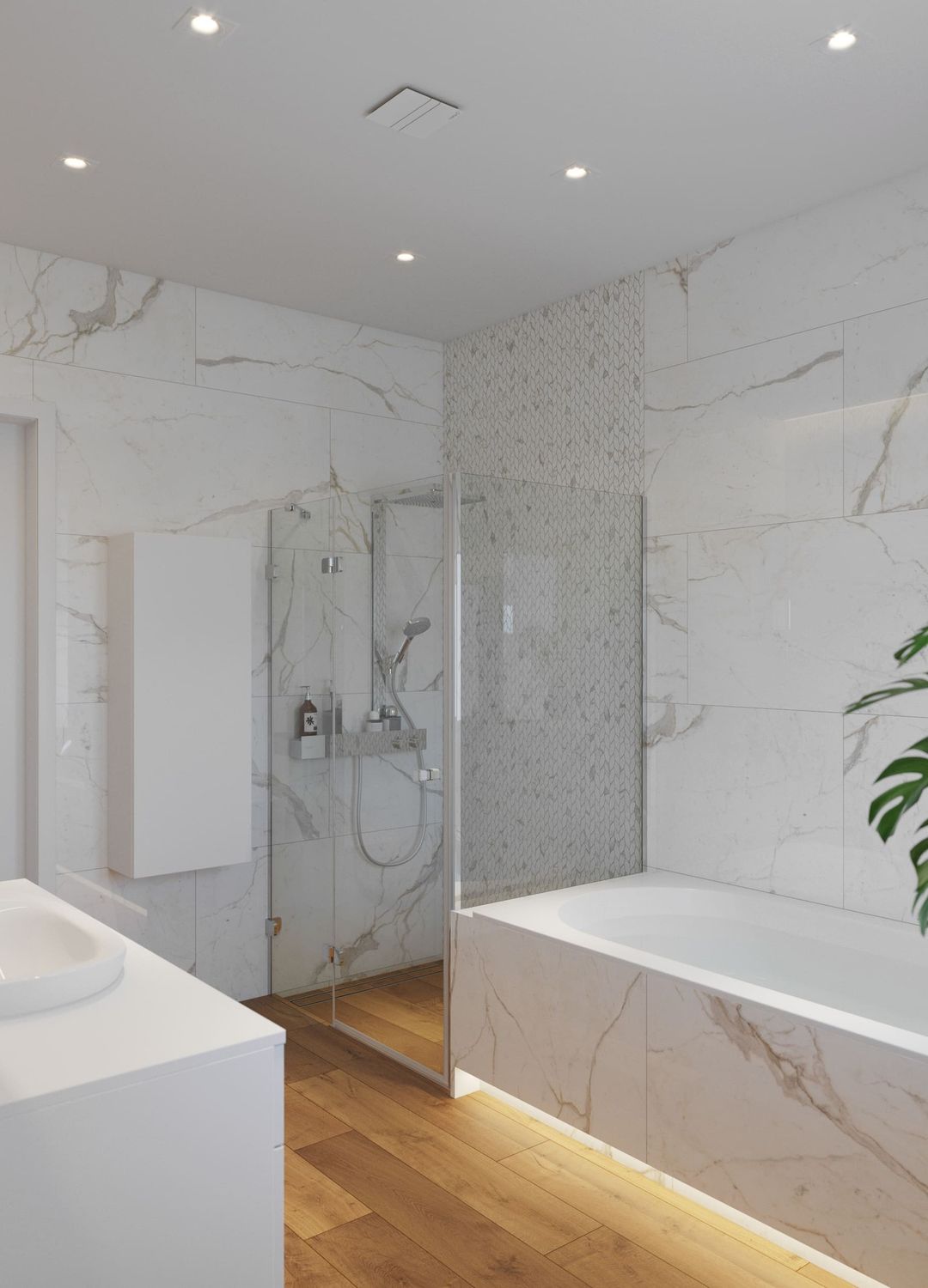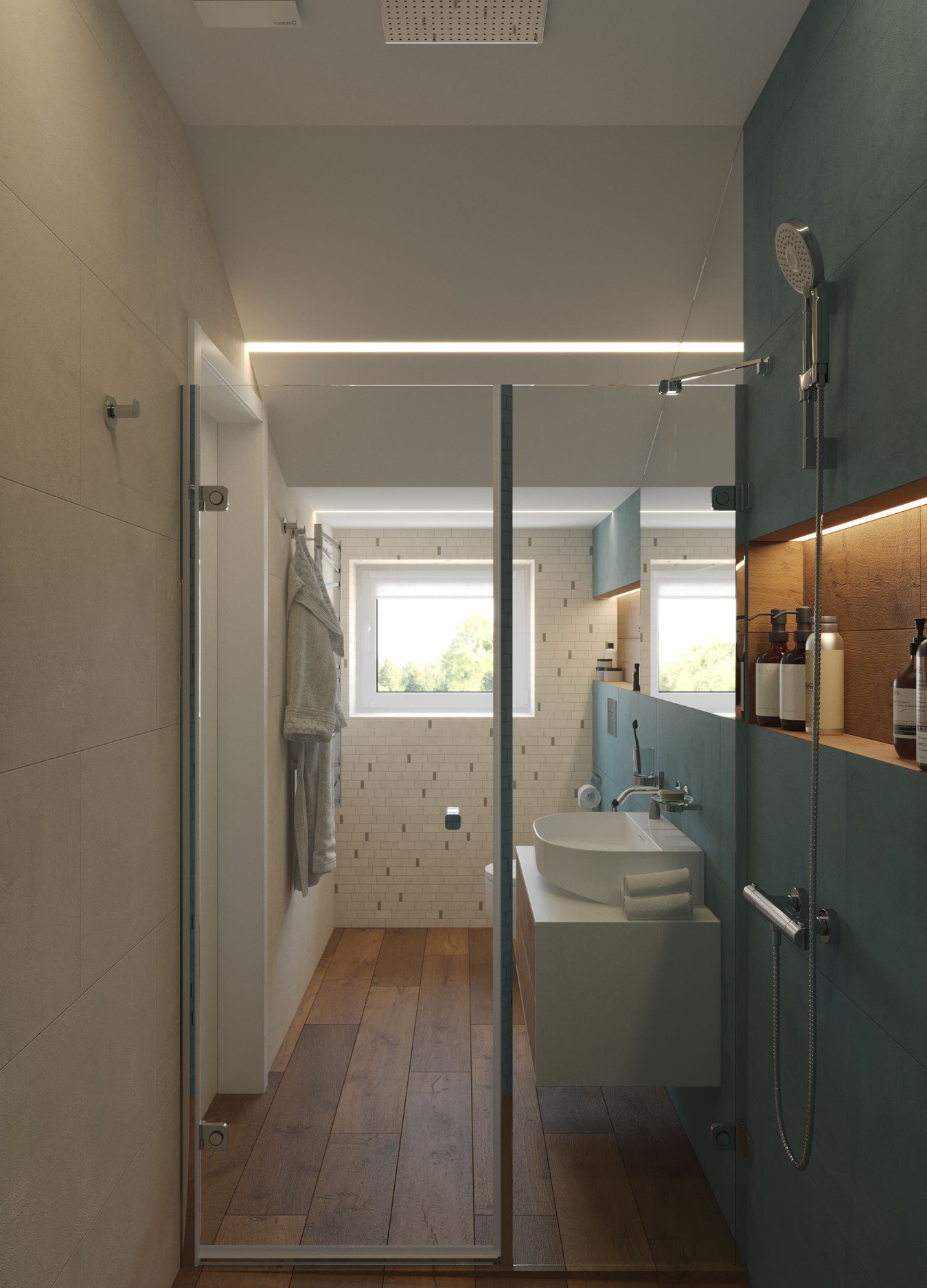 На втором этаже расположены жилые комнаты, ванная комната и санузел. Ванная комната с естественным светом и достаточной площади.Тут расположены ванна на подиуме, душевая зона, раковина, унитаз и места хранения.