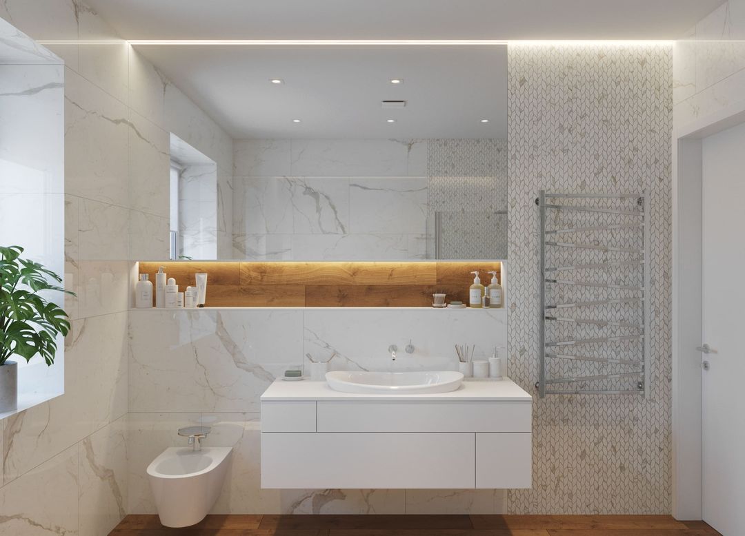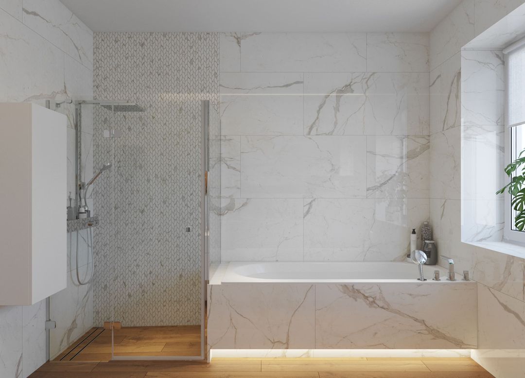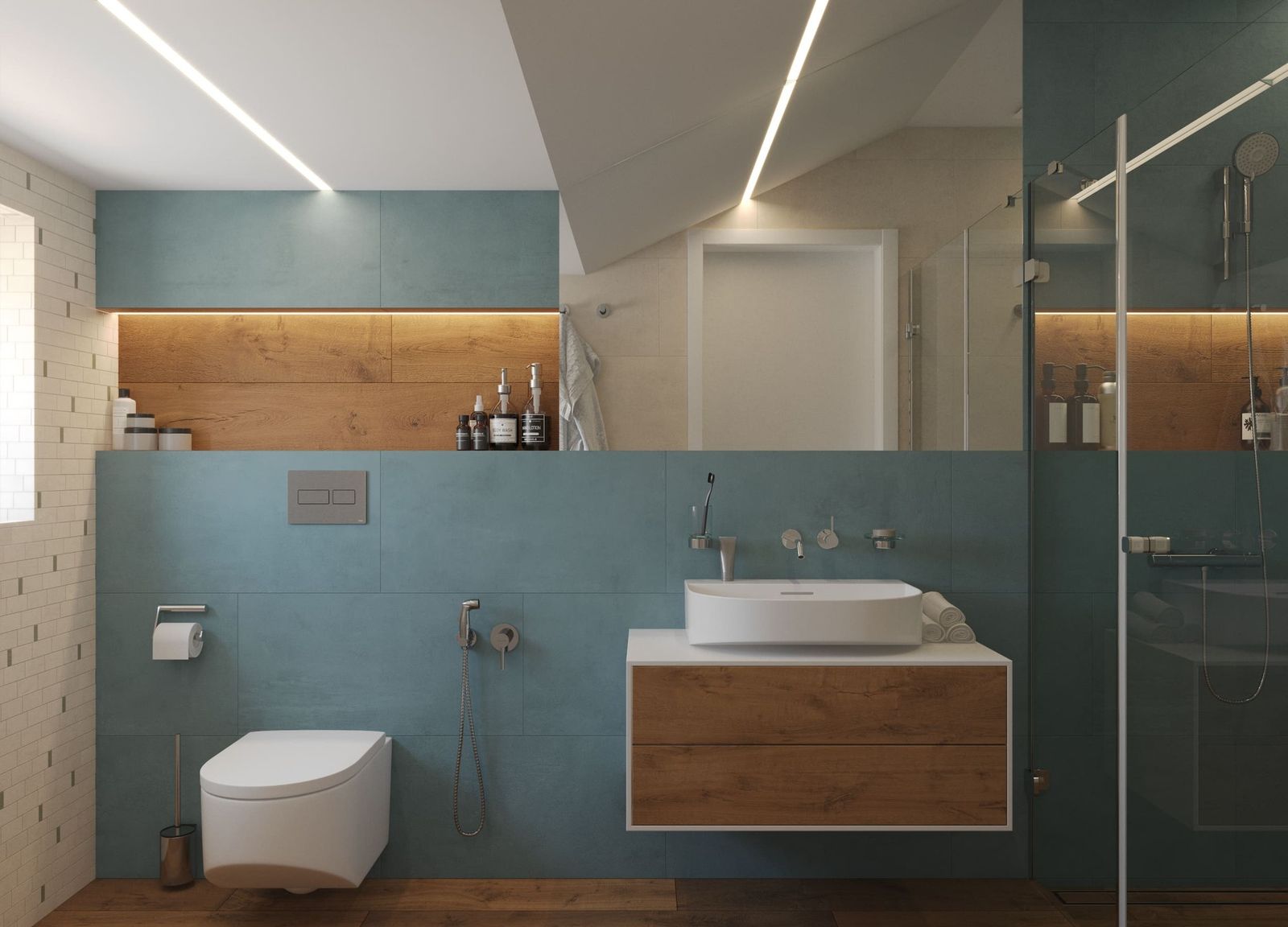 На втором этаже расположены жилые комнаты, ванная комната и санузел. Ванная комната с естественным светом и достаточной площади.Тут расположены ванна на подиуме, душевая зона, раковина, унитаз и места хранения.