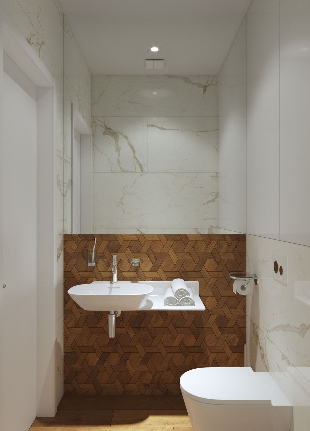 В санузле, как обычно, над инсталляцией встроенный шкаф для хранения мелочей. Несмотря на то, что гостевой санузел первого этажа расположен под лестницей, нам удалось разместить в нем полноценную душевую,унитаз и раковину на подвесной тумбе.
