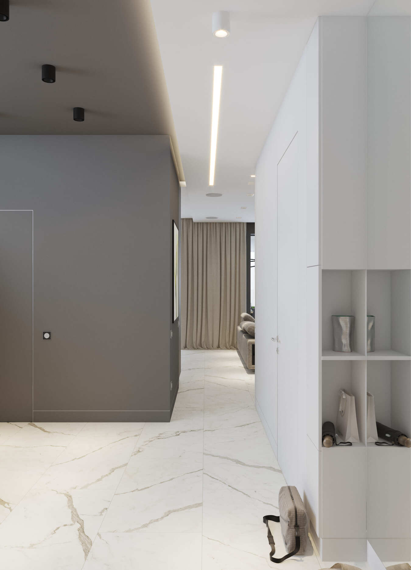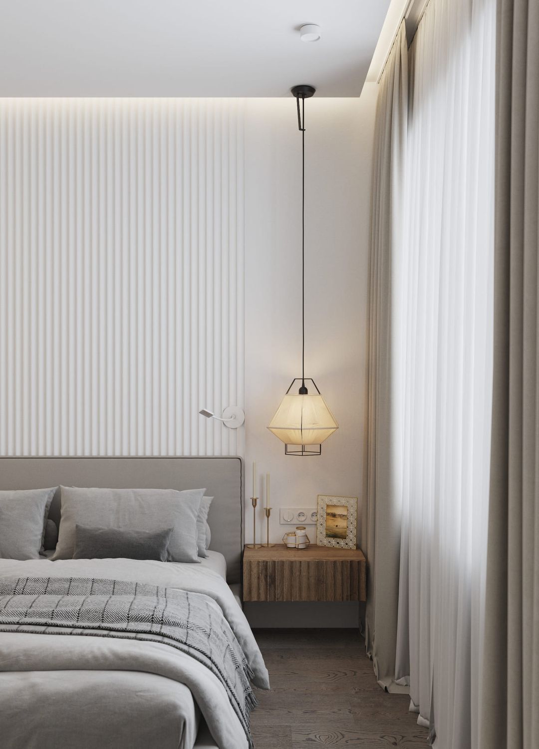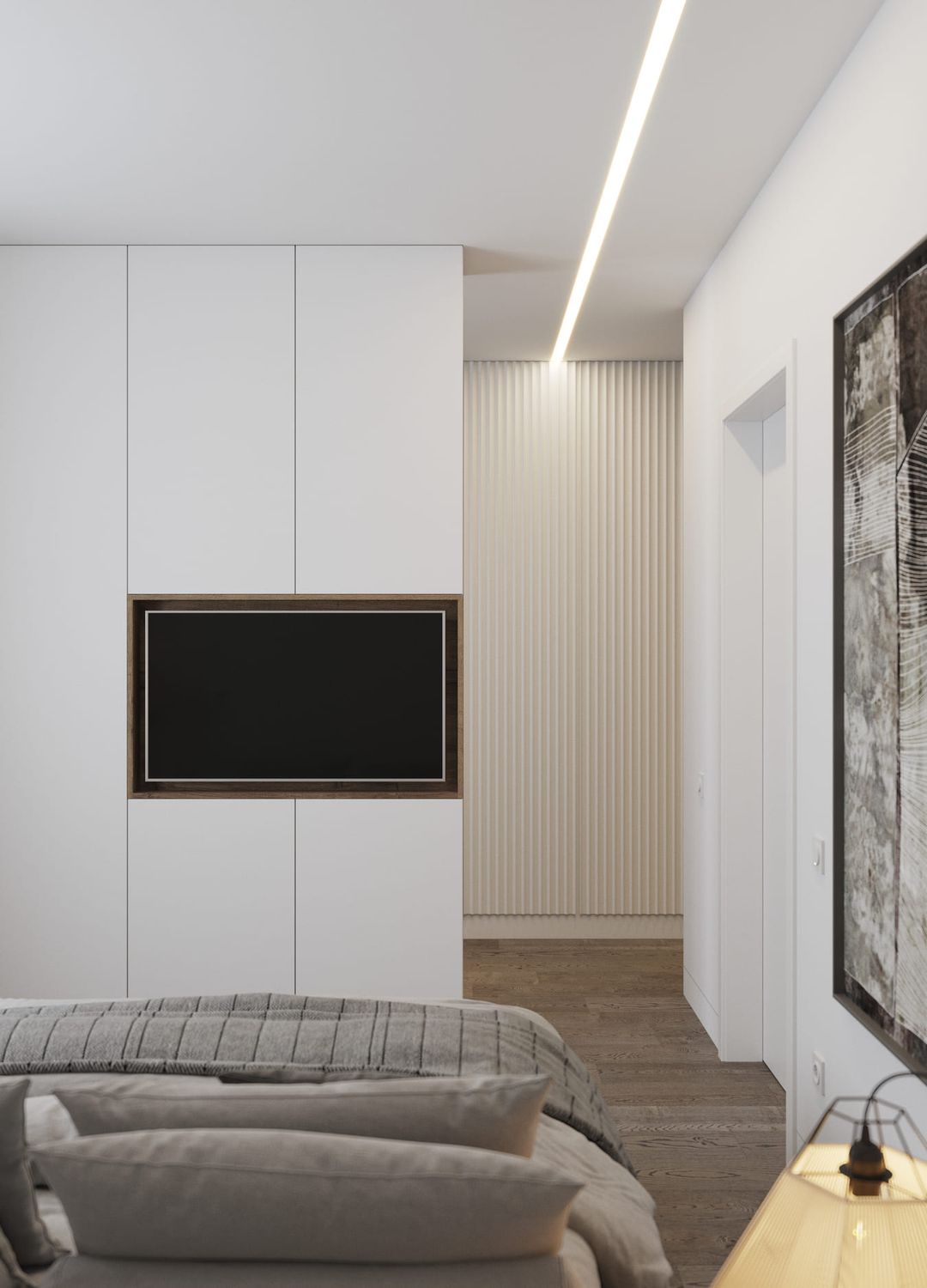 Мы не стали отделять спальню от гардеробной стеной,а сделали мебельную перегородку, в которой есть места хранения и со стороны спальни, и со стороны гардеробной. Со стороны спальни это в том числе тв-зона,а со стороны гардеробной место для макияжа с нишей и большим зеркалом.
