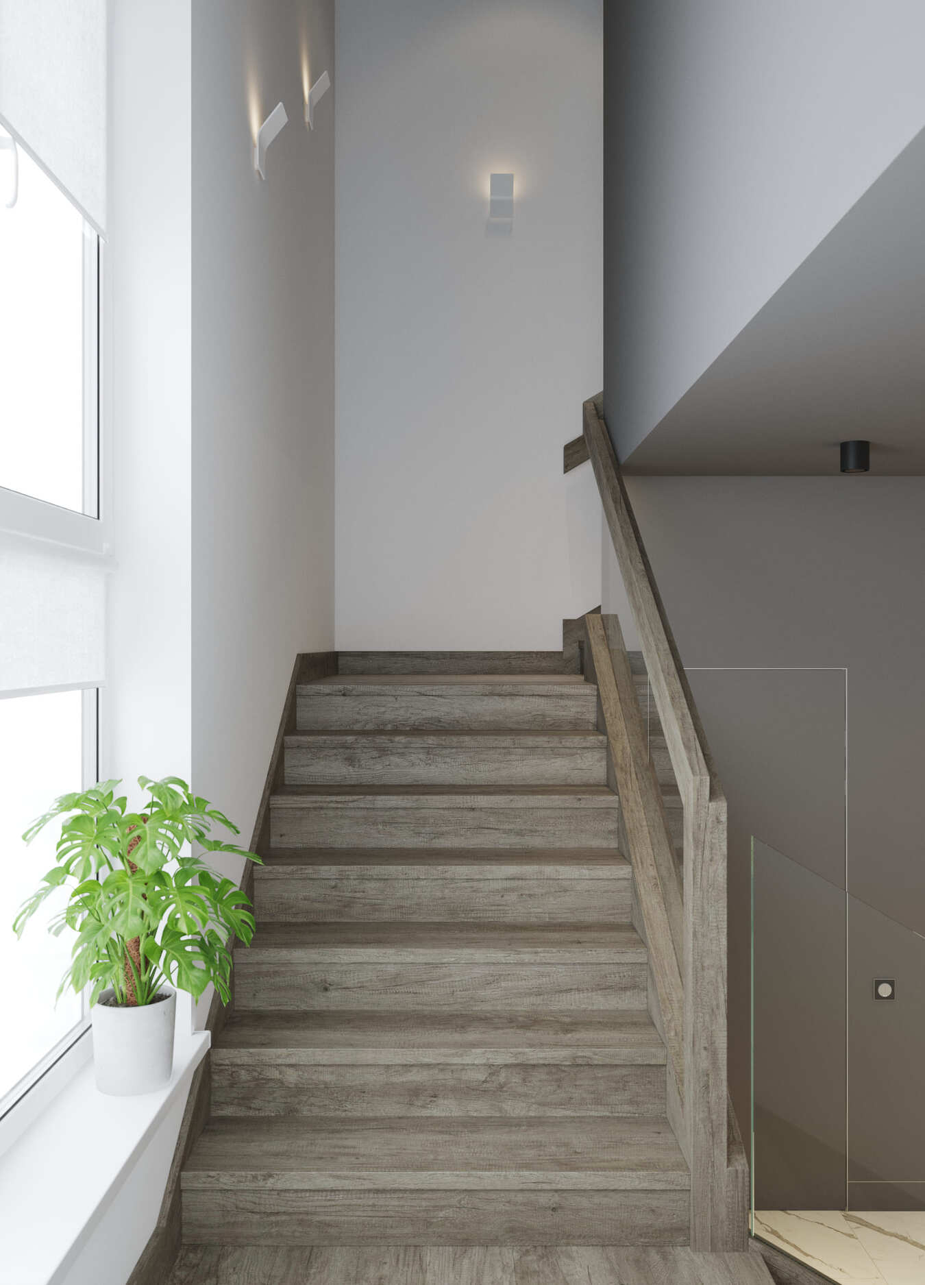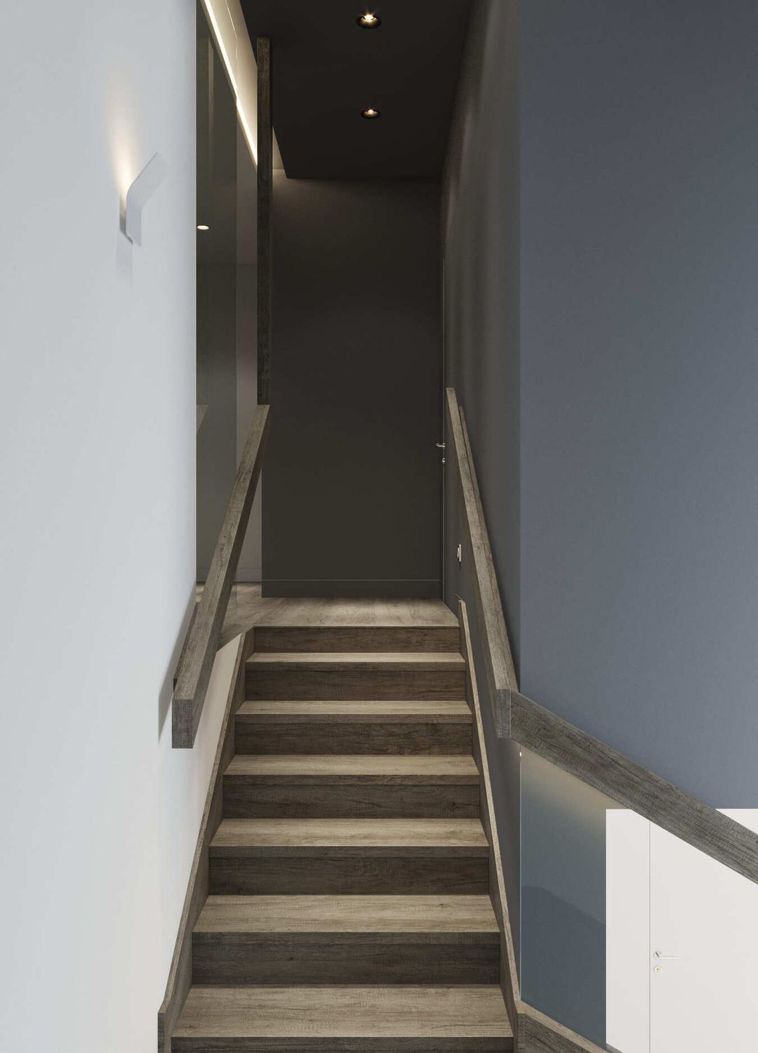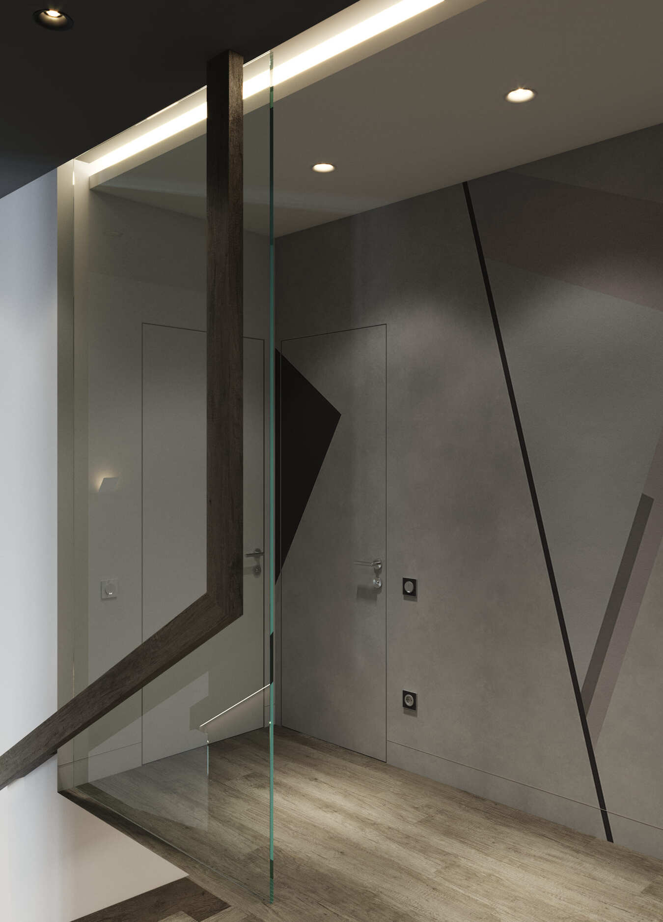 Лестница также спроектирована таким образом, чтобы не отделять её ограждением от объема основного помещения. Для этого в качестве ограждения и на втором, и на первом этаже использовано осветленное стекло, не имеющее(в отличие от обычного) зеленоватого оттенка.