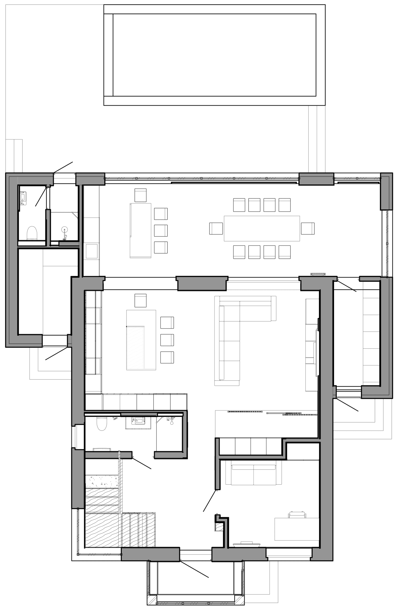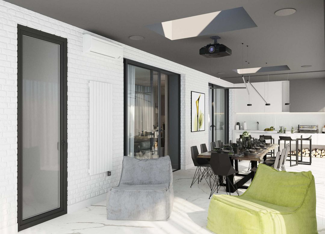 Благодаря выносу котла в новую котельную на кухне удалось реализовать желаемую конфигурацию кухни, а на новой террасе появилось место для приема гостей. Терраса – это не только мангал и стол для гостей, но и проектор, и зона для занятий спортом. Кроме того, с террасы можно выйти к бассейну и на участок за домом.