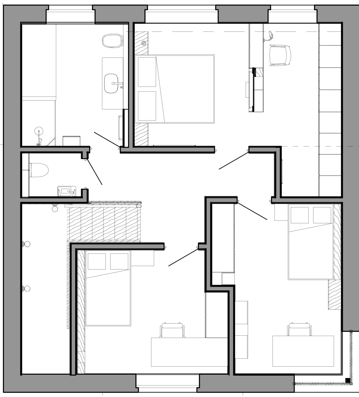 Детские оформлены фресками со скандинавскими мотивами, а между ними, за счет конфигурации перегородки, предусмотрены ниши для больших шкафов, где два сына заказчиков смогут хранить все свои вещи и игрушки.