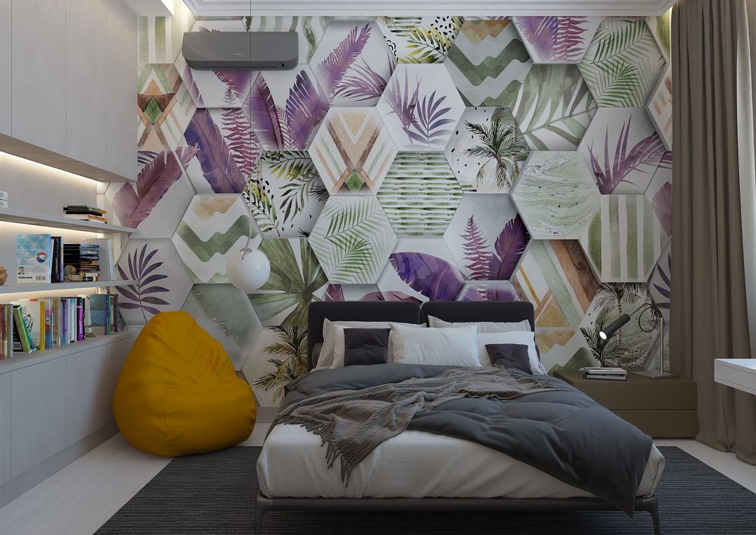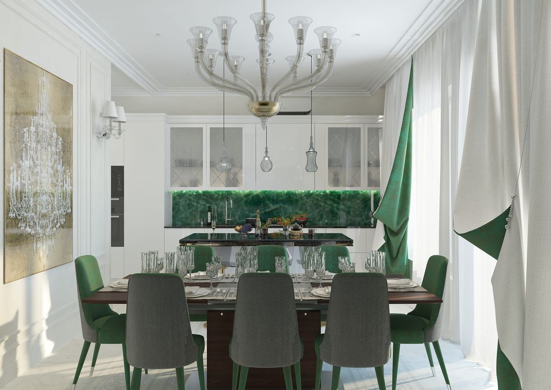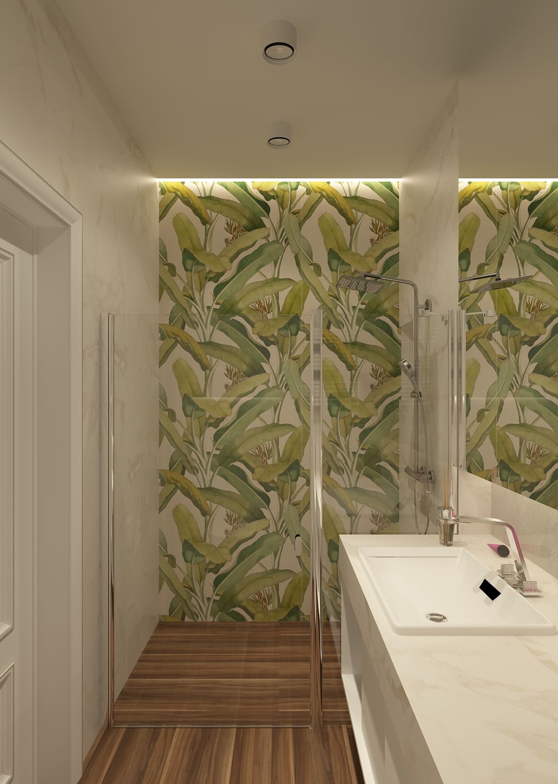 На полу кухни использован керамогранит с текстурой мрамора, который мы дополнили объемными декорами из той же коллекции. На стене — картина, специально написанная для этого проекта.