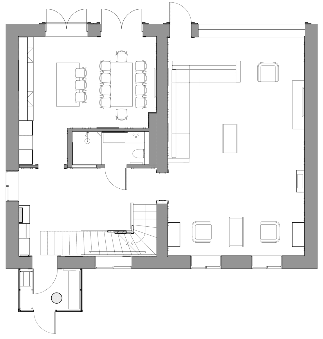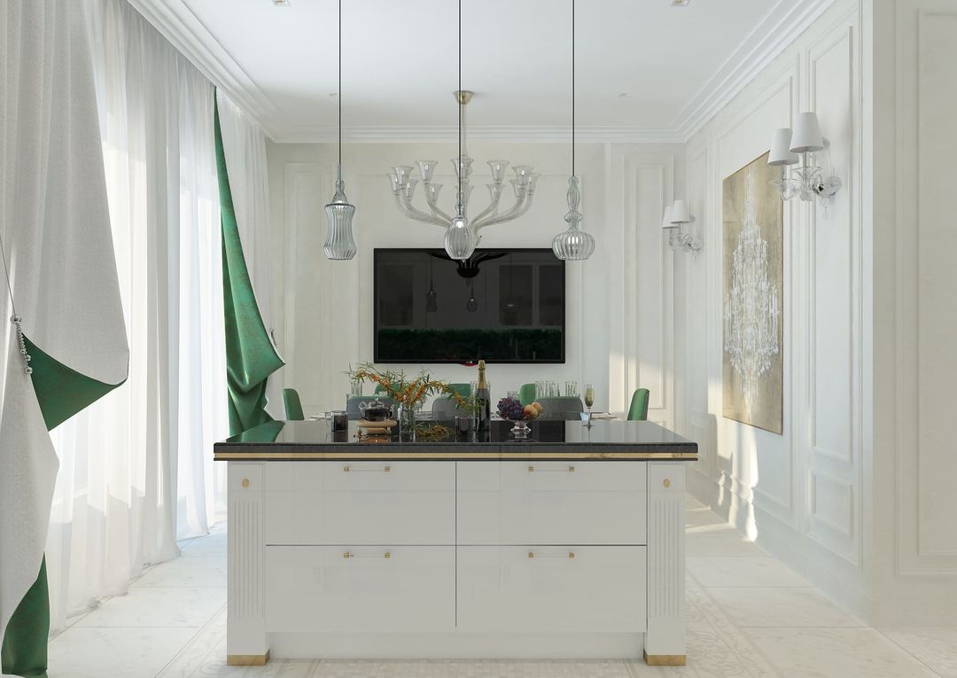 В результате перепланировки и работы над фасадами появились два больших окна в пол и возможность не только любоваться садом, но и выходить из дома сразу через кухню. Кухонное помещение стало просторным, светлым и пополнилось островом ( еще одна мечта хозяйки дома).