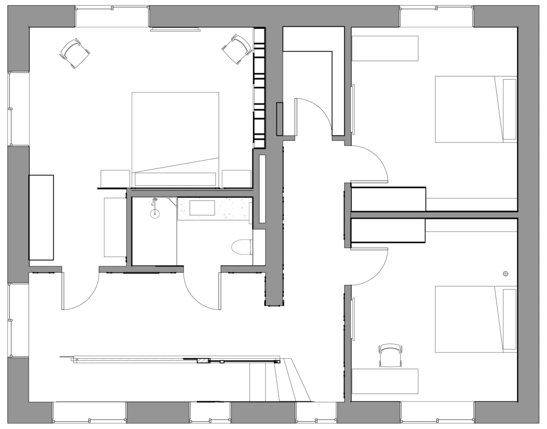 Второй этаж – жилой. Здесь расположены спальня родителей и две детские, которые теперь служат уже внукам. Раньше из спальни был проход в санузел с маленькой душевой зоной. Мы сделали вход в санузел из коридора, по-другому разместили мебель – в итоге и спальня, и санузел стали удобными и просторными.