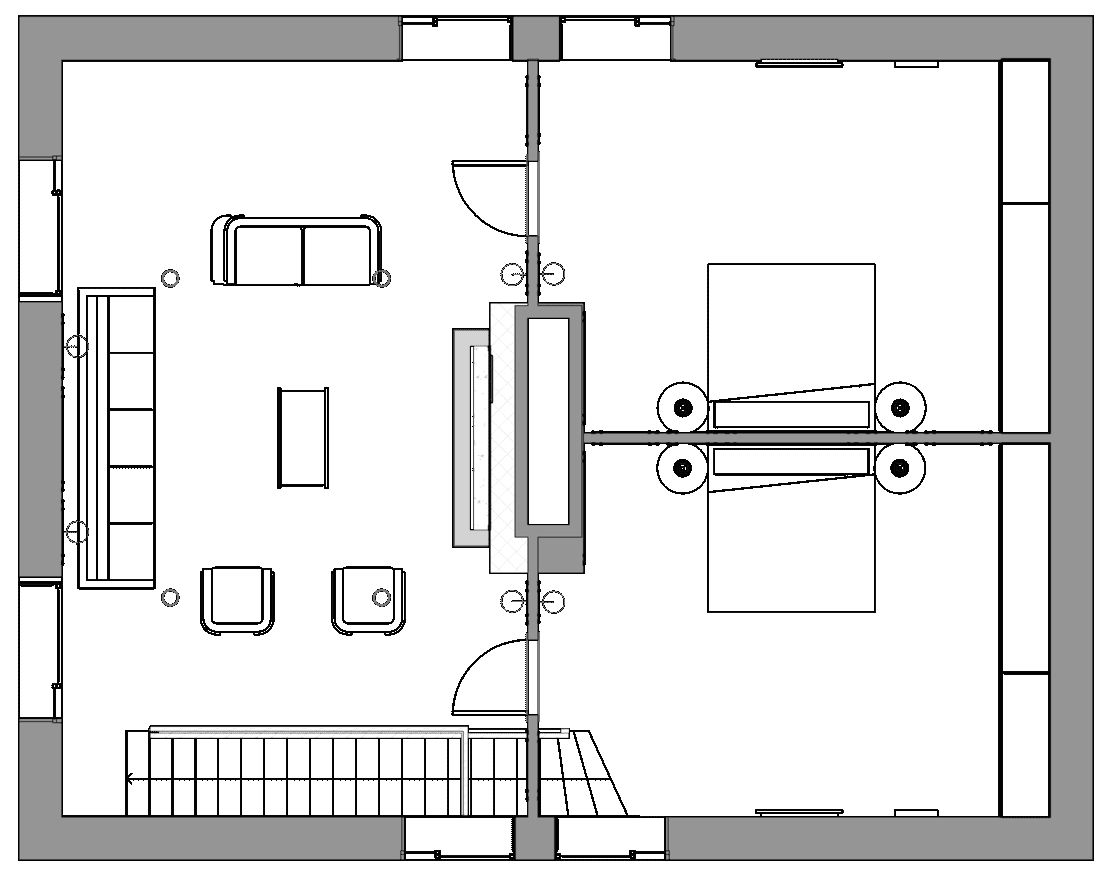 Мансардный этаж – гостевой. Тут расположены две гостевые комнаты и общее пространство с биокамином.