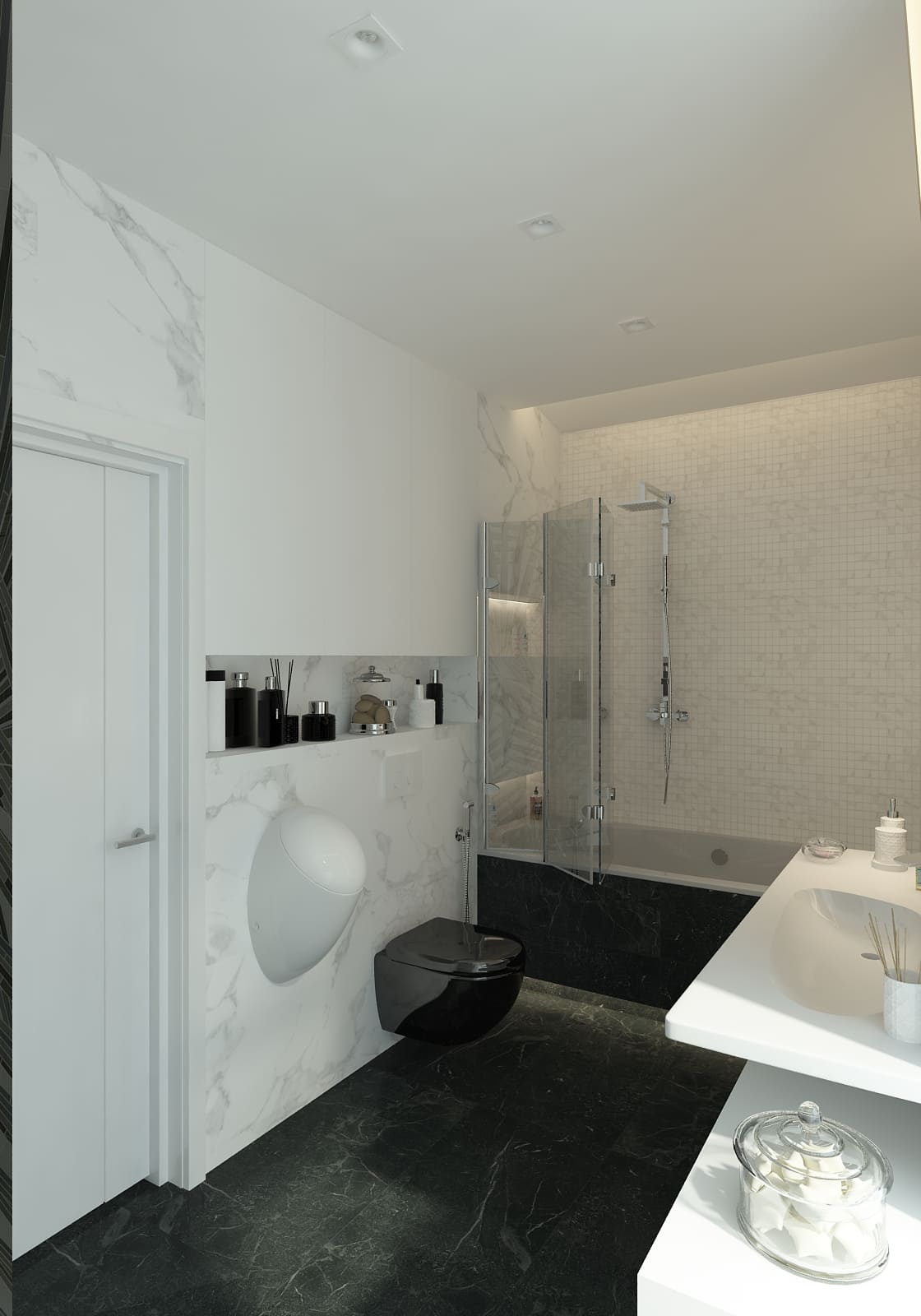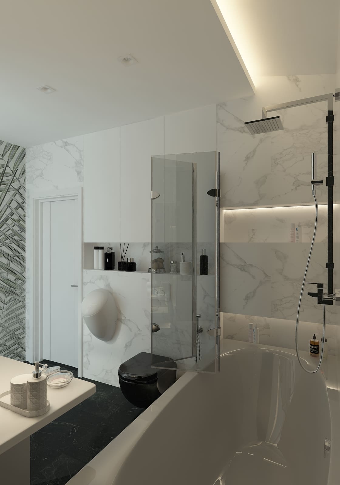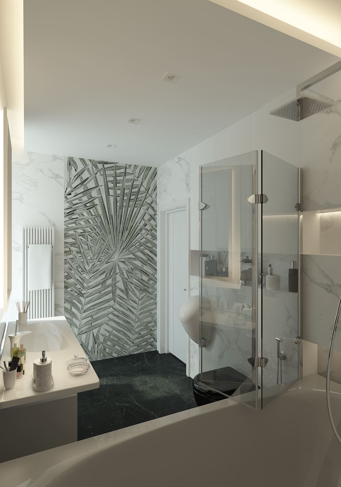 В оформлении ванной комнаты на втором этаже использован керамогранит с текстурой мрамора двух цветов в сочетании с цветочным декором на всю стену. Стена над ванной украшена мозаикой, а в зоне душевого гарнитура размещены ниши для мелочей.