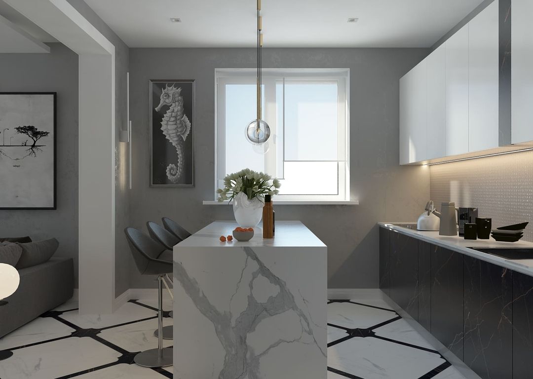 Кухня небольшая, поэтому пристенную зону мы дополнили функциональным островом: он увеличивает рабочую поверхность и позволяет перекусить на кухне, не сервируя стол в эркере.