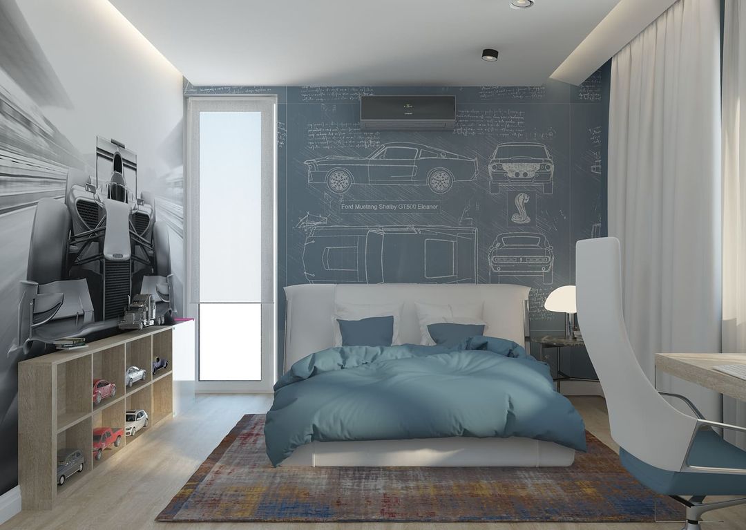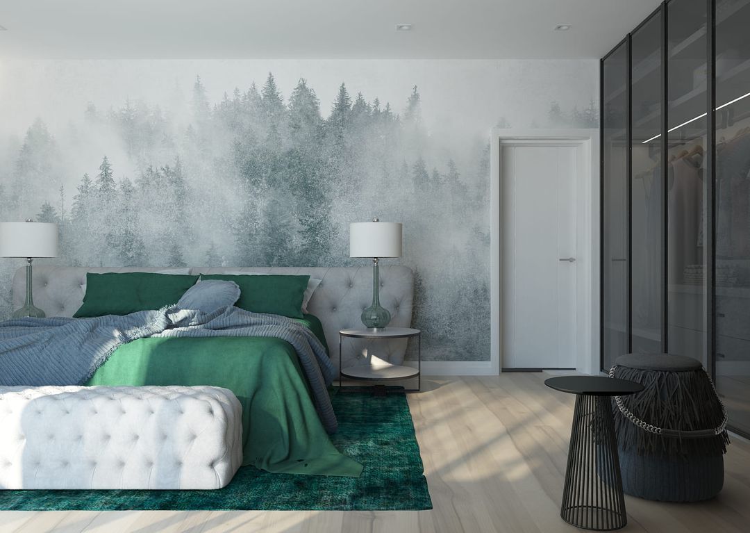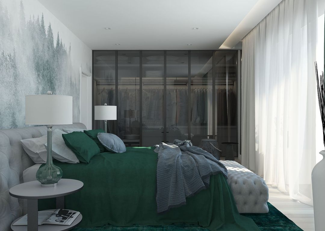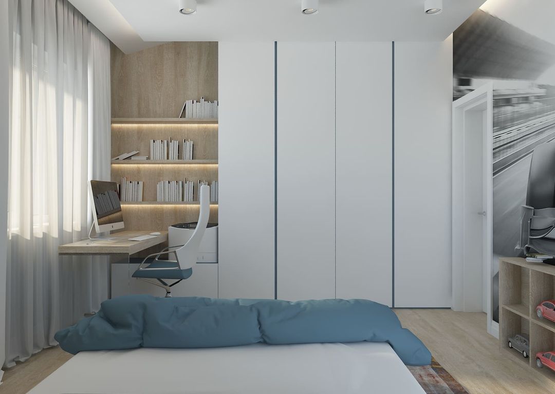 Окна спальни выходят на Дон, с террасы открывается чудесный вид. Он подсказал сюжет панно со стилизованным пейзажем в изголовье кровати. Слева при входе – система хранения на всю стену.