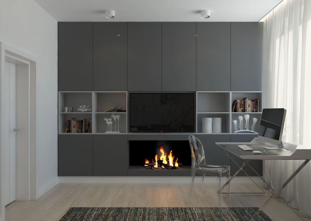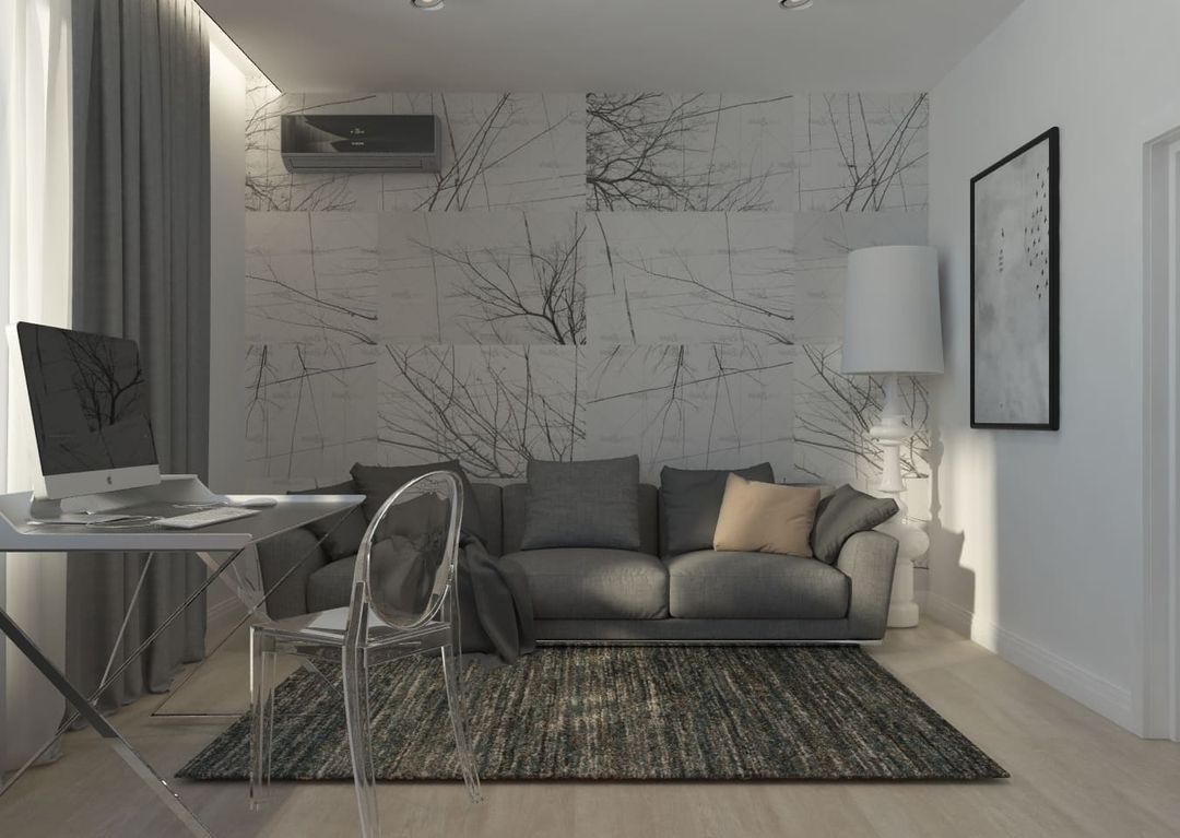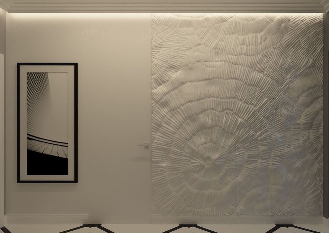 В гостиной стену в зоне ТВ украсило панно из керамогранита. Монохромный материал с разными фактурами создает цельность полотна и богатство рисунка.