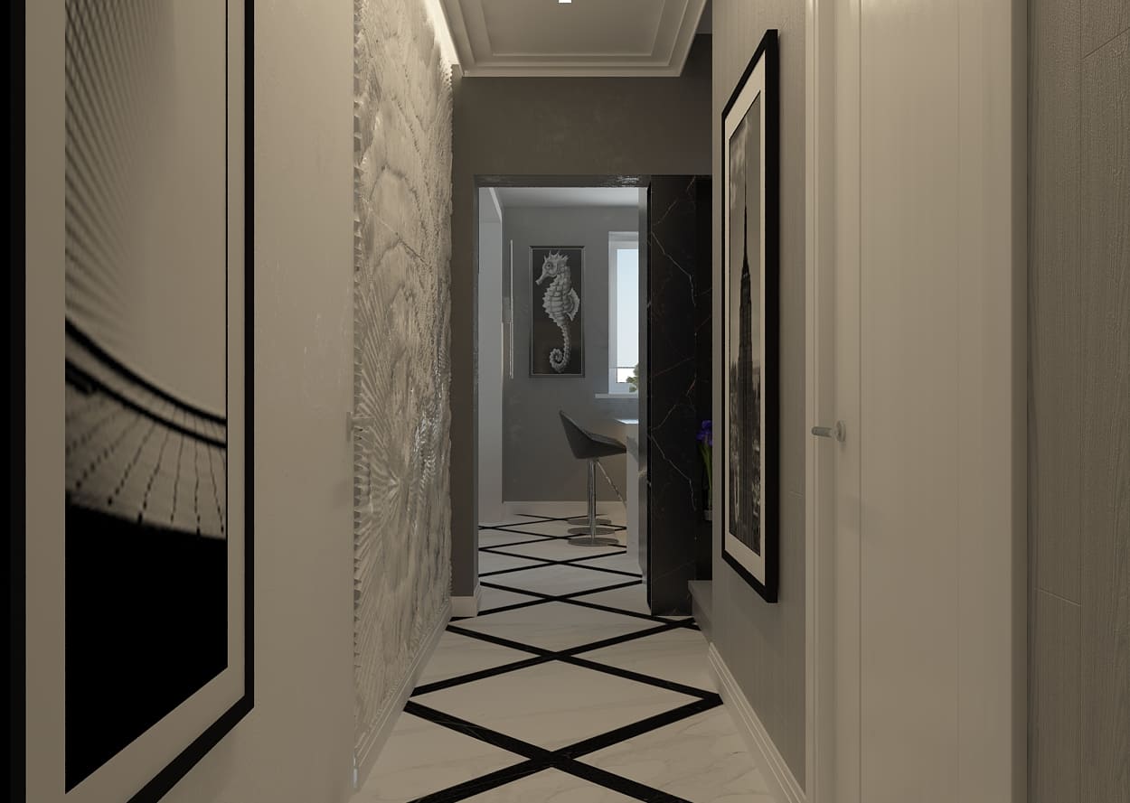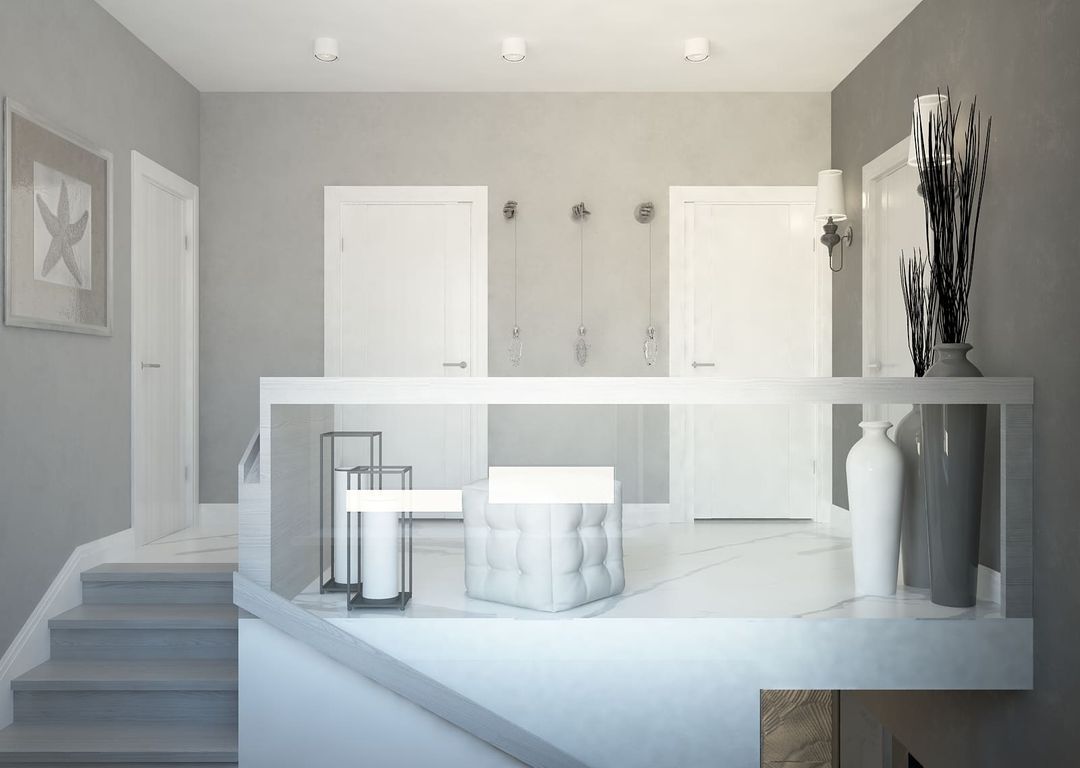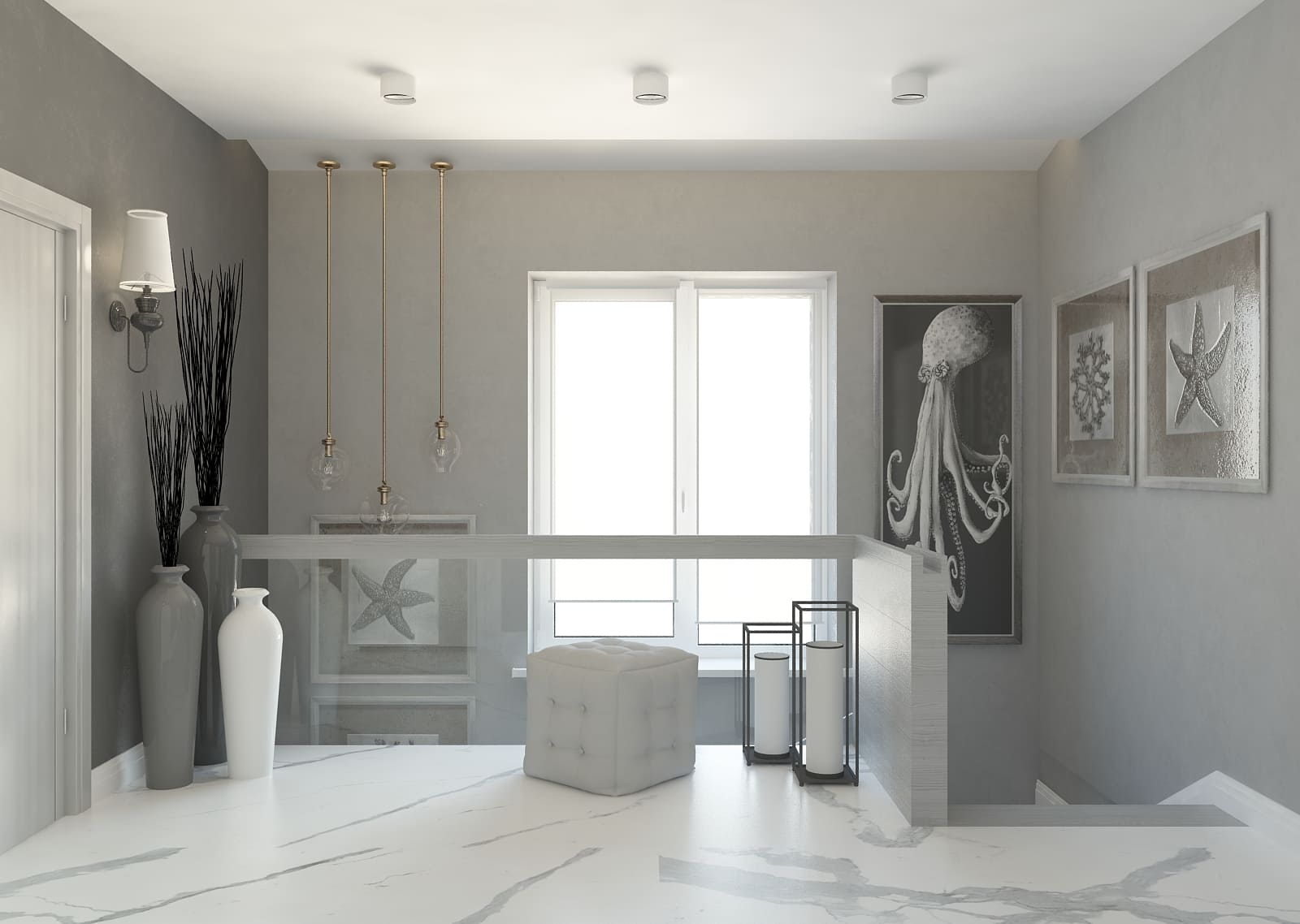 На стене в коридоре есть другое панно — гипсовое, с фантазийными мотивами, напоминающими древние окаменелости. Стены в холле второго этажа окрашены. Ограждение лестницы сделано из прозрачного стекла ради сохранения визуальной связи в помещении.