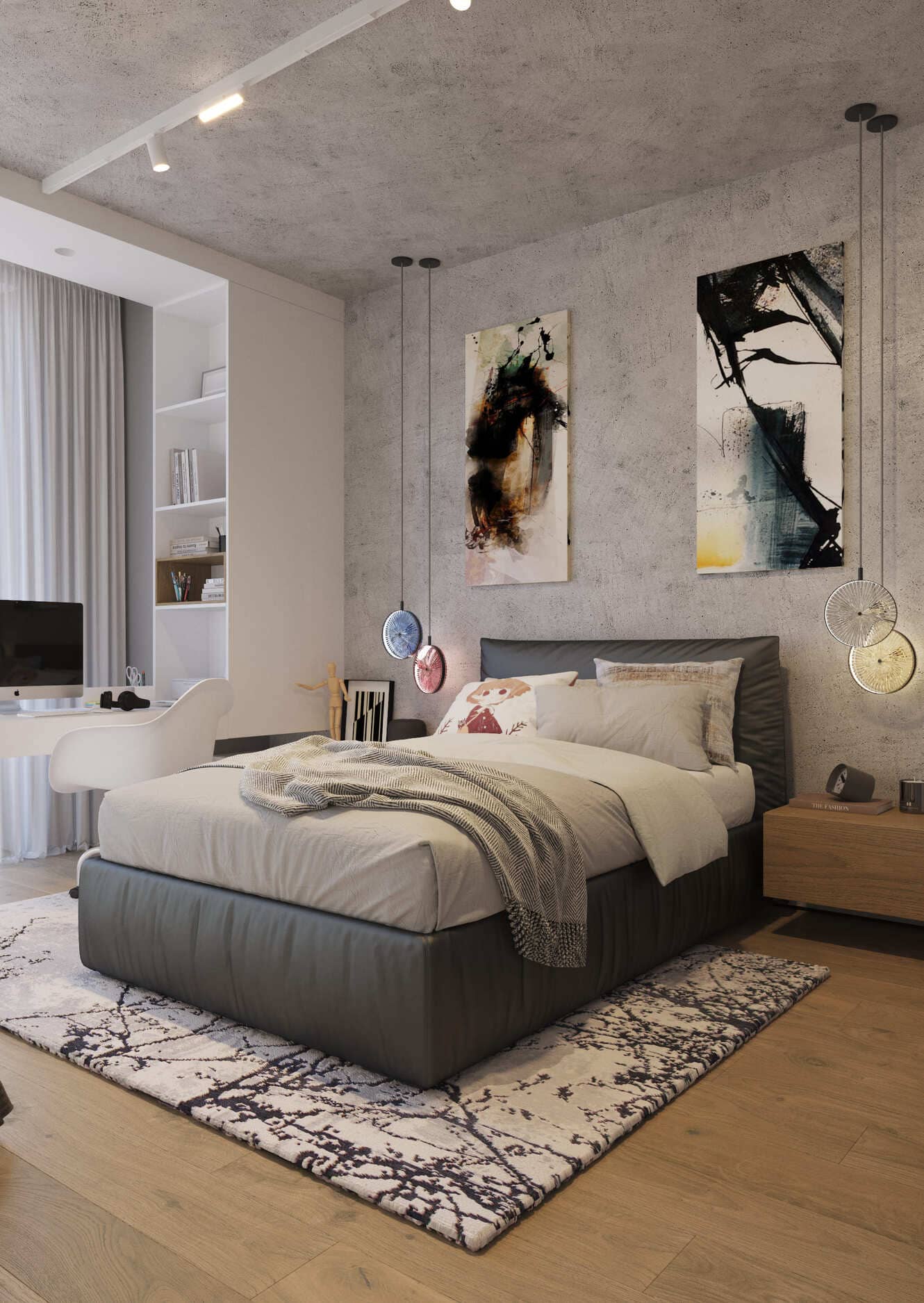 В детской старшей дочери для отделки стен использован декоративный кирпич с граффити, декоративное покрытие с текстурой бетона, а также большое зеркало в зоне подвесного шкафа. В детской младшей дочери цветом для мебели и части потолка был выбран сложный оттенок пыльной розы. В комнате также есть зеркала, панно и ламинат на стене, в месте примыкания кровати. В гостевом санузле размещены стиральная и сушильная машина и места хранения для хозяйственных принадлежностей.