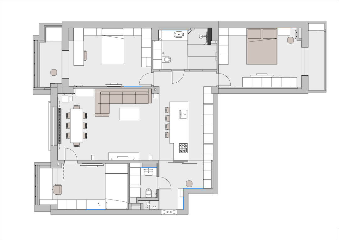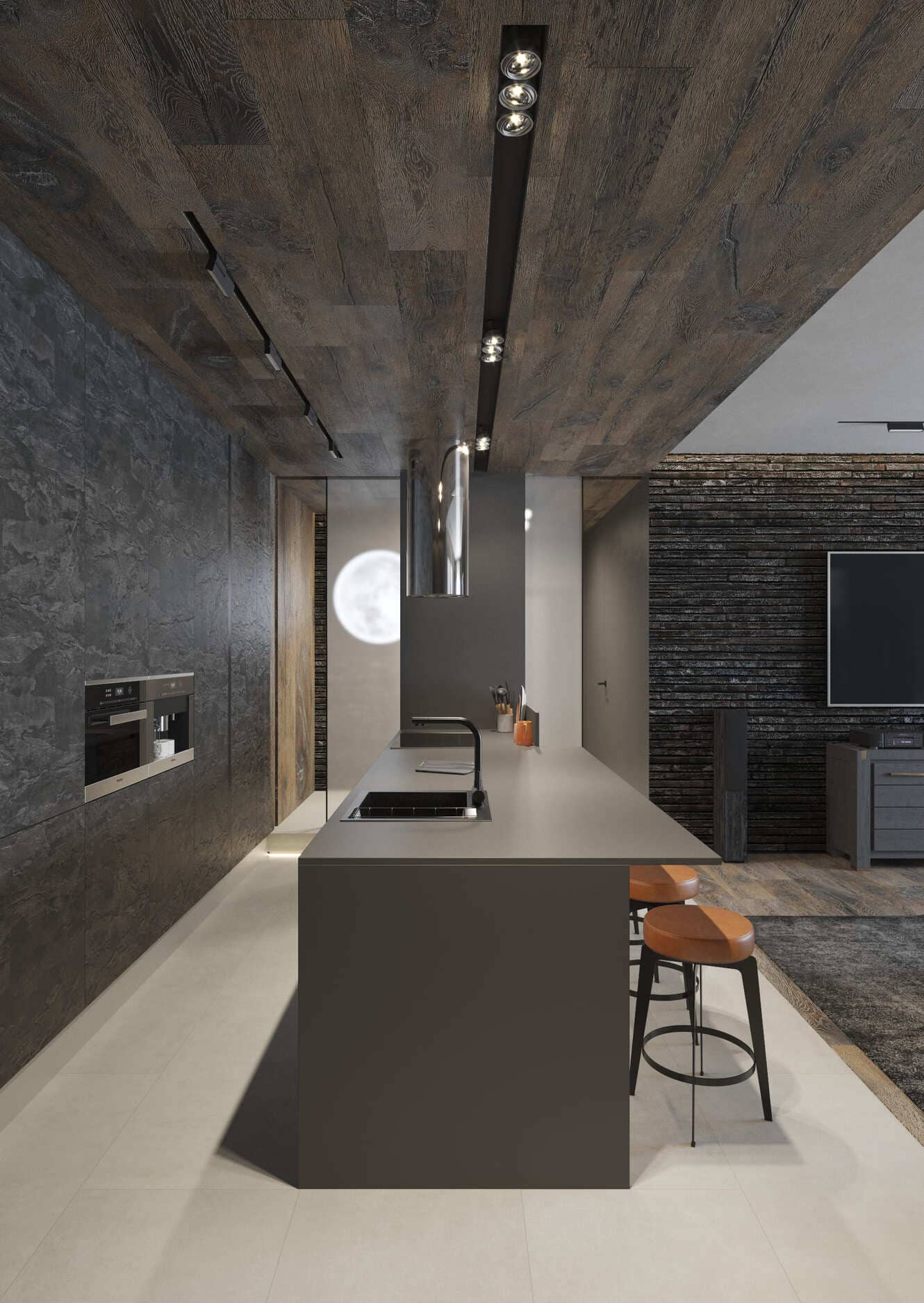 Дизайн-проект квартиры площадью 140 м2 в самом центре Ростова-на-Дону. Одной из главных особенностей проекта стало планировочное решение кухни-гостиной. В квартире был очень большой и широкий коридор, который нецелесообразно занимать помещением вроде гардеробной. Появилась идея объединить этот коридор с гостиной, а кухню разместить на площади бывшего коридора.