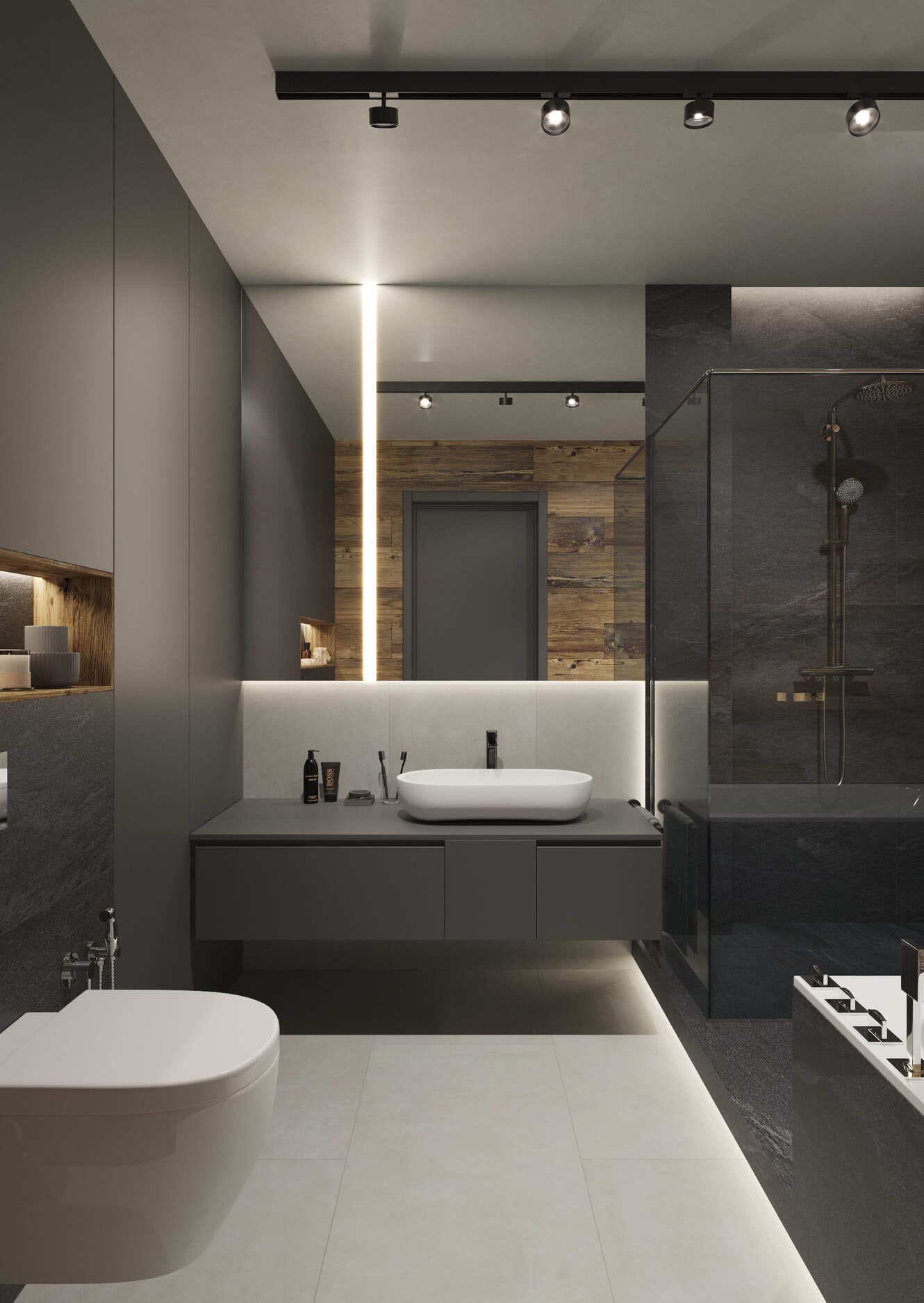 В ванной комнате площадью около 12 м2 над и справа от инсталляции организованы места хранения, размещены бойлер, бак для воды; здесь же есть доступ к общедомовым коммуникациям. Справа от входа -подиум, на котором размещены ванна и просторная душевая зона. Подиум – решение не только эстетическое, но и техническое: он обеспечил проводку коммуникаций.