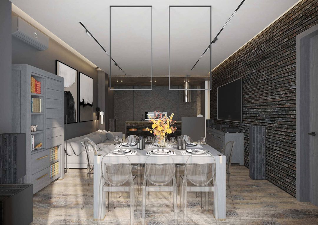 Дизайн-проект квартиры площадью 140 м2 в самом центре Ростова-на-Дону. Одной из главных особенностей проекта стало планировочное решение кухни-гостиной. В квартире был очень большой и широкий коридор, который нецелесообразно занимать помещением вроде гардеробной. Появилась идея объединить этот коридор с гостиной, а кухню разместить на площади бывшего коридора.