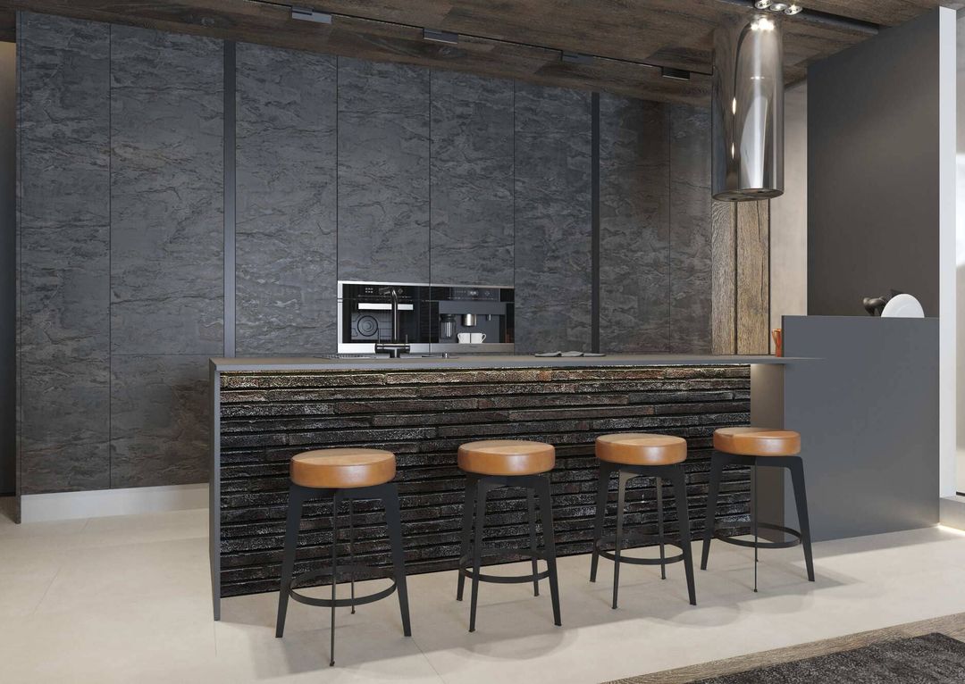 В итоге мы получили очень просторную кухню-гостиную и полноценную кухню с большим объемом хранения и островом. Зону столовой мы разместили у самого витража, и теперь от острова кухни открывается прекрасный вид на город. Пеналы кухни отделаны натуральным сланцем, а перегородка между кухней и прихожей — тем же акриловым камнем, что и столешница острова.