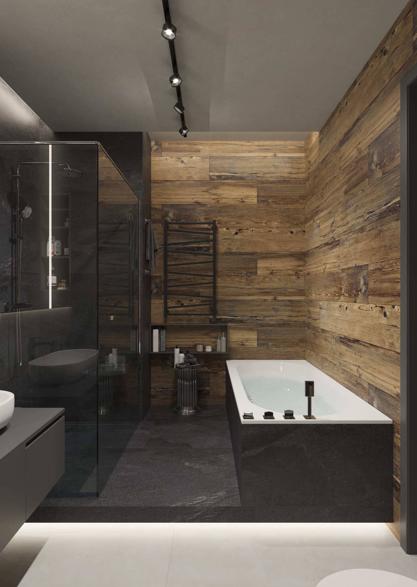 В ванной комнате площадью около 12 м2 над и справа от инсталляции организованы места хранения, размещены бойлер, бак для воды; здесь же есть доступ к общедомовым коммуникациям. Справа от входа -подиум, на котором размещены ванна и просторная душевая зона. Подиум – решение не только эстетическое, но и техническое: он обеспечил проводку коммуникаций.