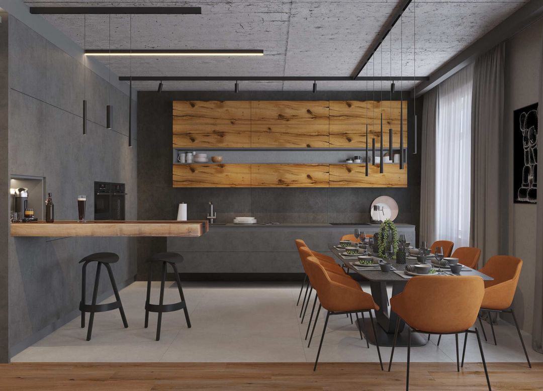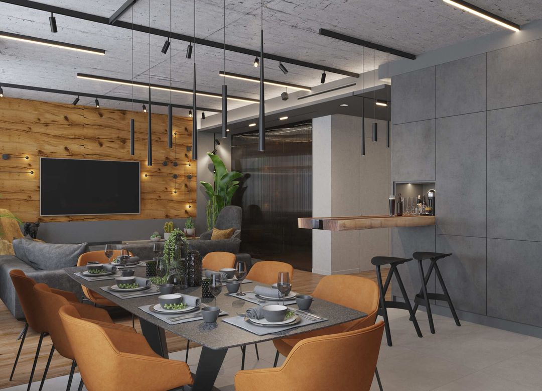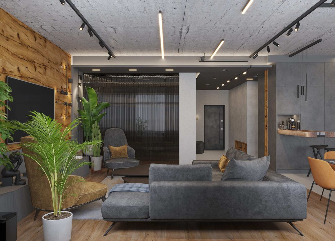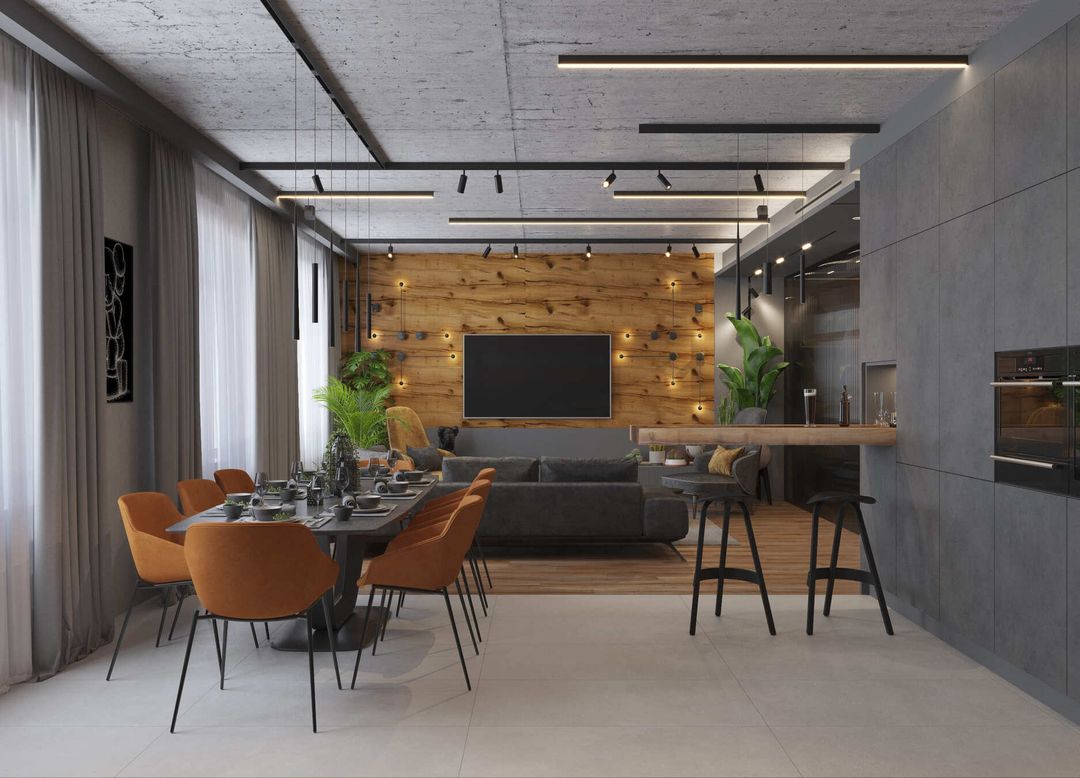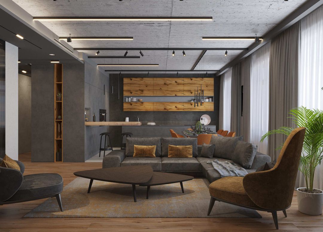 Это один из немногих проектов, где в кухне — гостиной оставлено бетонное перекрытие в качестве потолка, а освещение реализовано с помощью накладных трековых и профильных светильников.