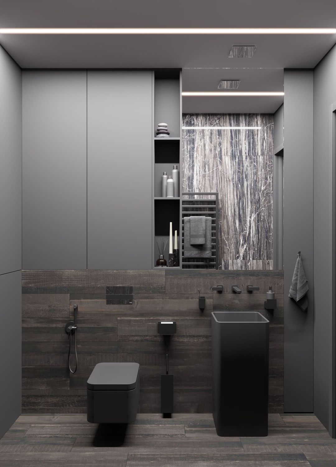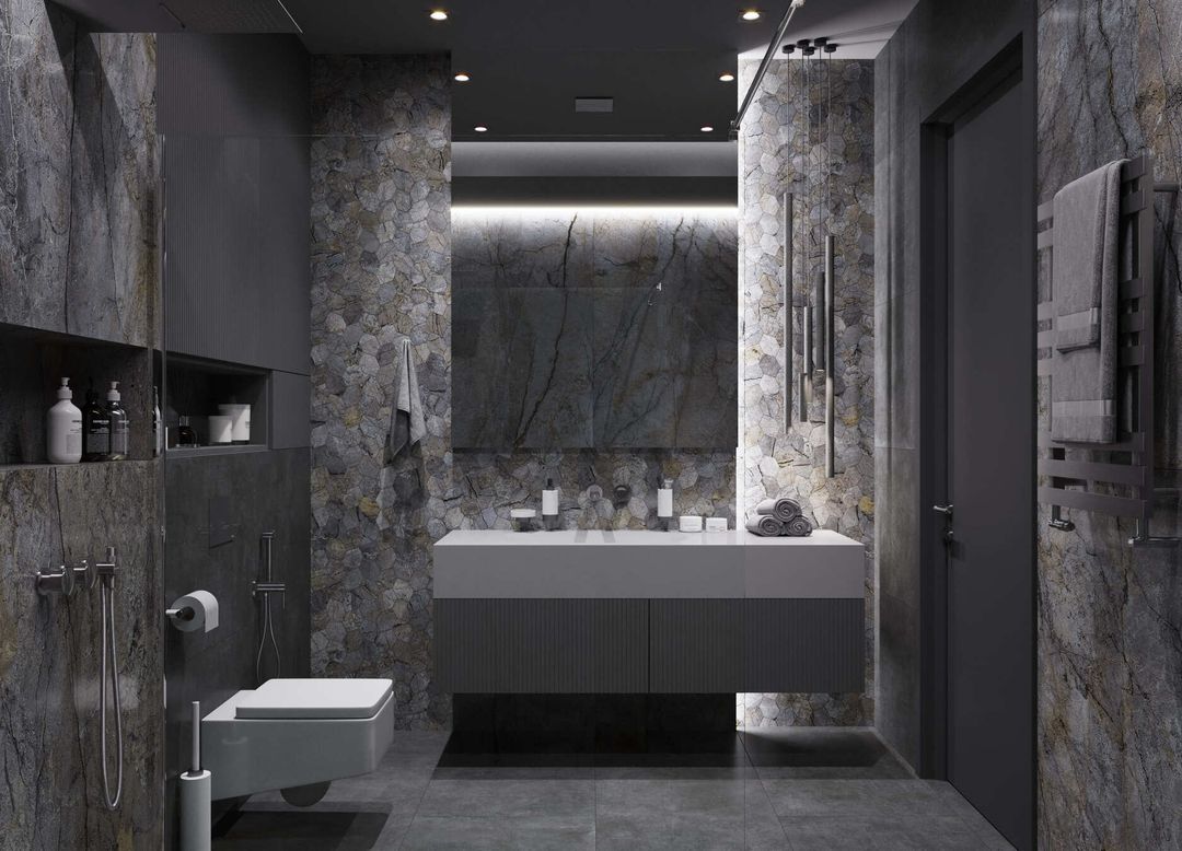 Тема природных текстур продолжена и в ванной комнате: на стенах керамогранит с текстурой натурального камня, в зоне зеркала тот же материал, но в виде мозаики необычного формата.