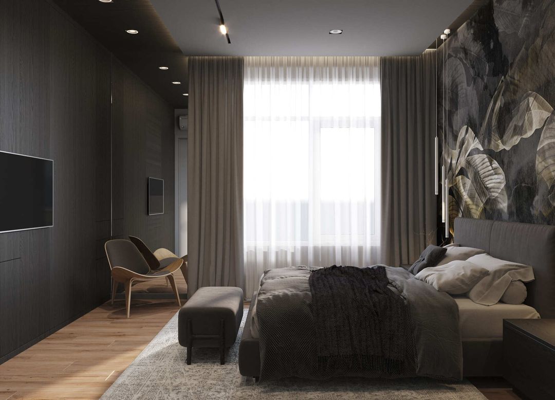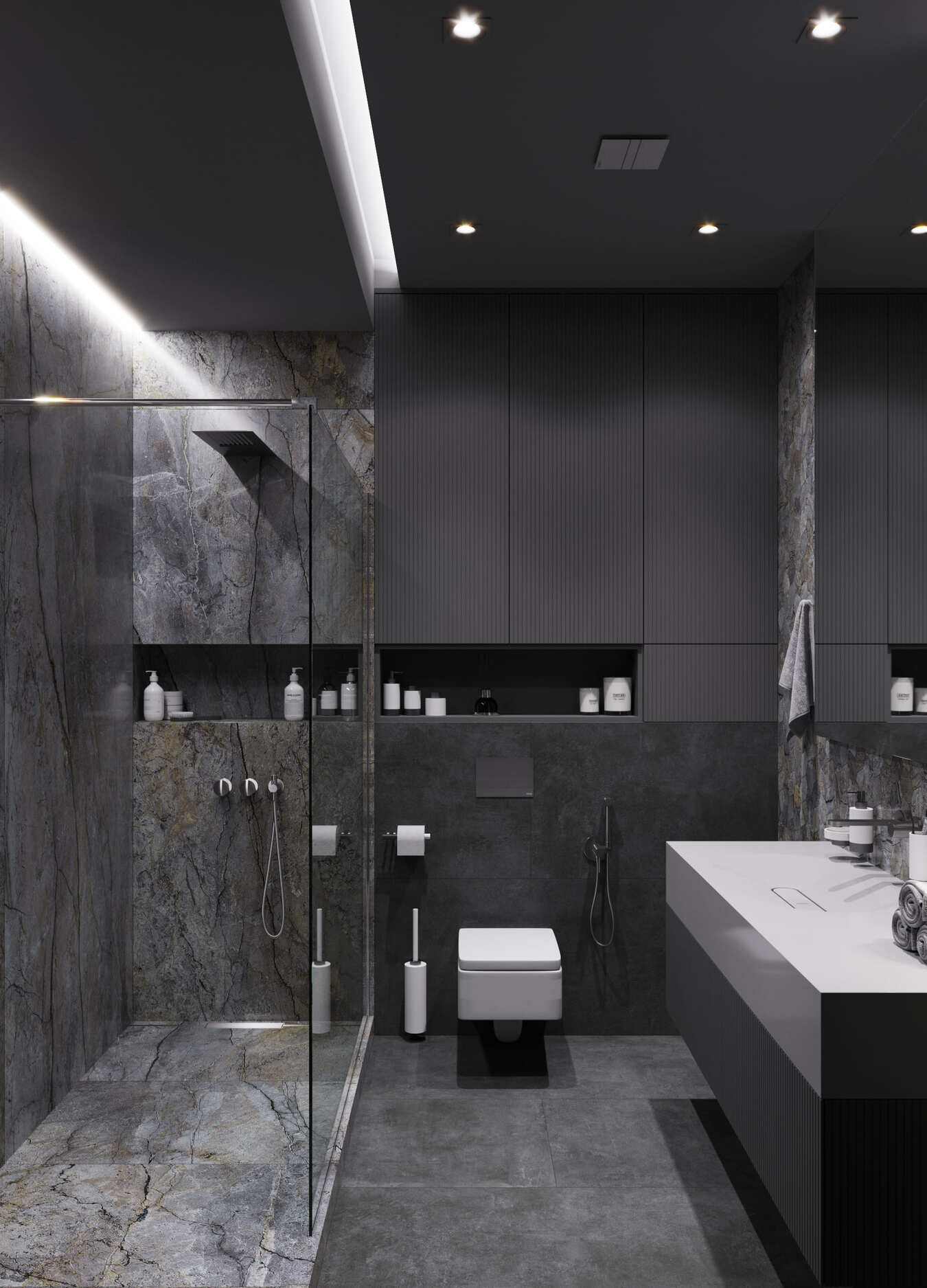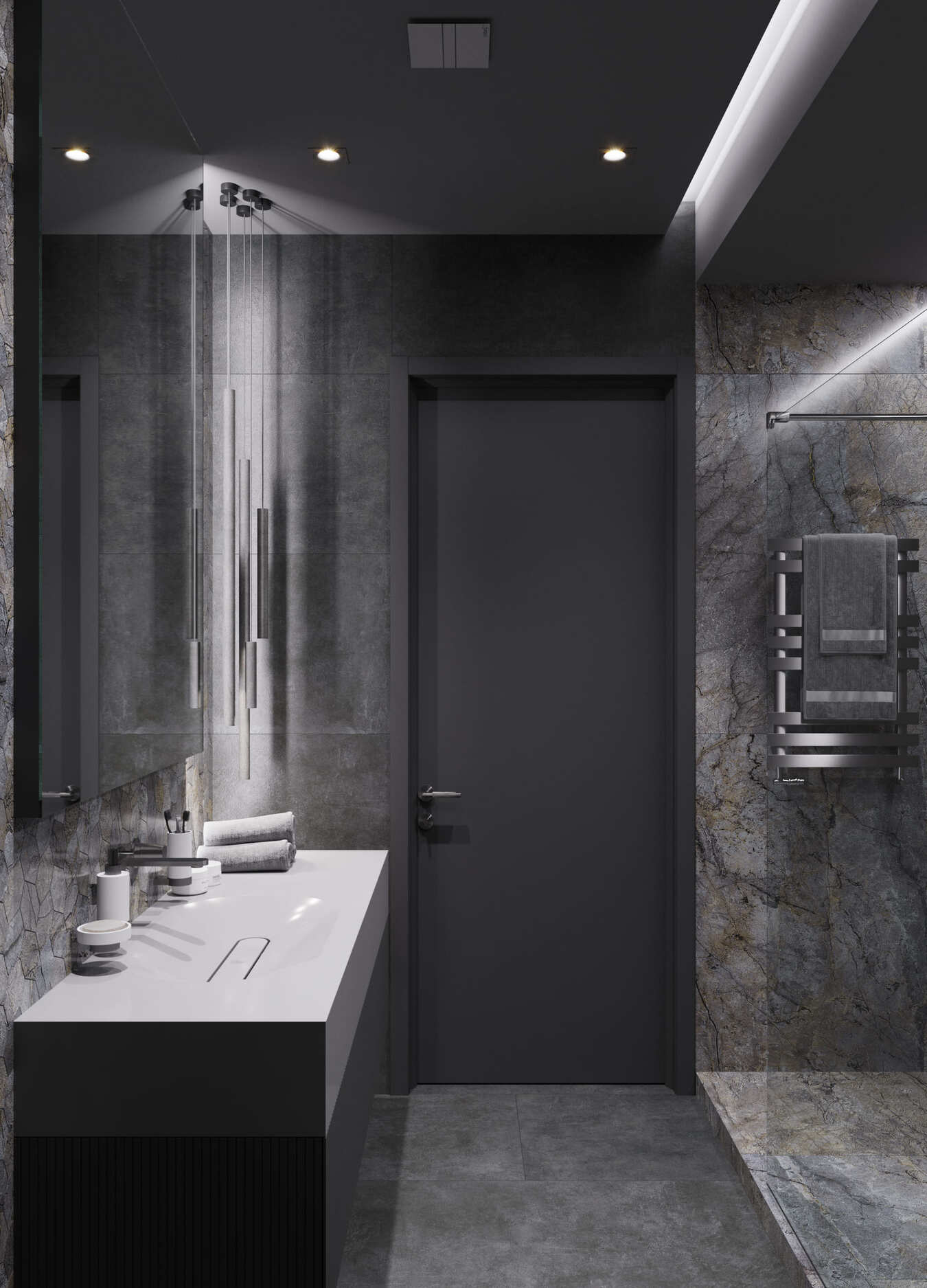 В приватной зоне размещены спальня родителей, детская и ванная комната. В ванной комнате мы спроектировали огромную душевую зону формата walk-in, а также тумбу с широкой раковиной и местами хранения над унитазом. В спальне огромный шкаф скрыт за телевизором и фрезерованными фасадами.