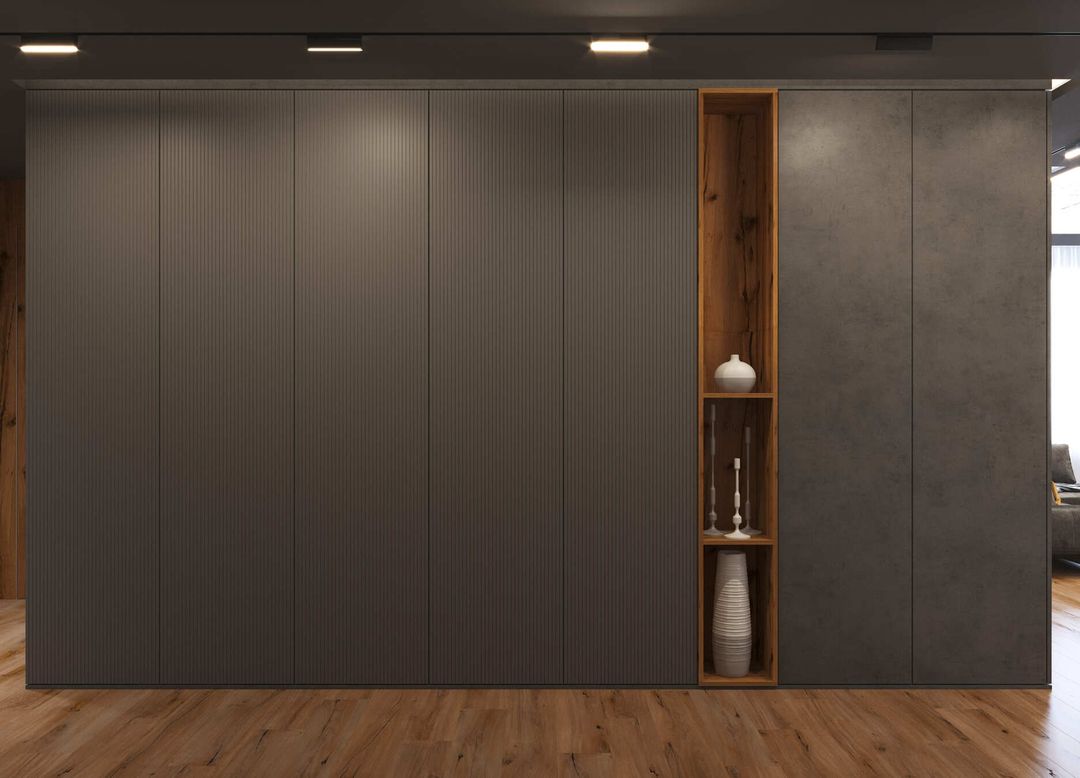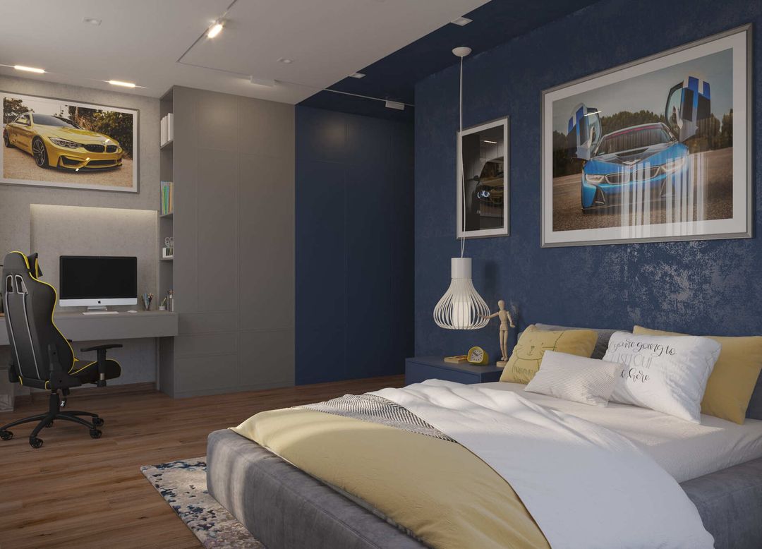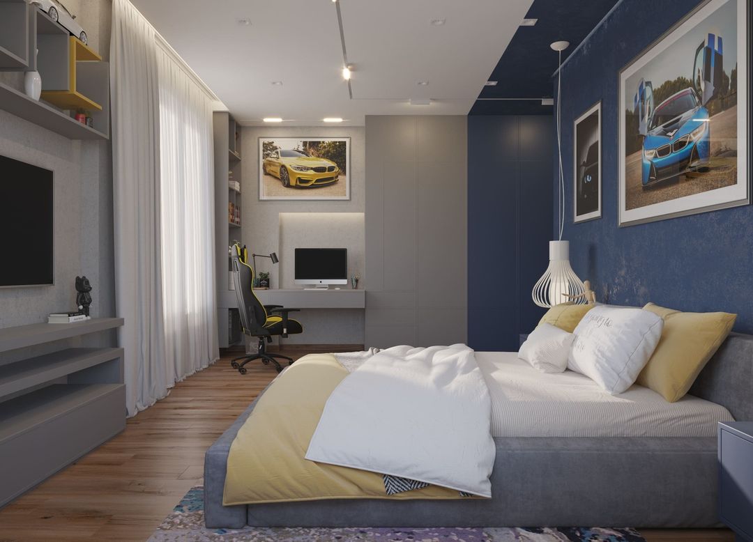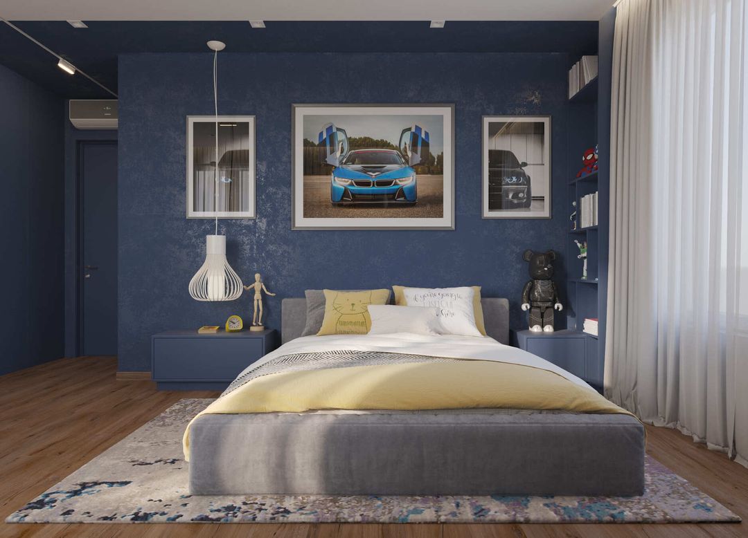 Большую роль в оформлении комнаты сыграли увлечения сына заказчиков: он коллекционирует фигурки Kaws и модели машин. Для хранения коллекций в зоне телевизора мы разработали декоративные полки, а фотографии любимых автомобилей украсили стены.