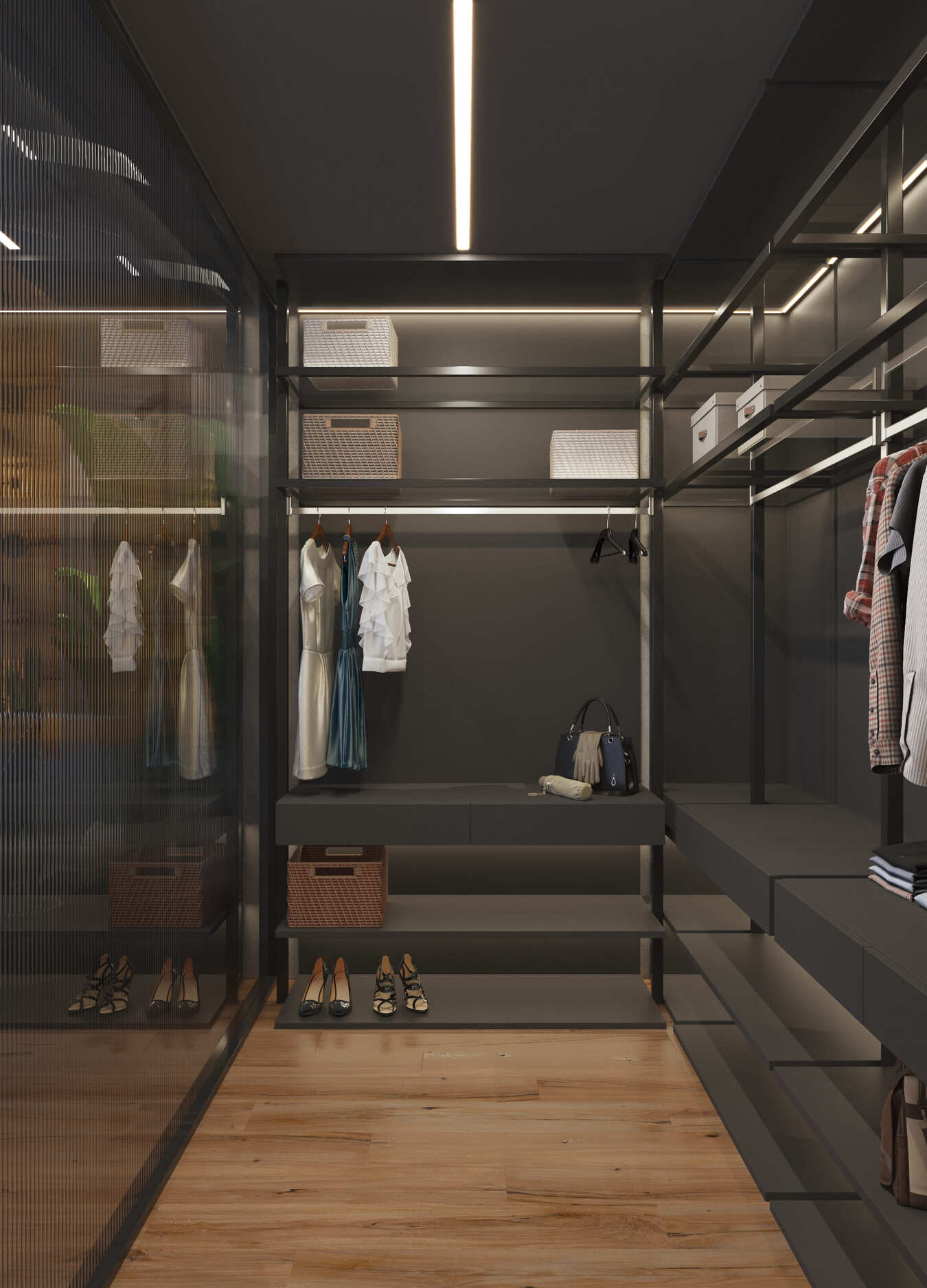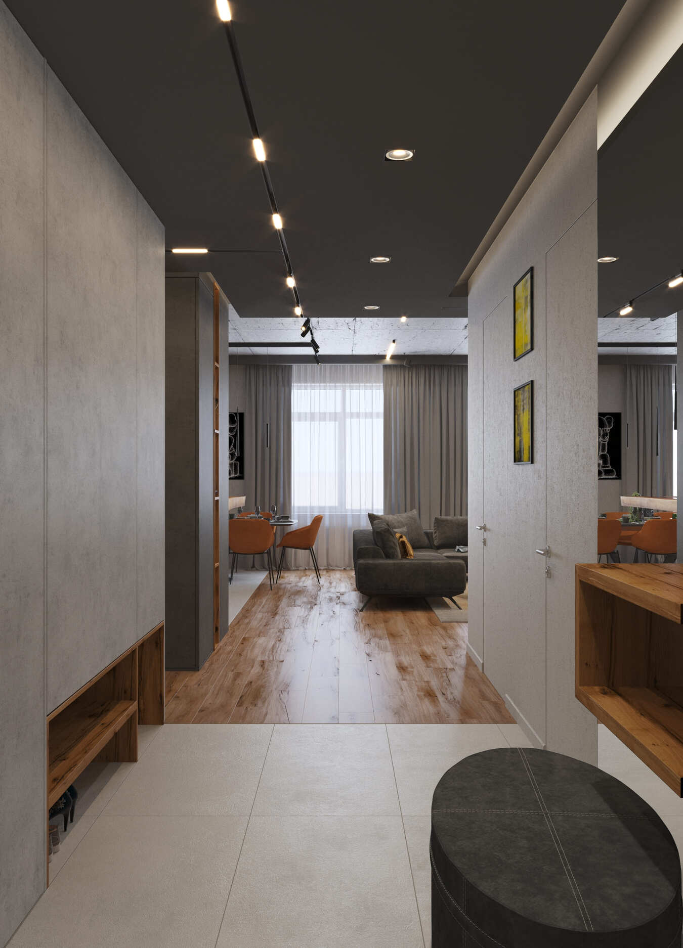 Проект разработан для квартиры площадью 140 м2 в непосредственной близости от набережной реки Дон. Часть окон выходит на реку, остальные — во двор. Квартира состоит из кухни-гостиной, ванной, двух спален, гостевого санузла и стеклянной гардеробной при входе в квартиру.